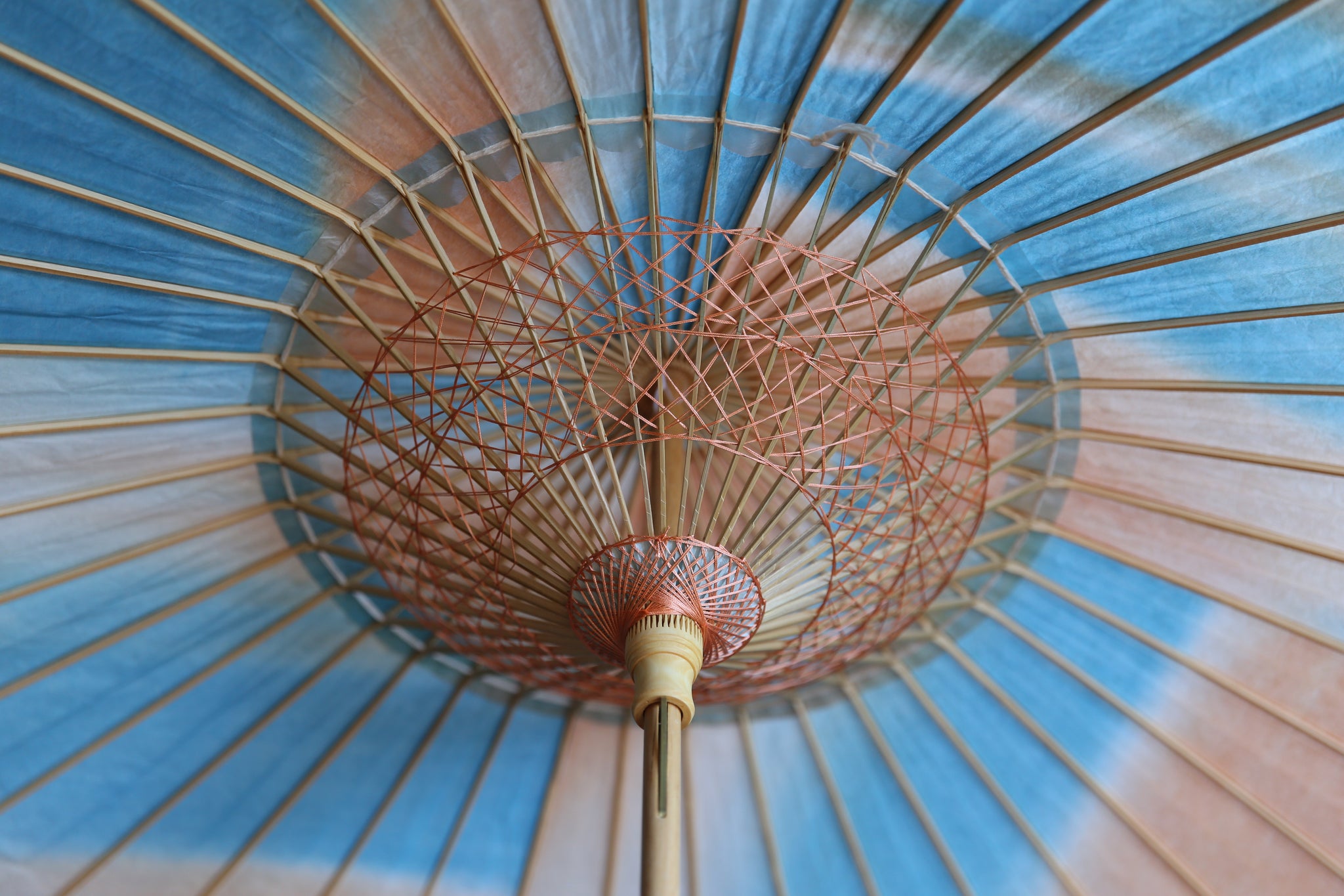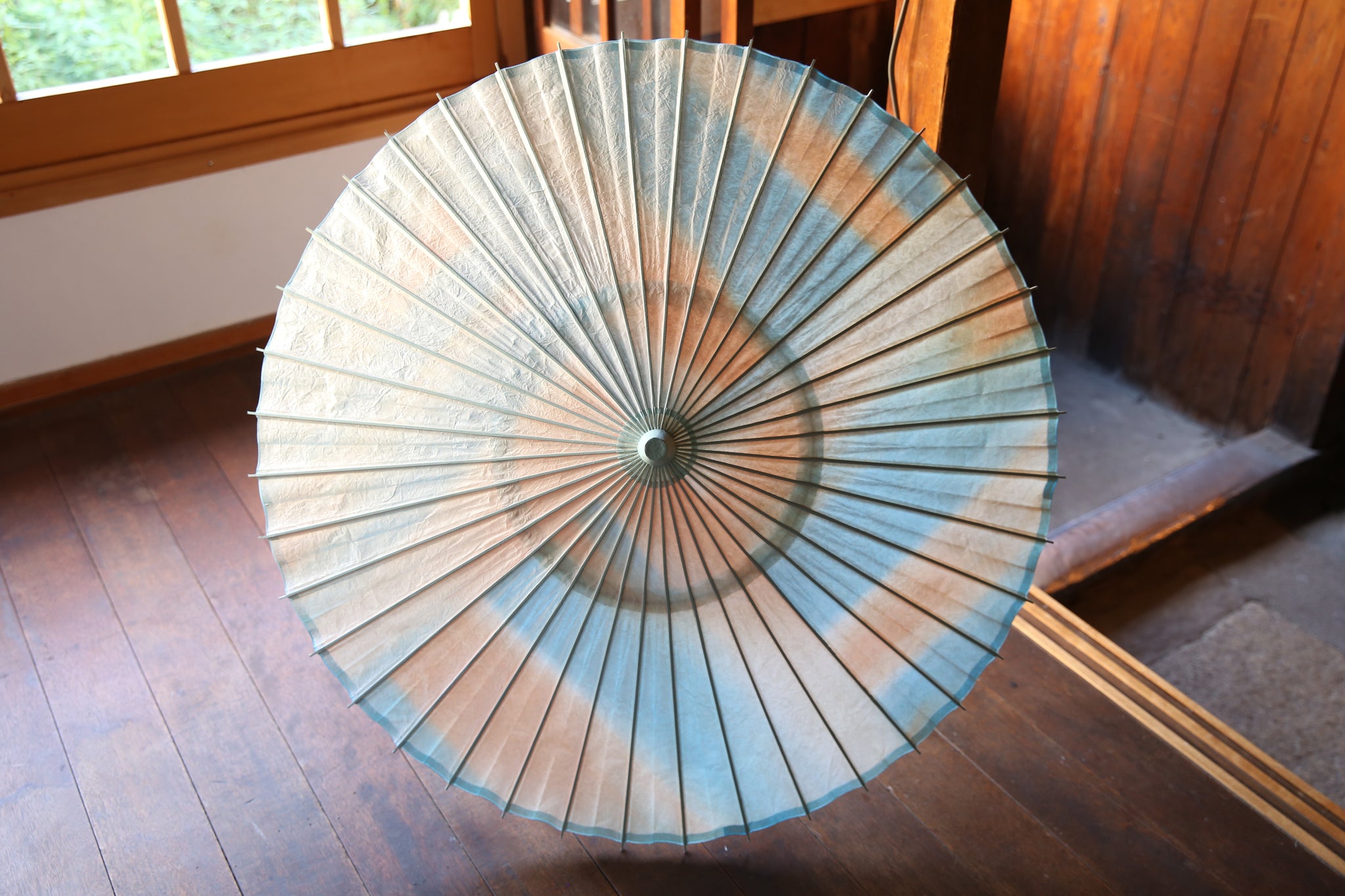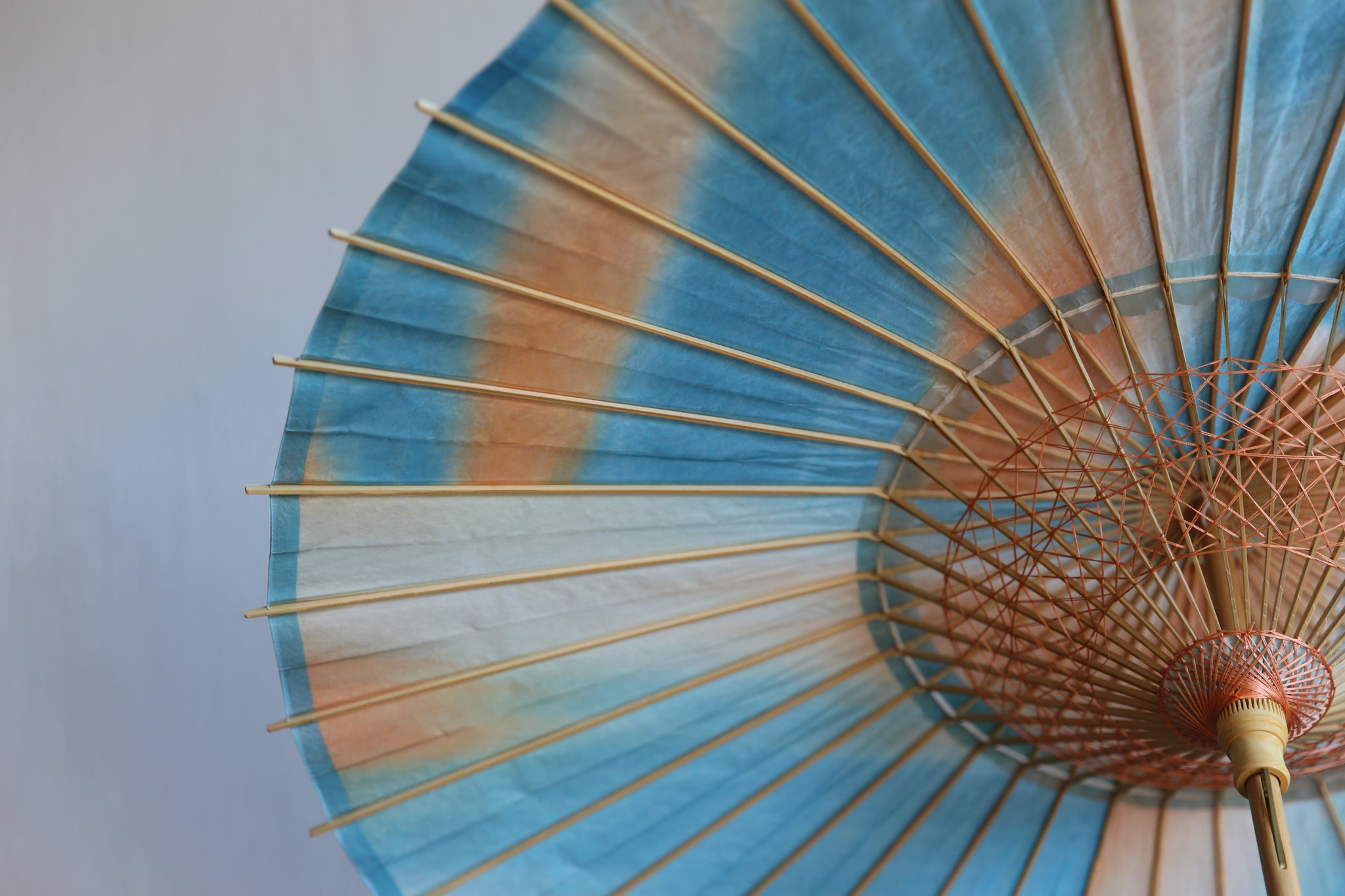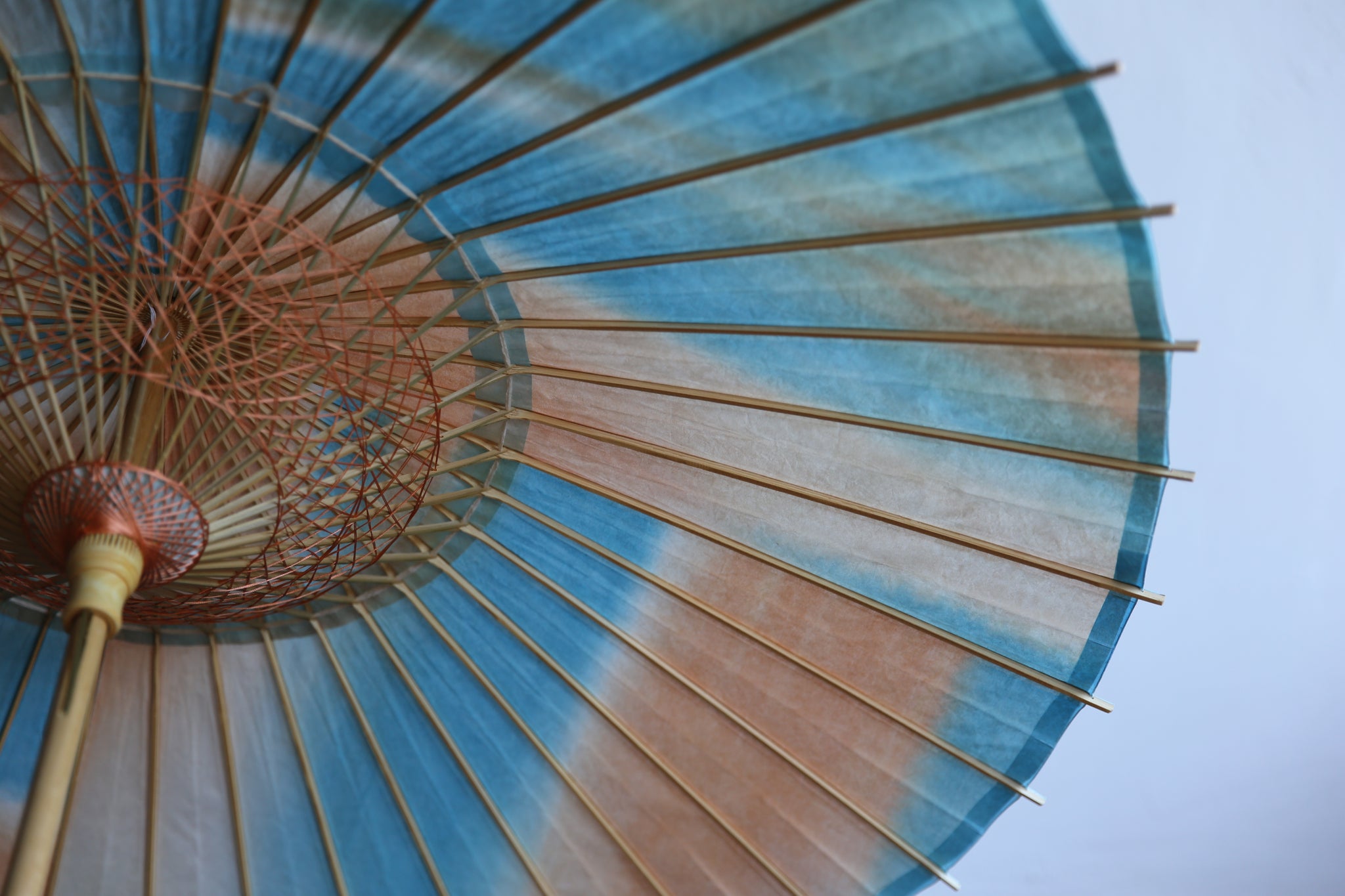 オレンジ×ブルーで染めた和紙の上に、揉んでしわ加工を施した白い胡粉の和紙を重ねた二重張りの日傘です。