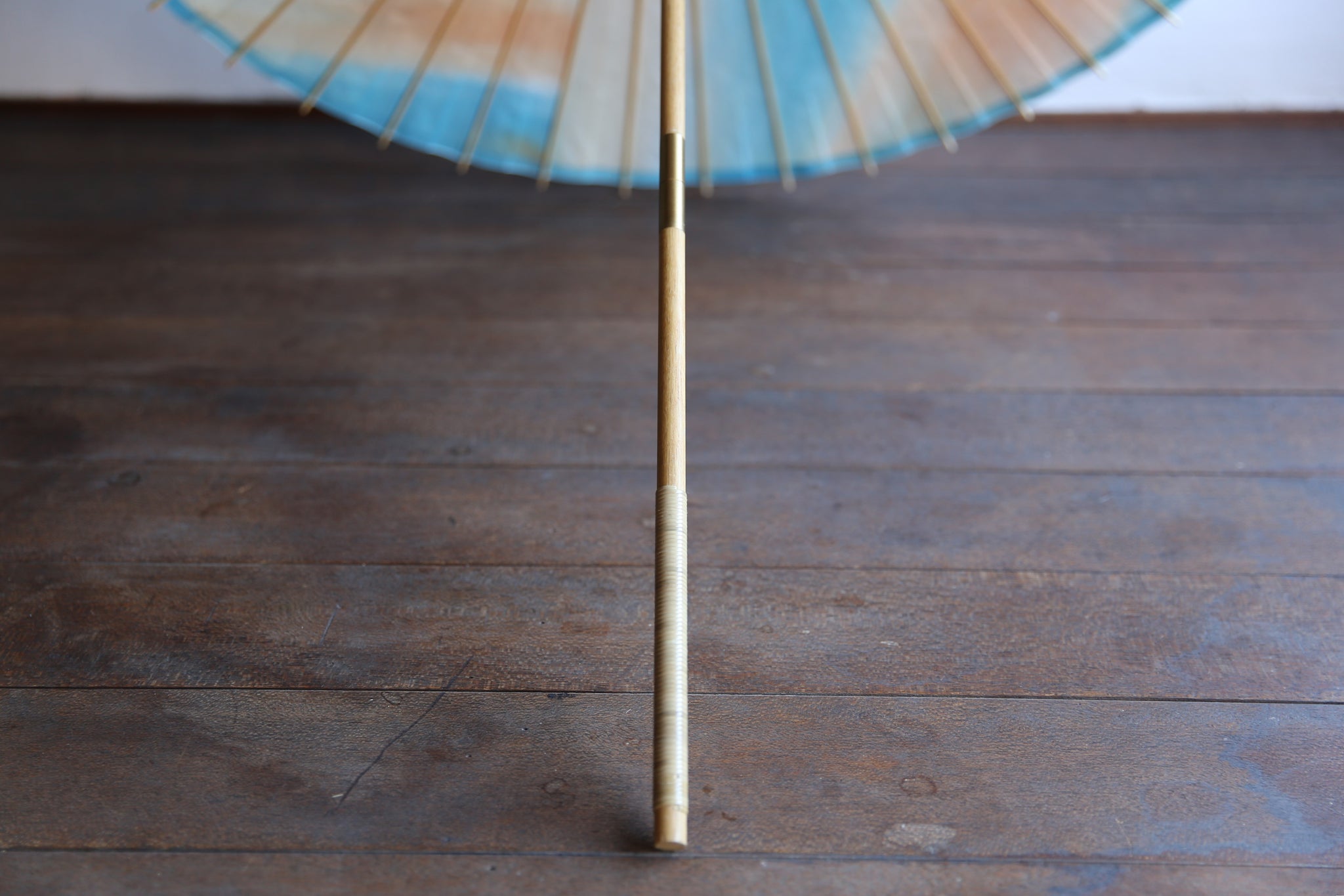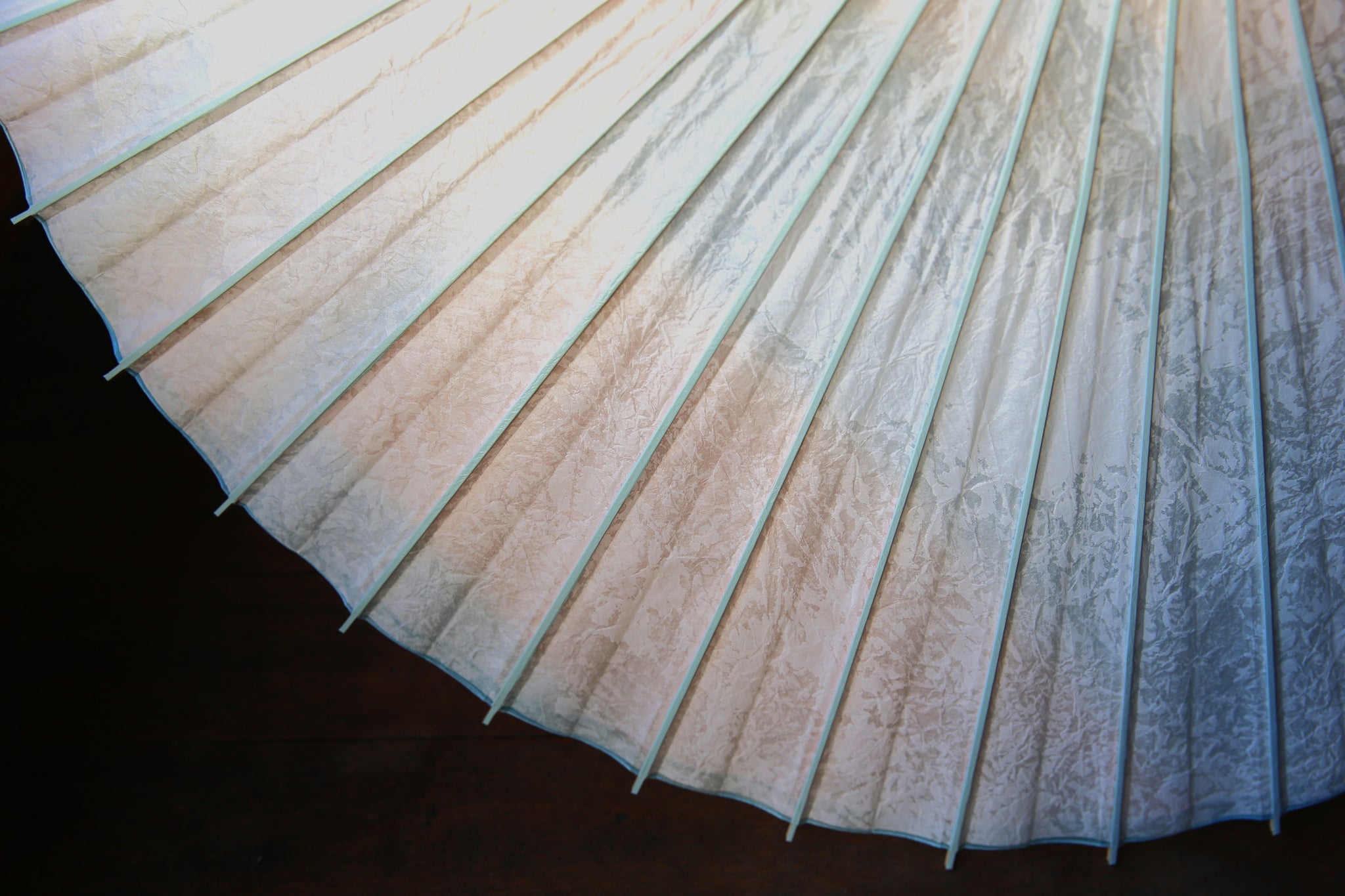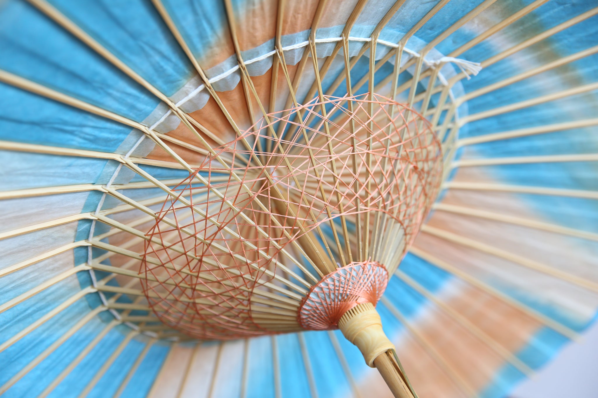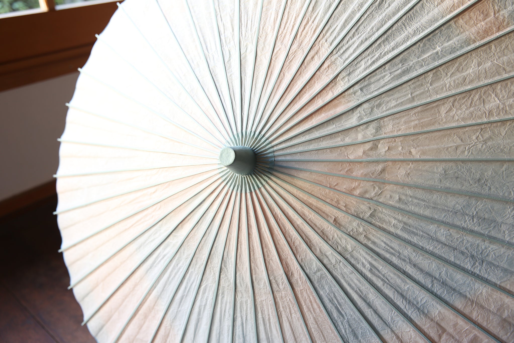 オレンジ×ブルーで染めた和紙の上に、揉んでしわ加工を施した白い胡粉の和紙を重ねた二重張りの日傘です。