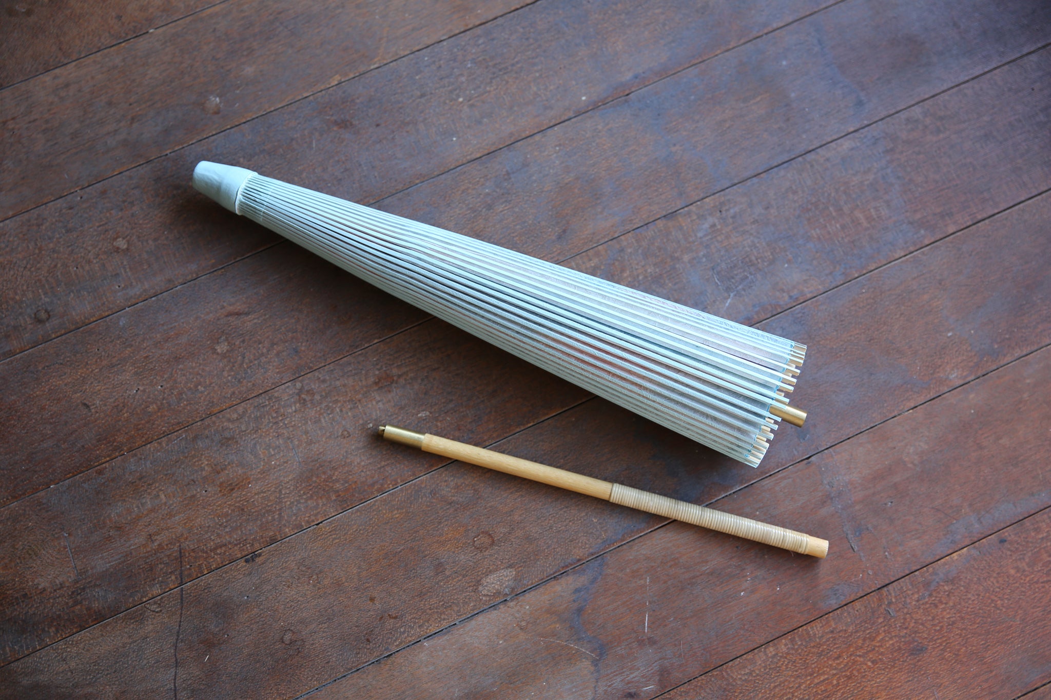 和傘の骨組みは、1本の竹を均等に割り、傘を畳んだ際に元の竹に戻るように組まれています。