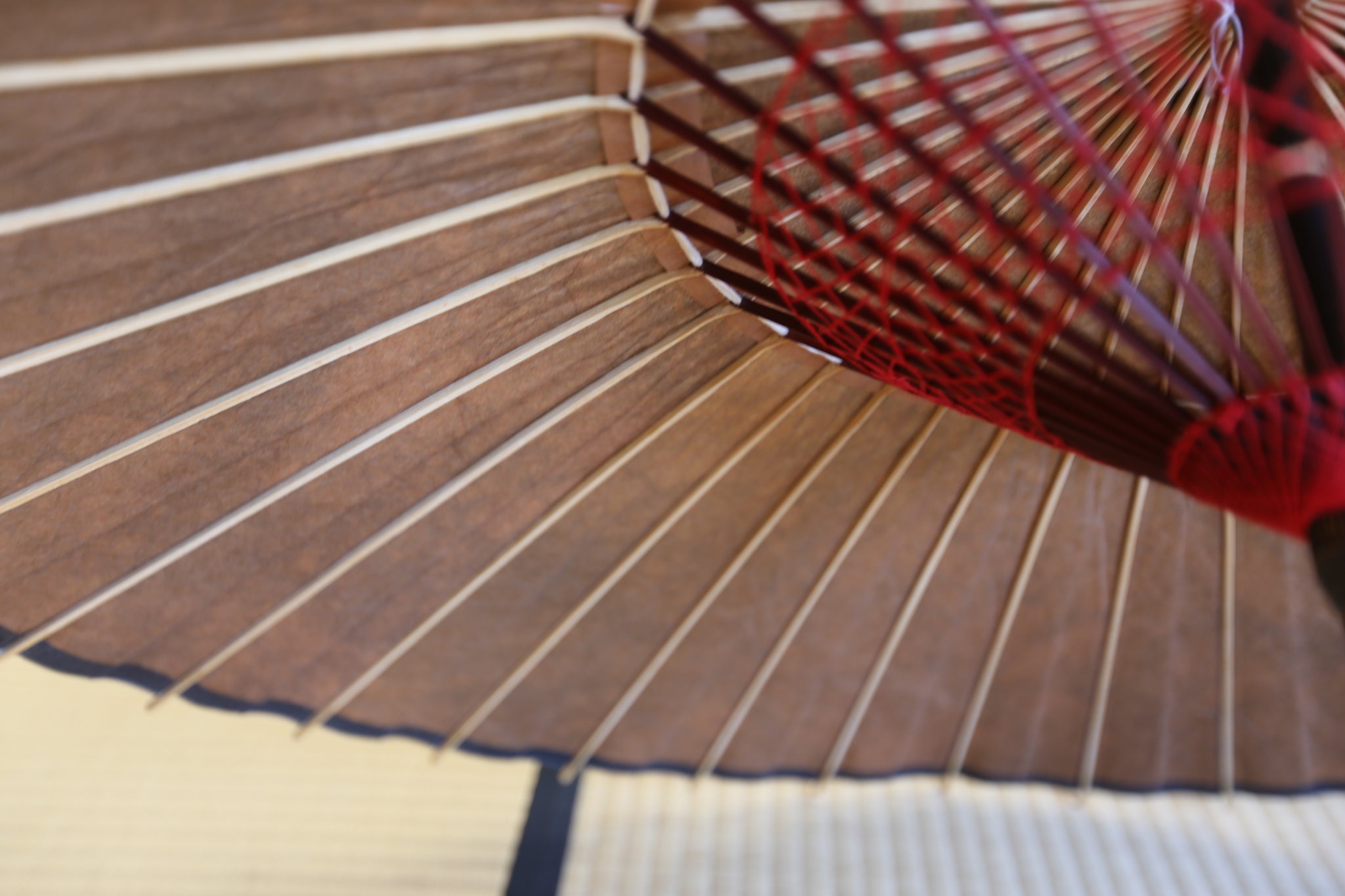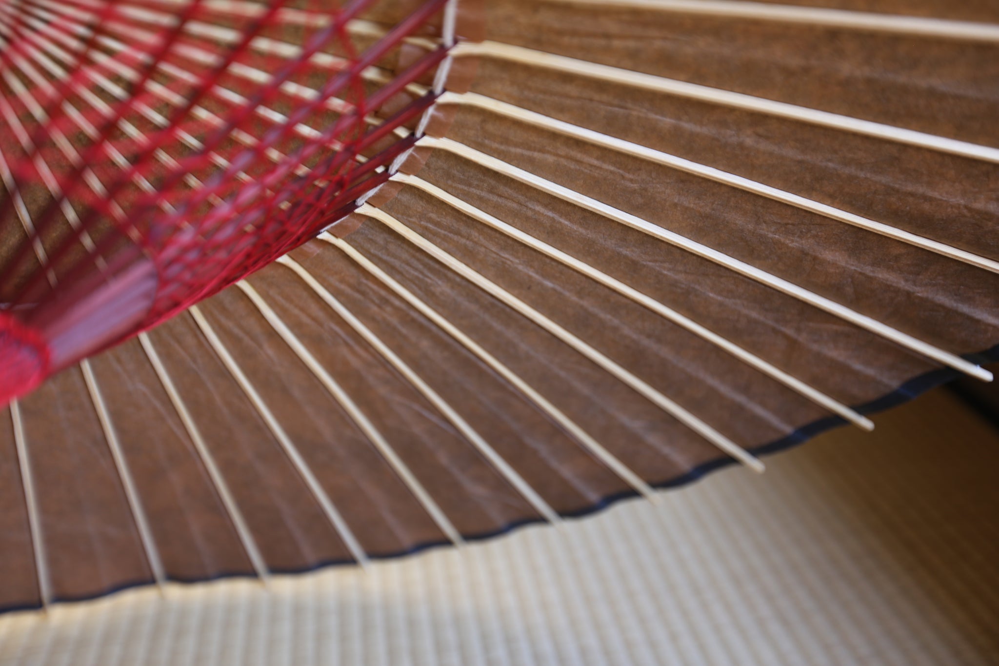 和傘の骨組みは、1本の竹を均等に割り、傘を畳んだ際に元の竹に戻るように組まれています。