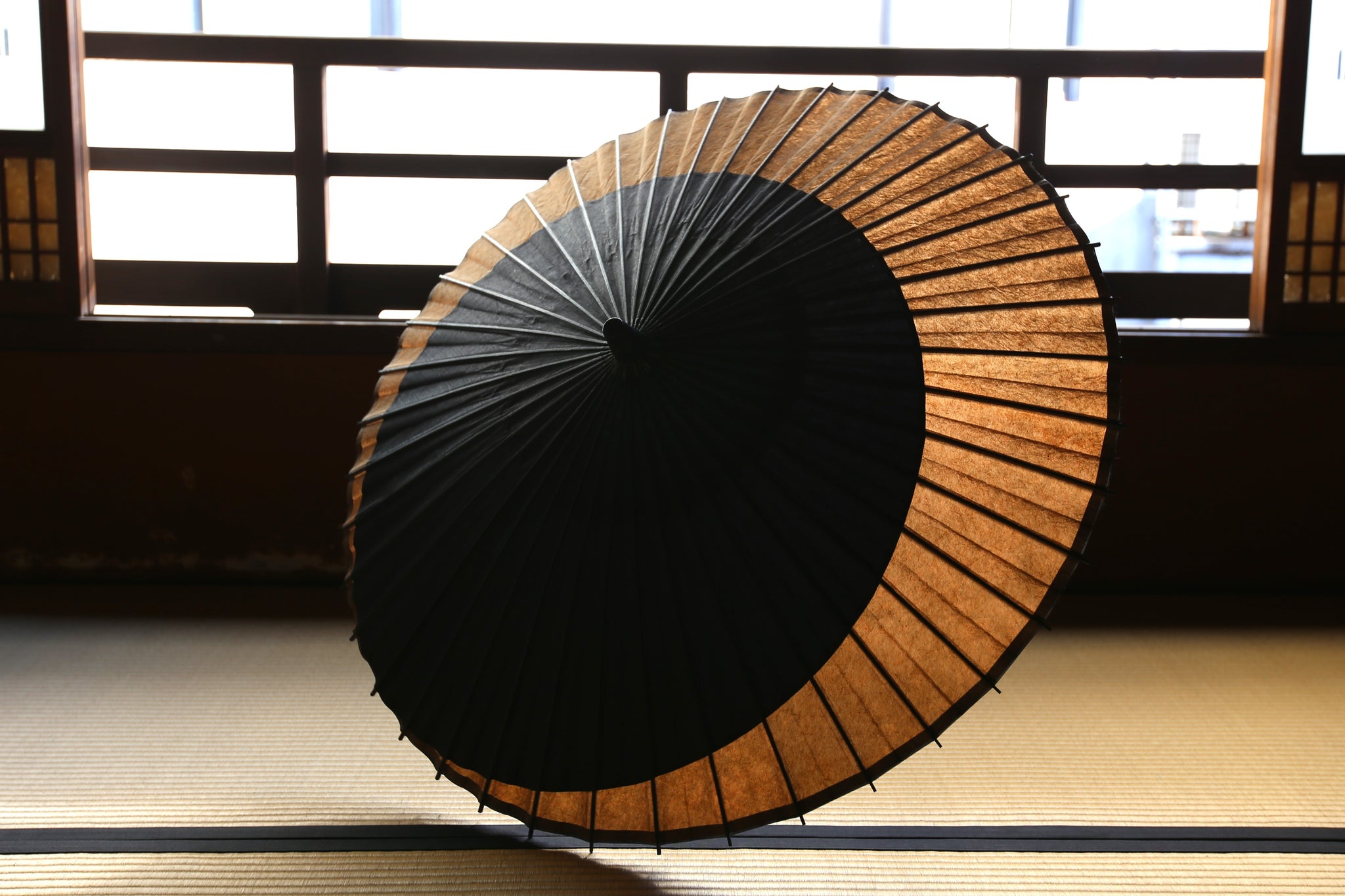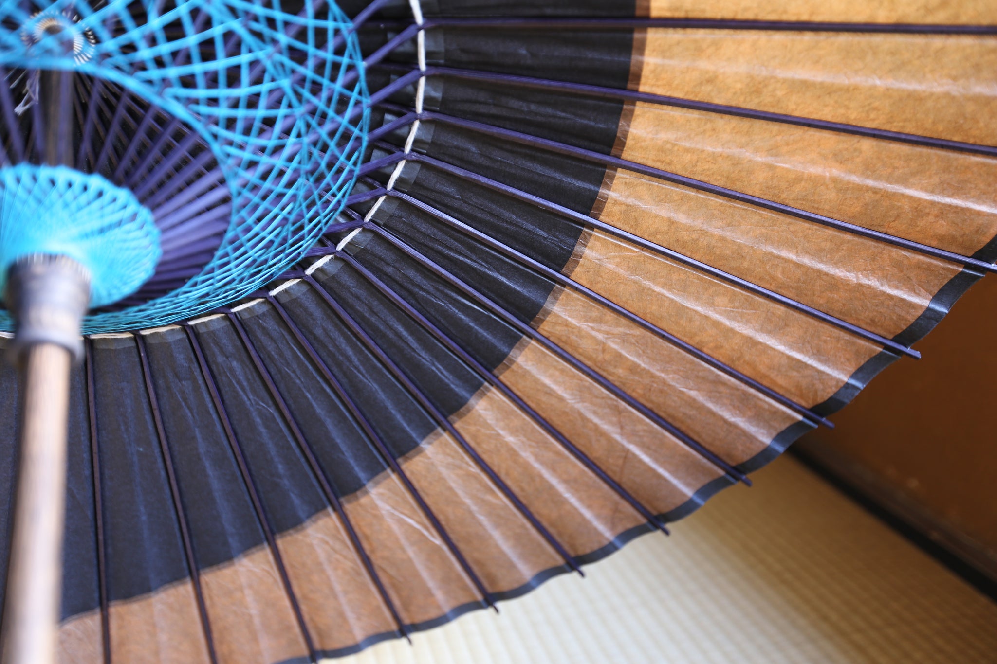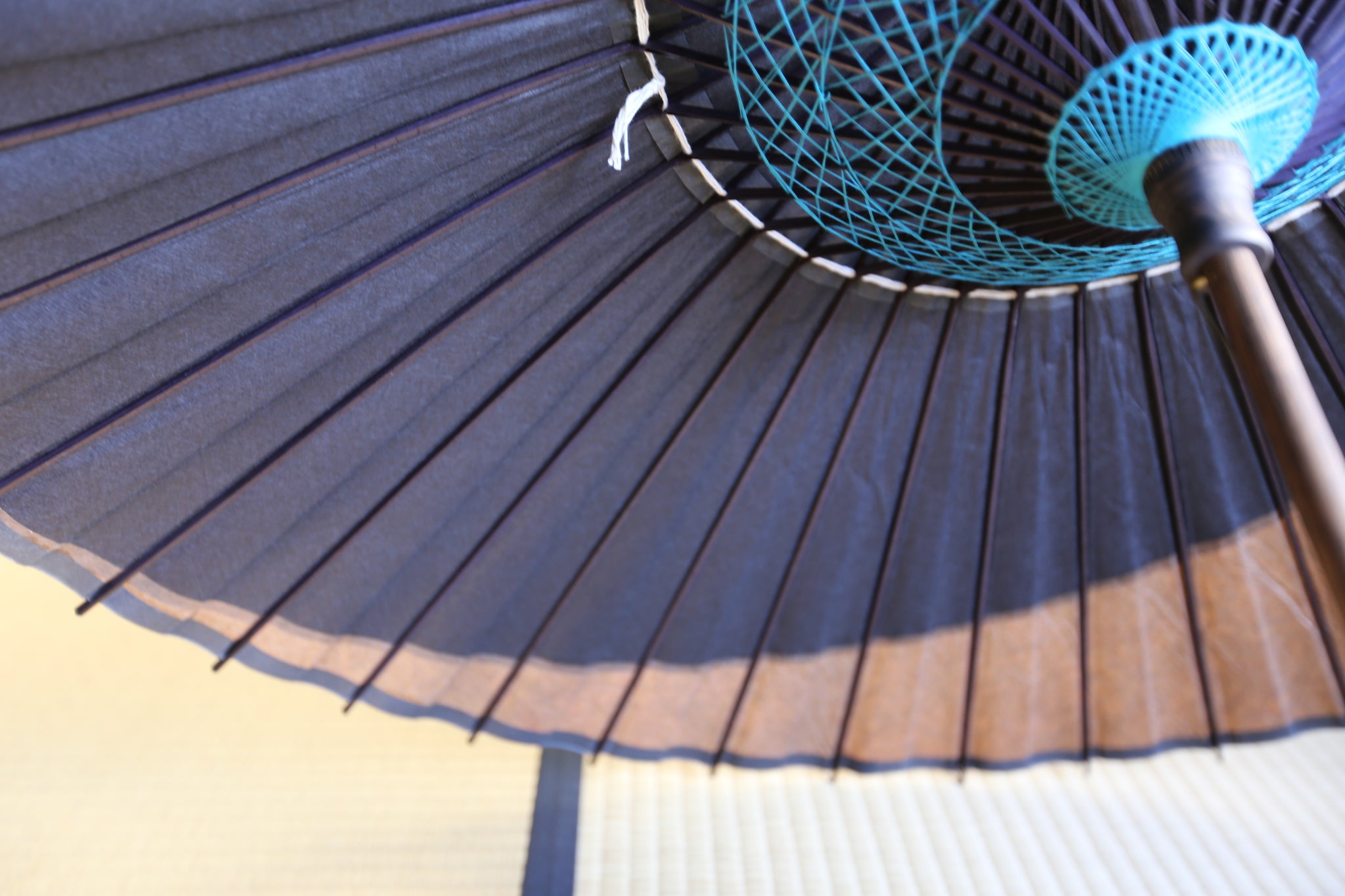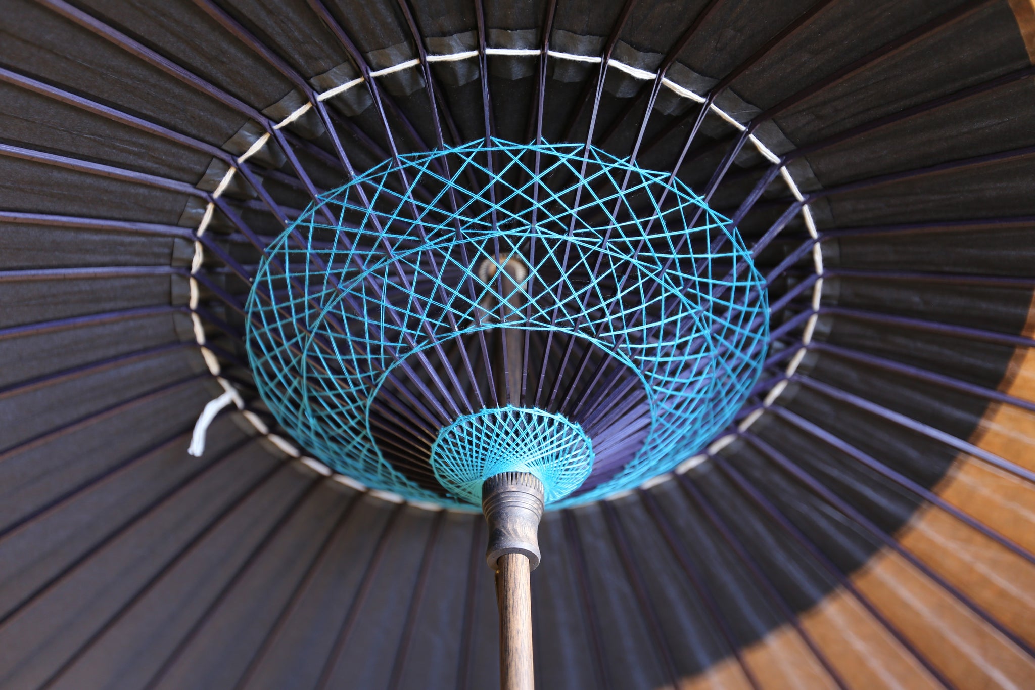 和傘の骨組みは、1本の竹を均等に割り、傘を畳んだ際に元の竹に戻るように組まれています。