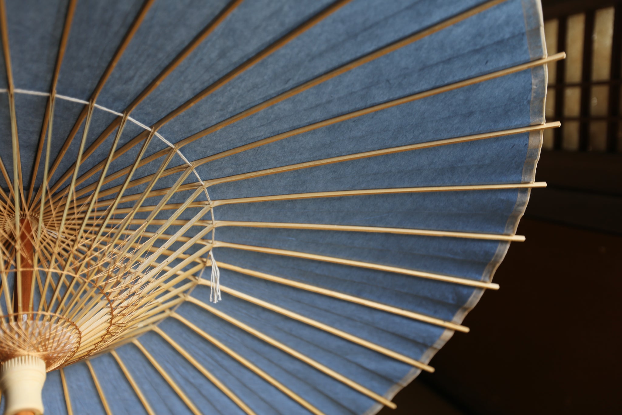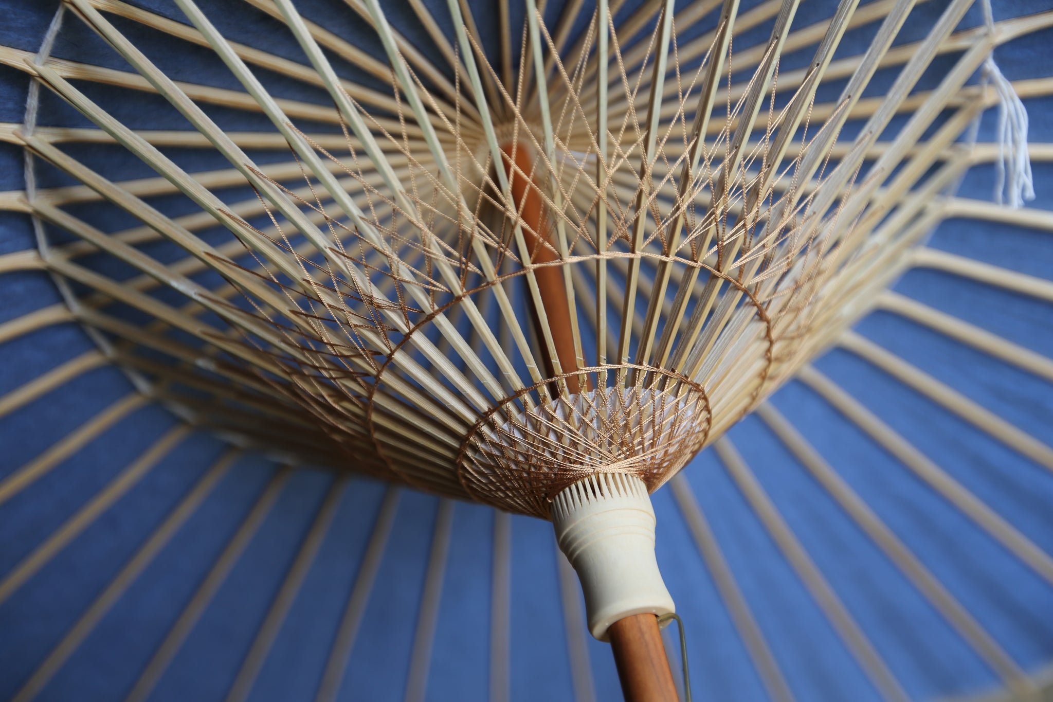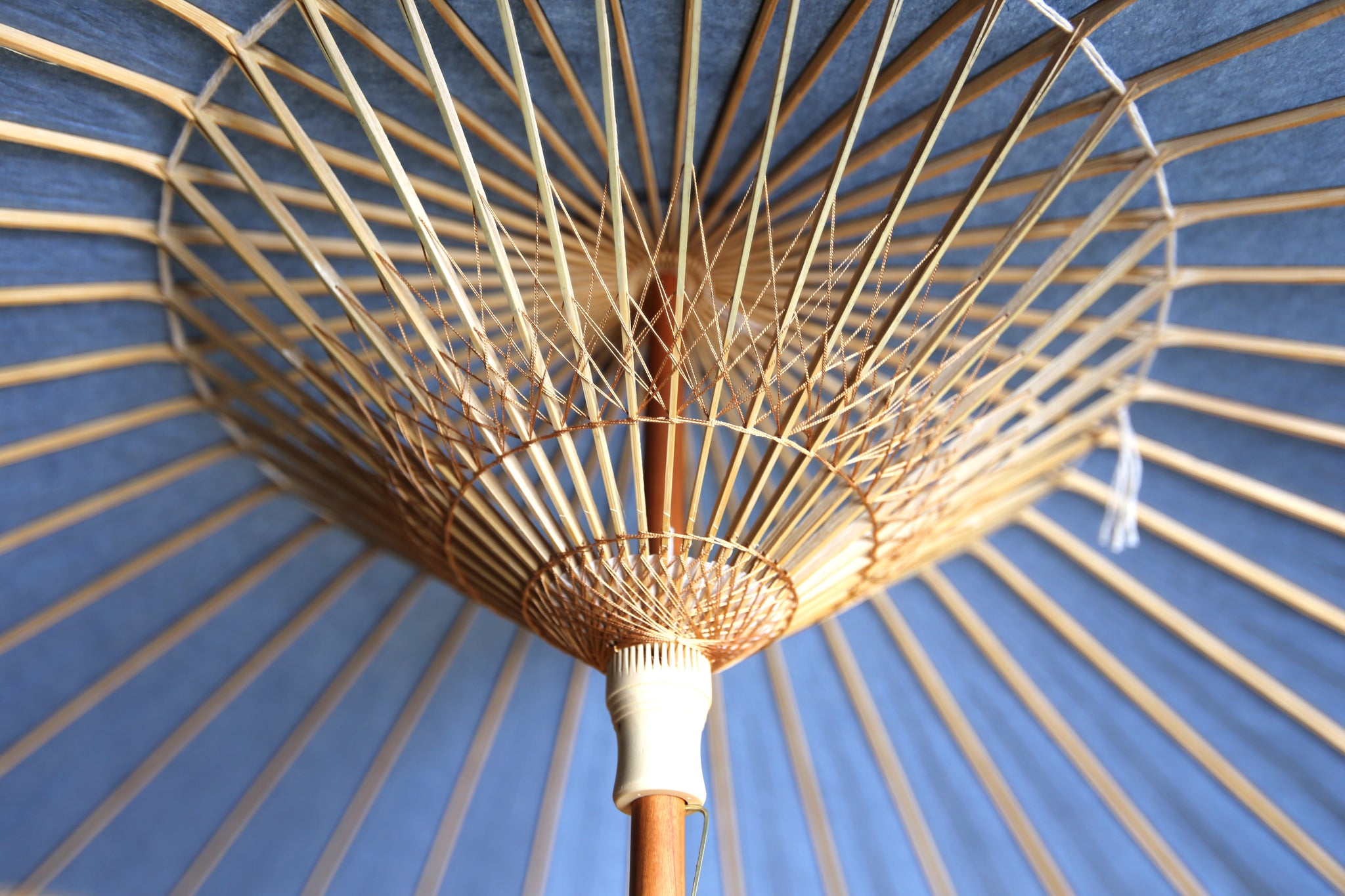 和傘の骨組みは、1本の竹を均等に割り、傘を畳んだ際に元の竹に戻るように組まれています。