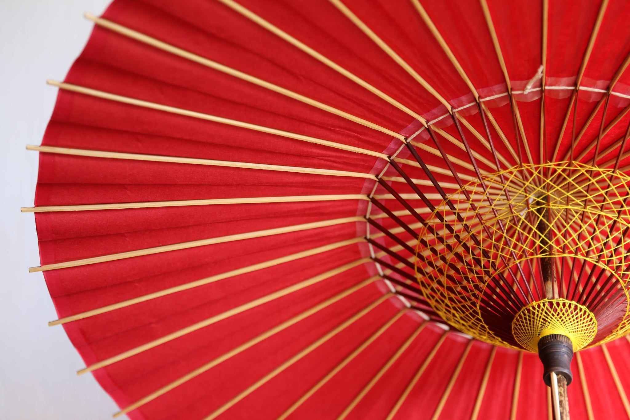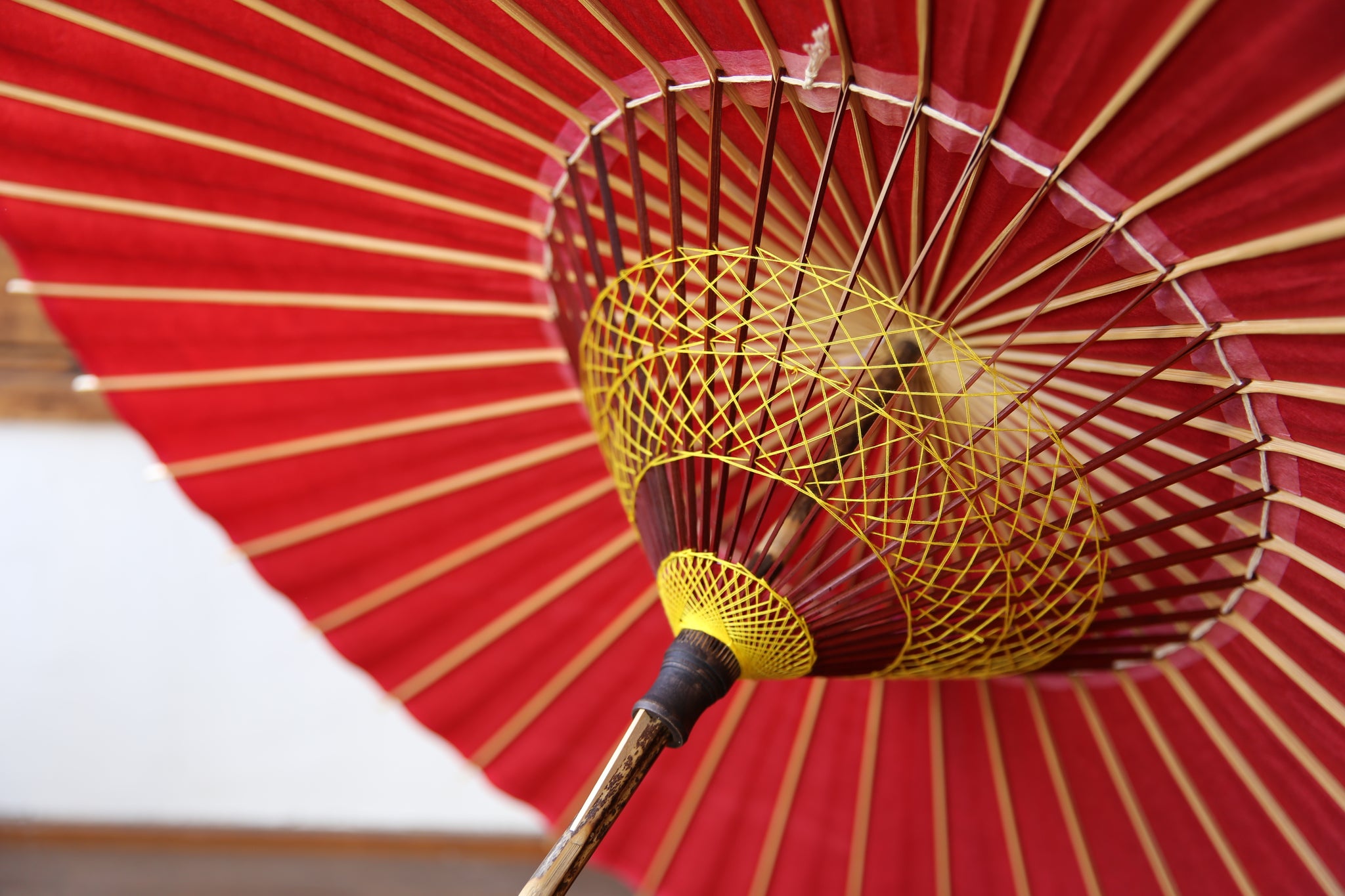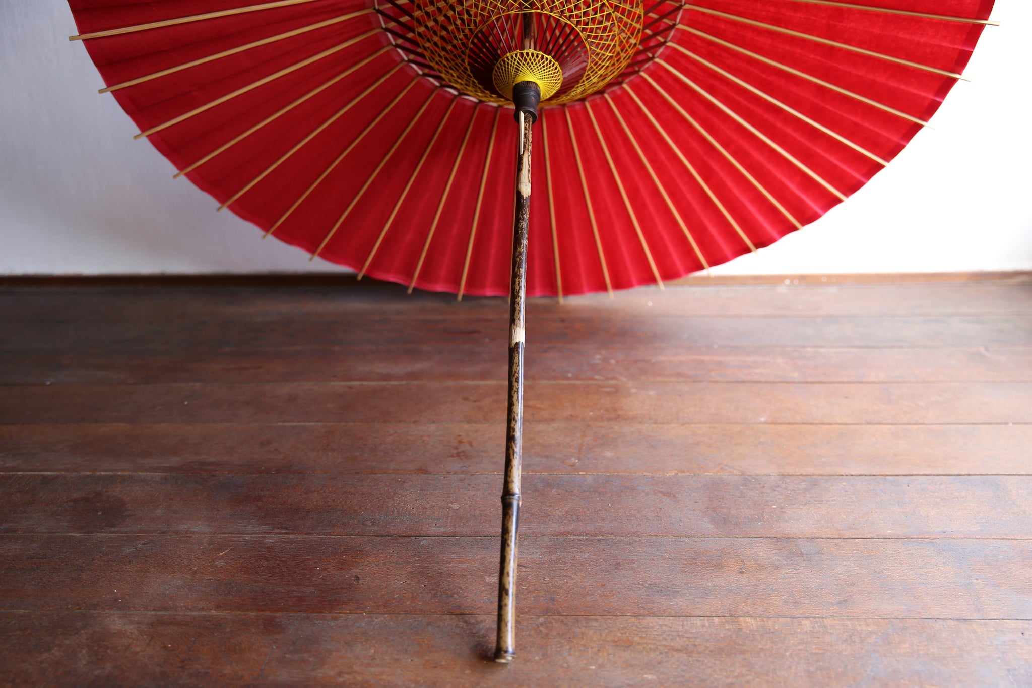 和傘の骨組みは、1本の竹を均等に割り、傘を畳んだ際に元の竹に戻るように組まれています。