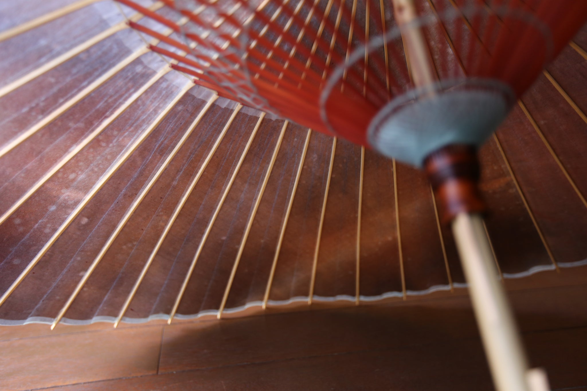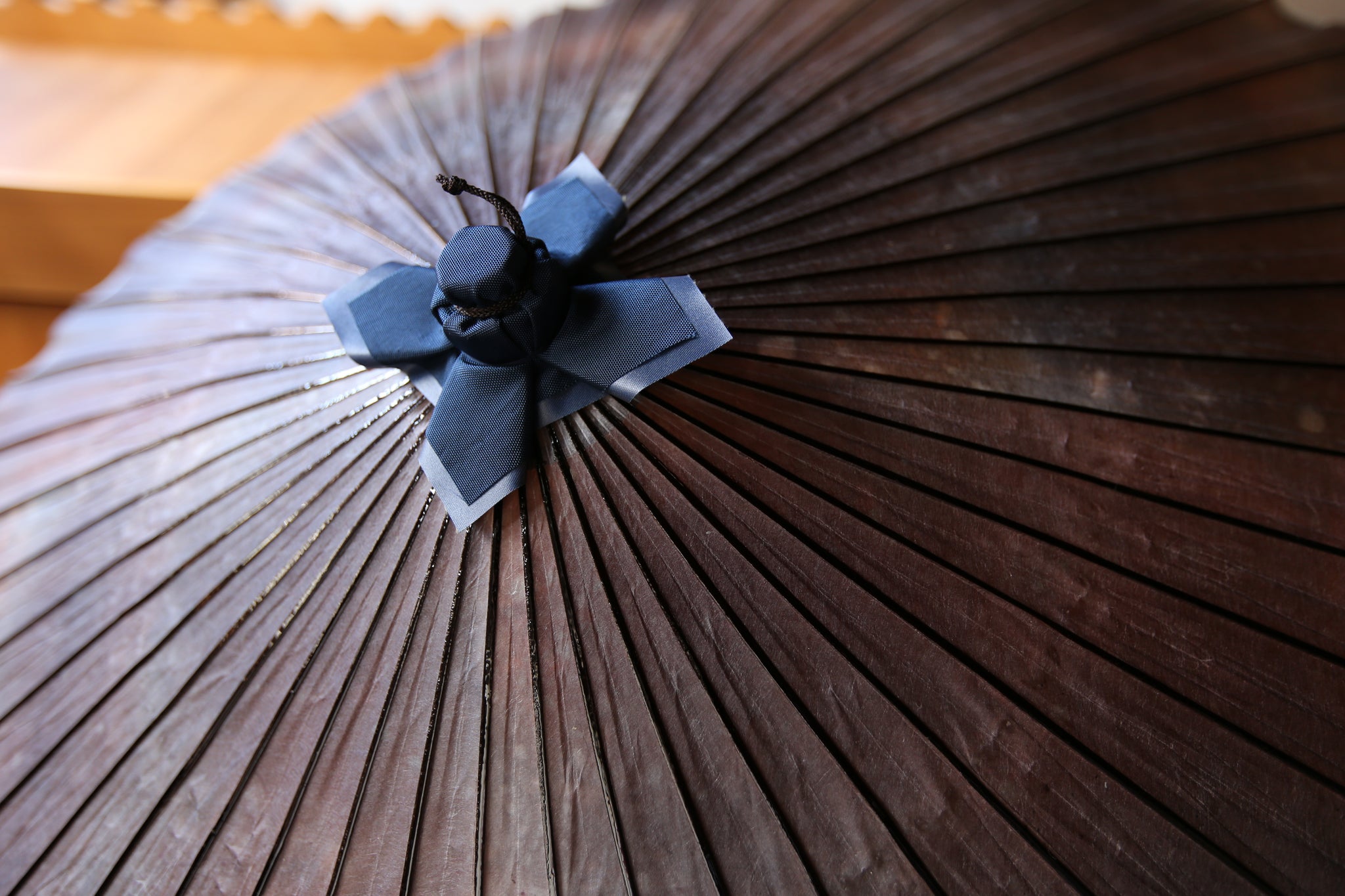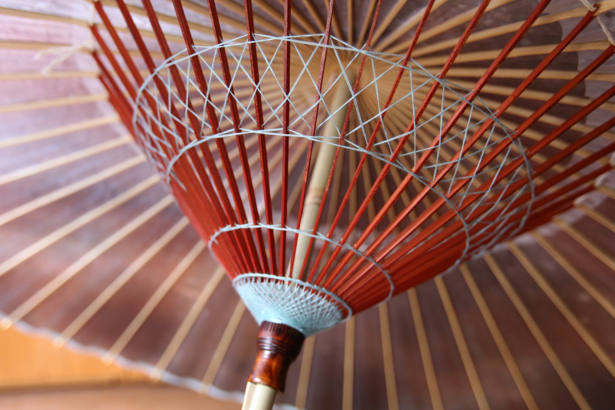 和傘の骨組みは、1本の竹を均等に割り、傘を畳んだ際に元の竹に戻るように組まれています。