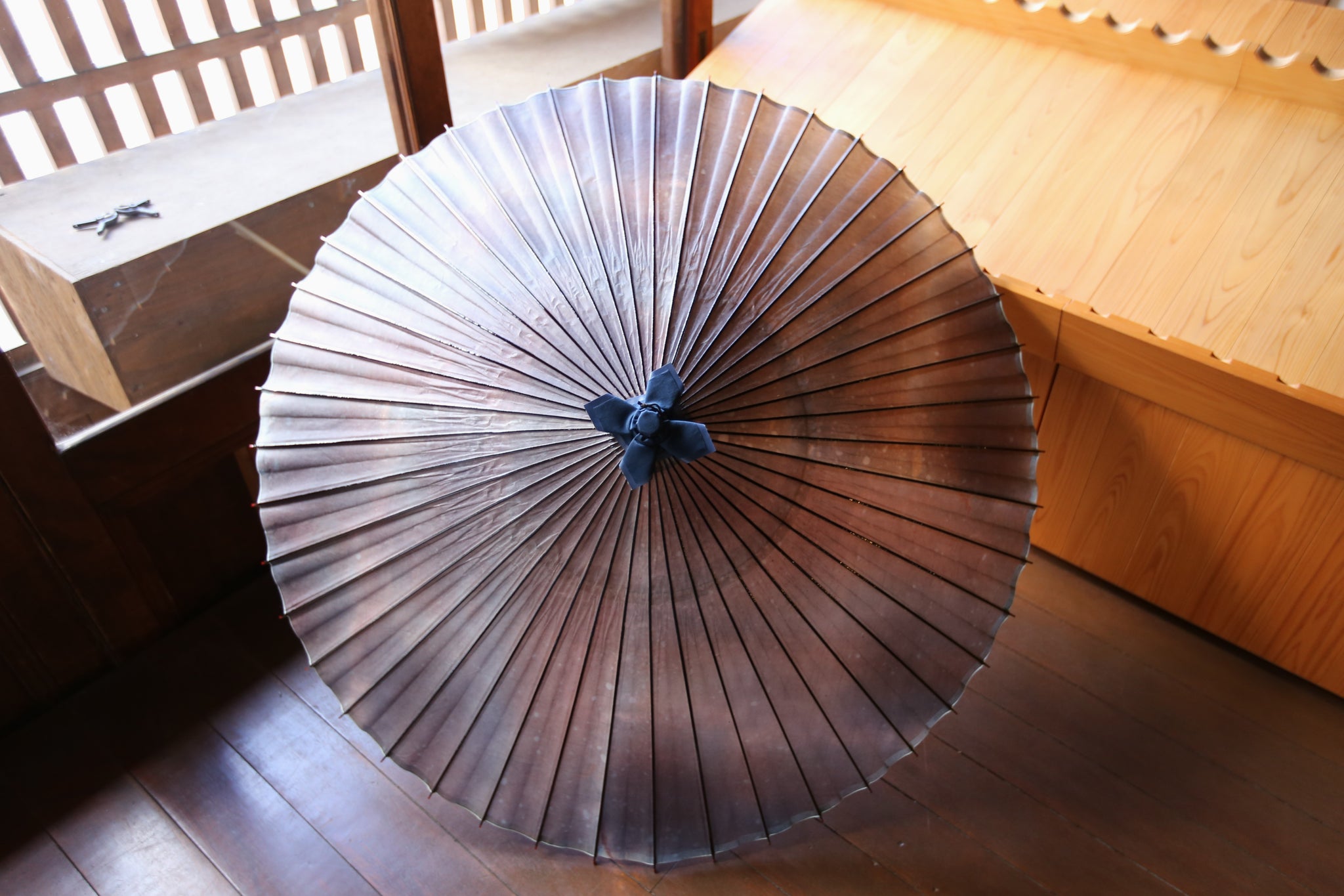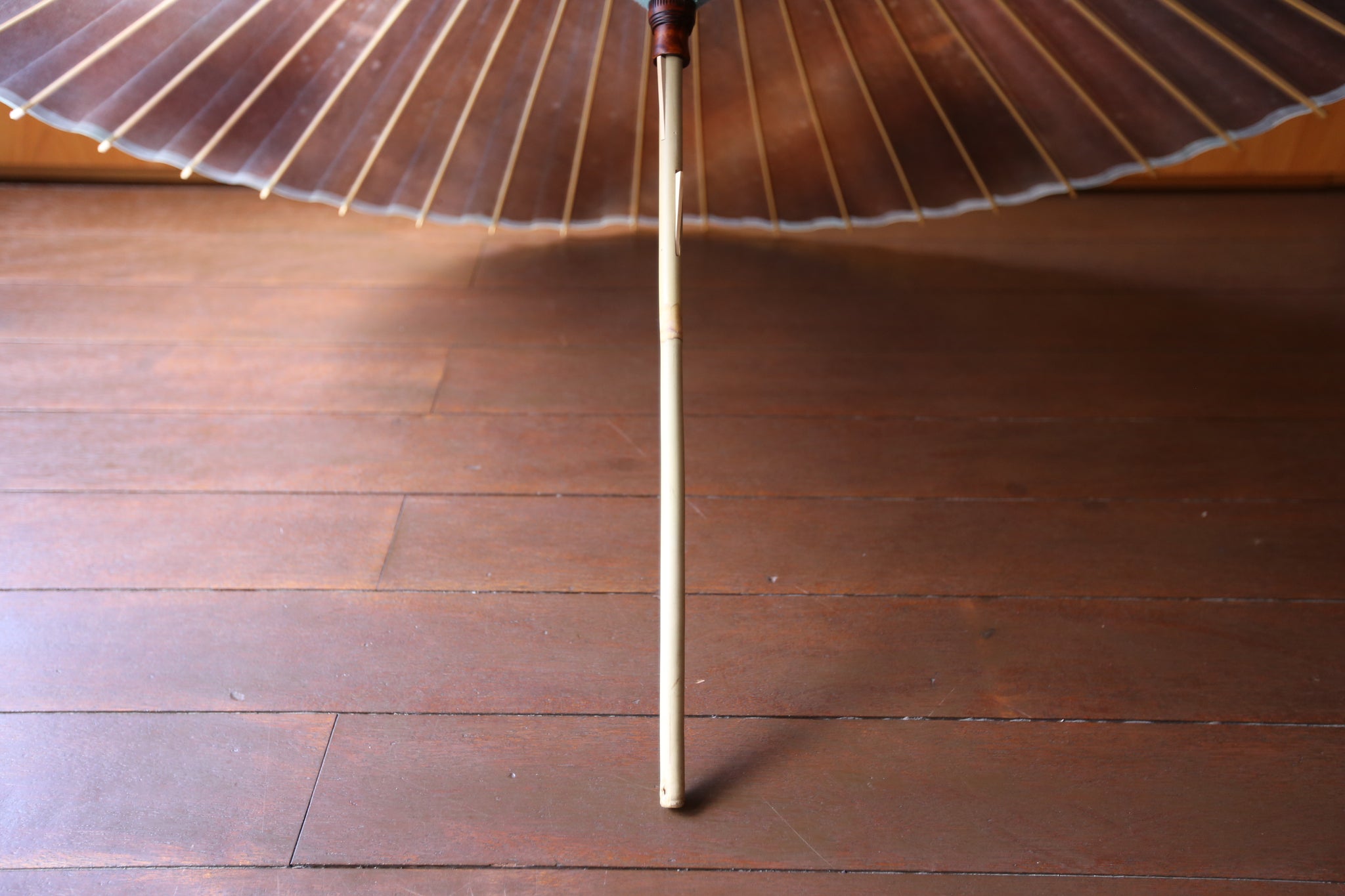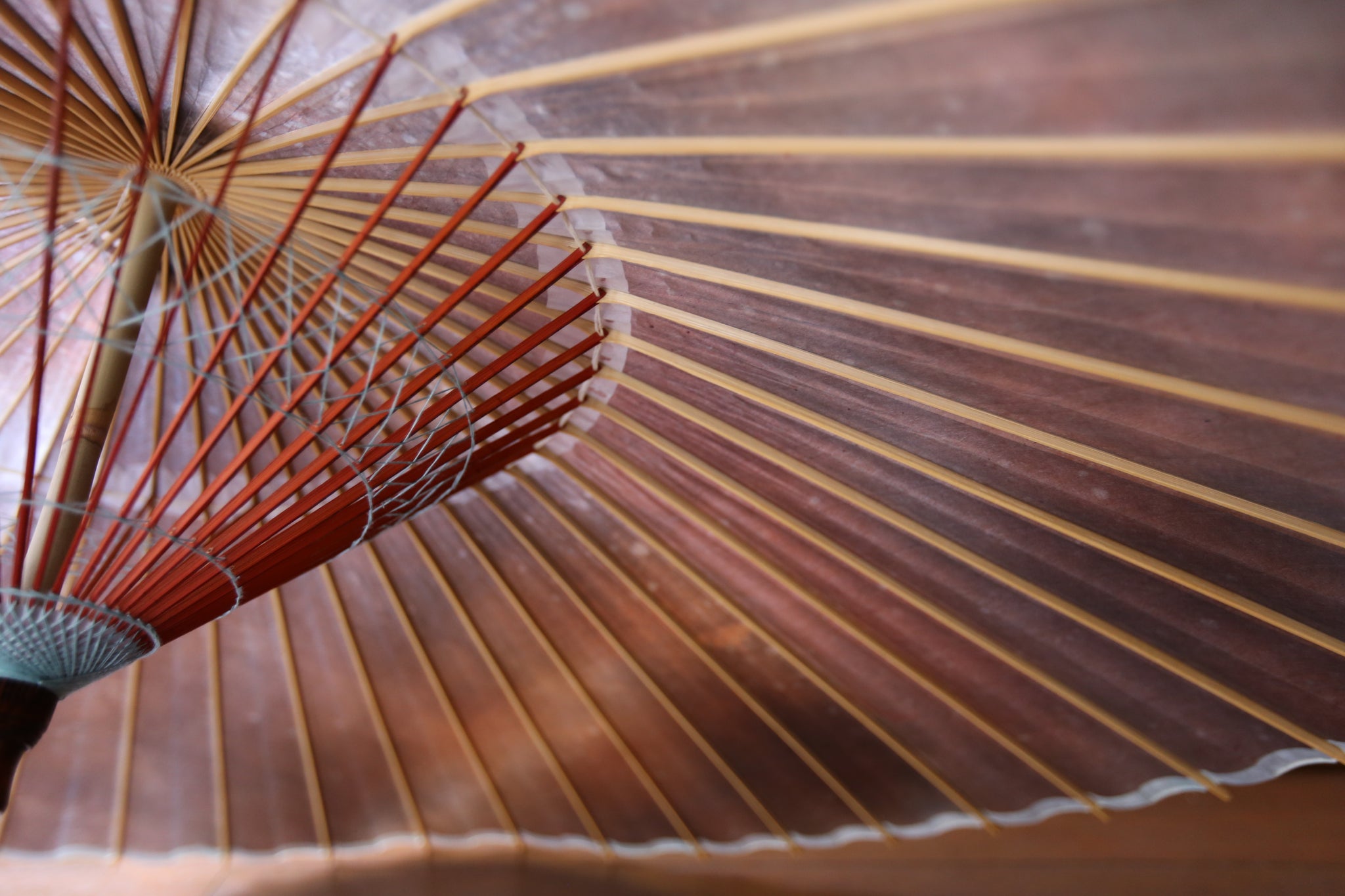 和傘の骨組みは、1本の竹を均等に割り、傘を畳んだ際に元の竹に戻るように組まれています。