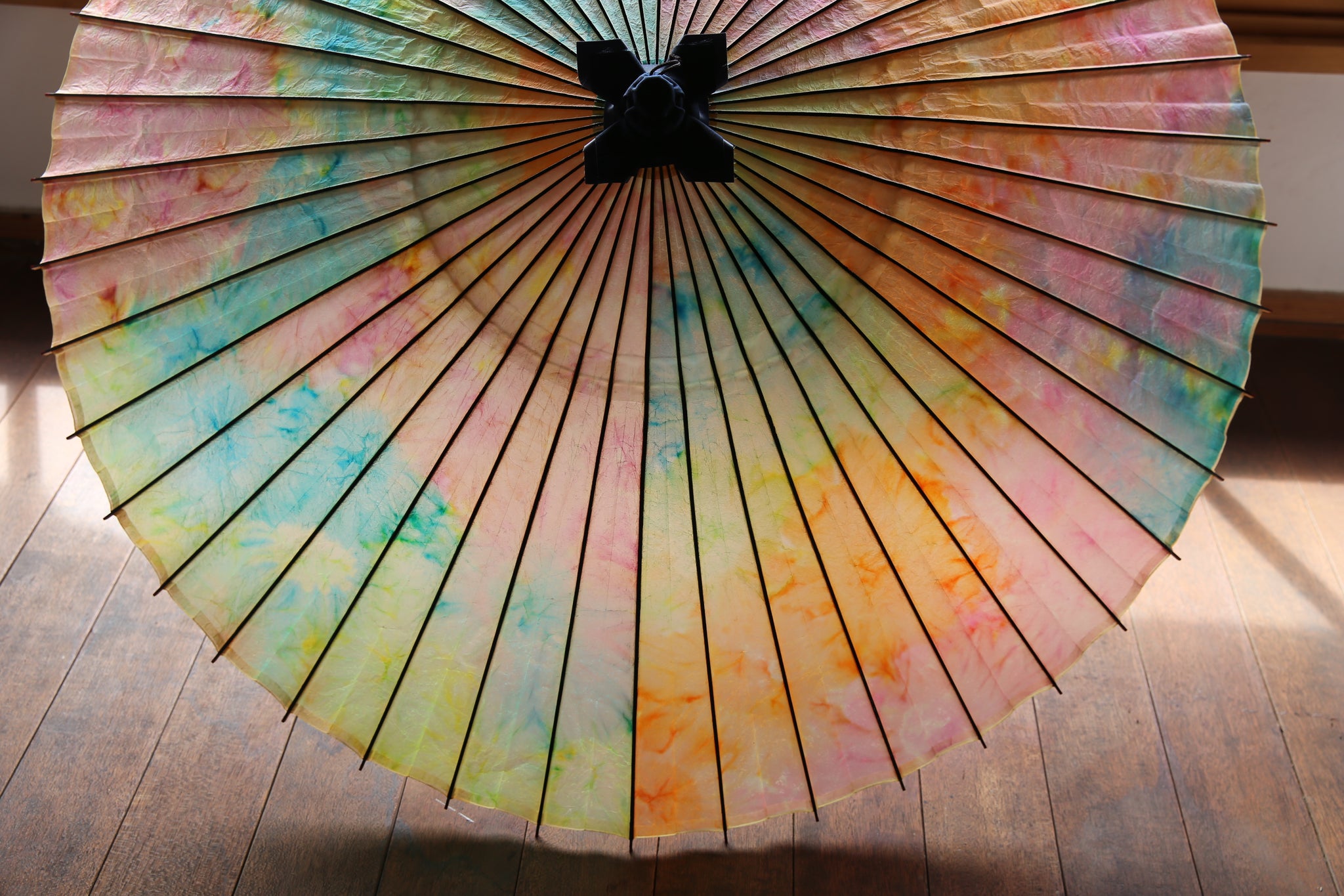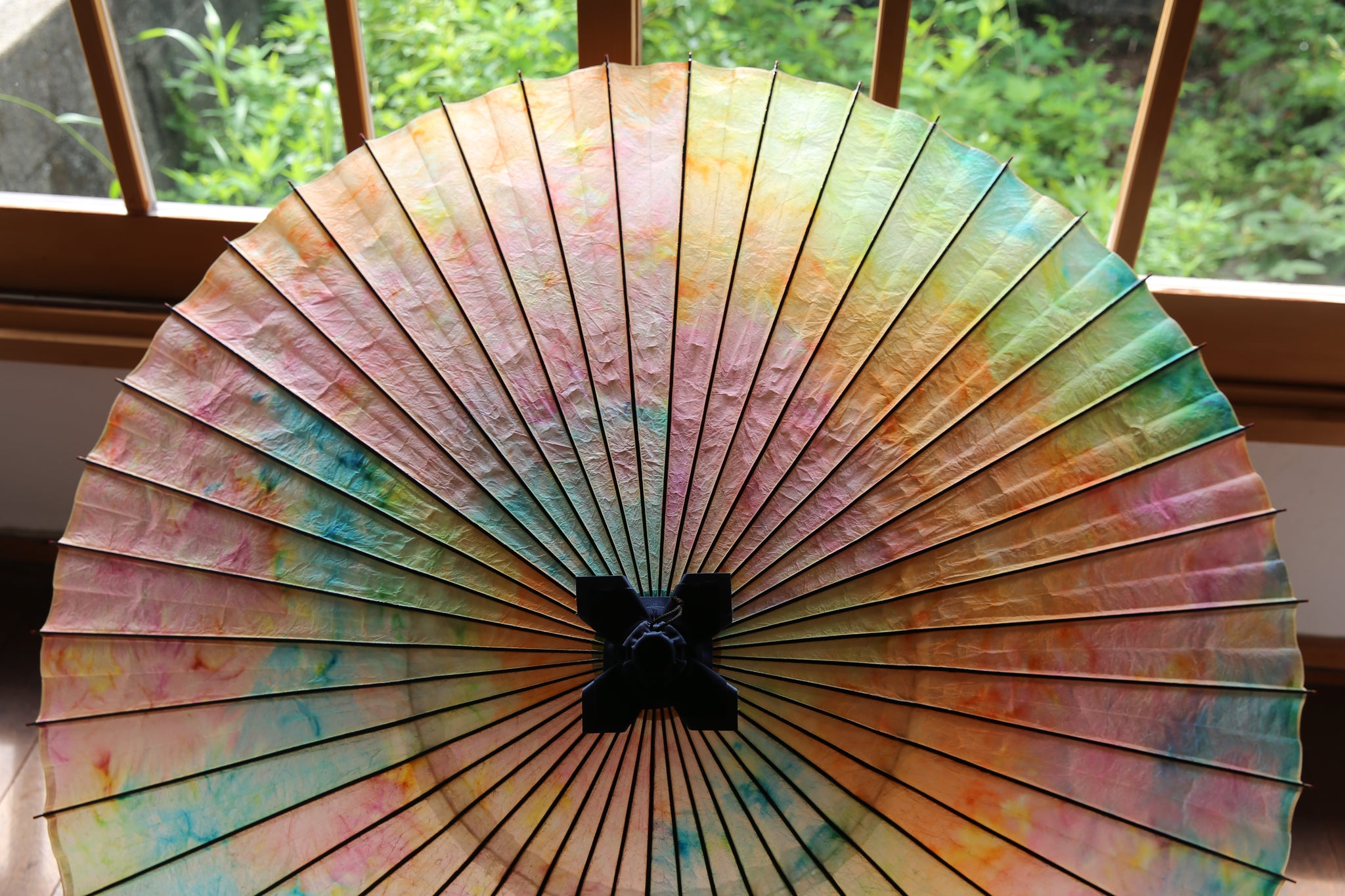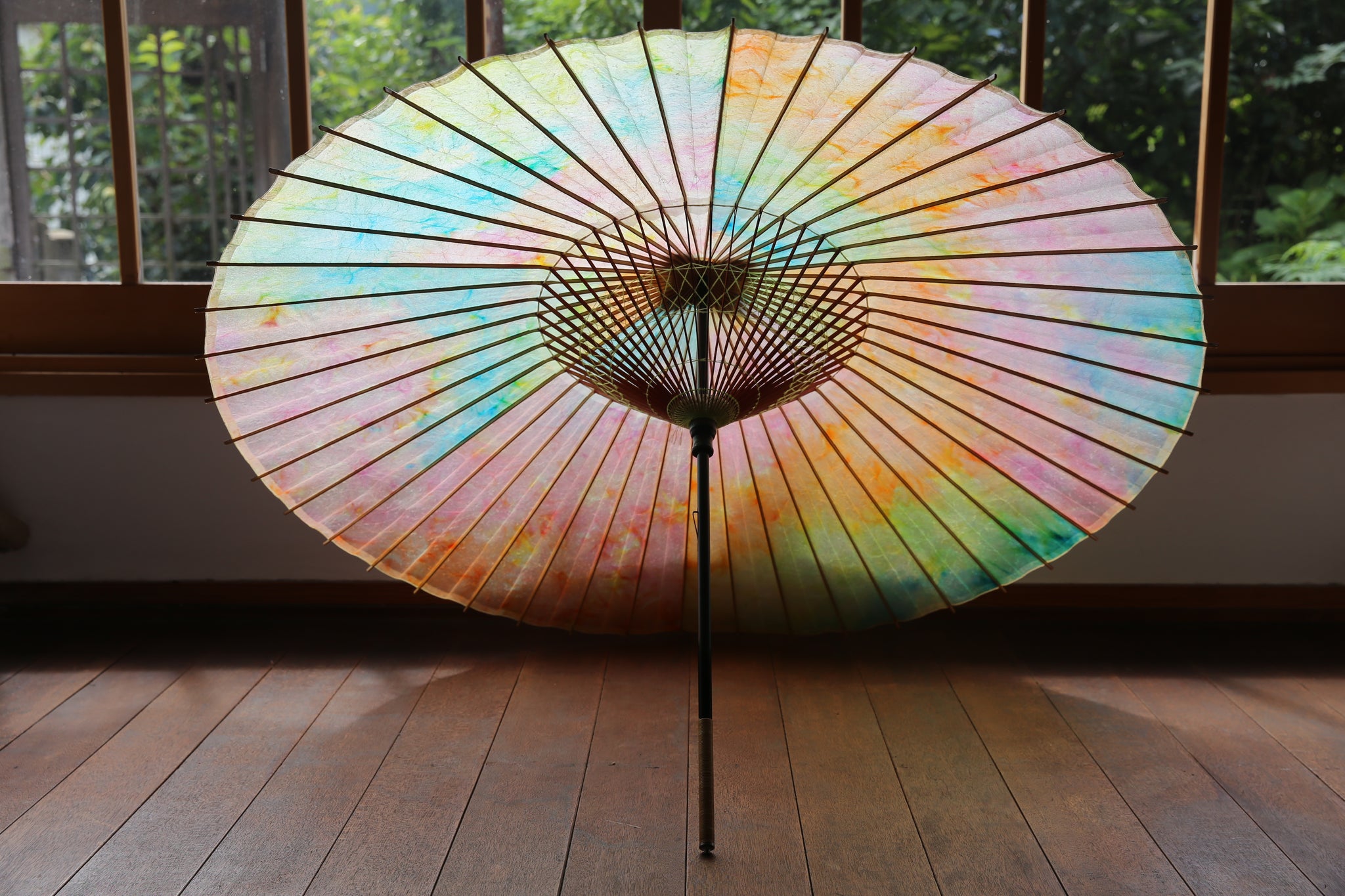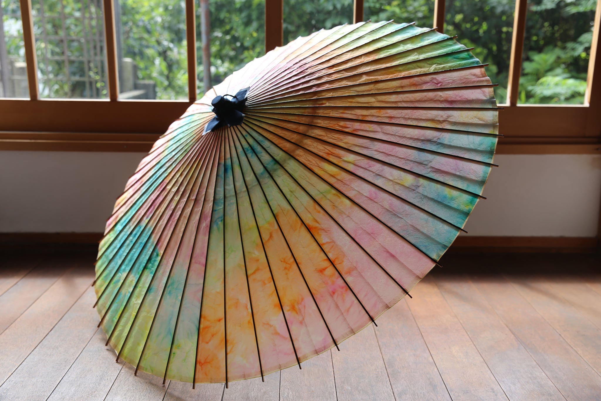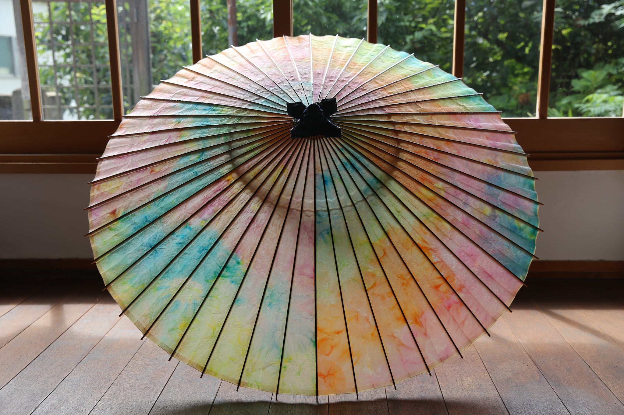 こんなに華やかな和傘は見たことがないというほどインパクトが素晴らしい、特別に美濃手漉き和紙に染めていただいた1点もの。