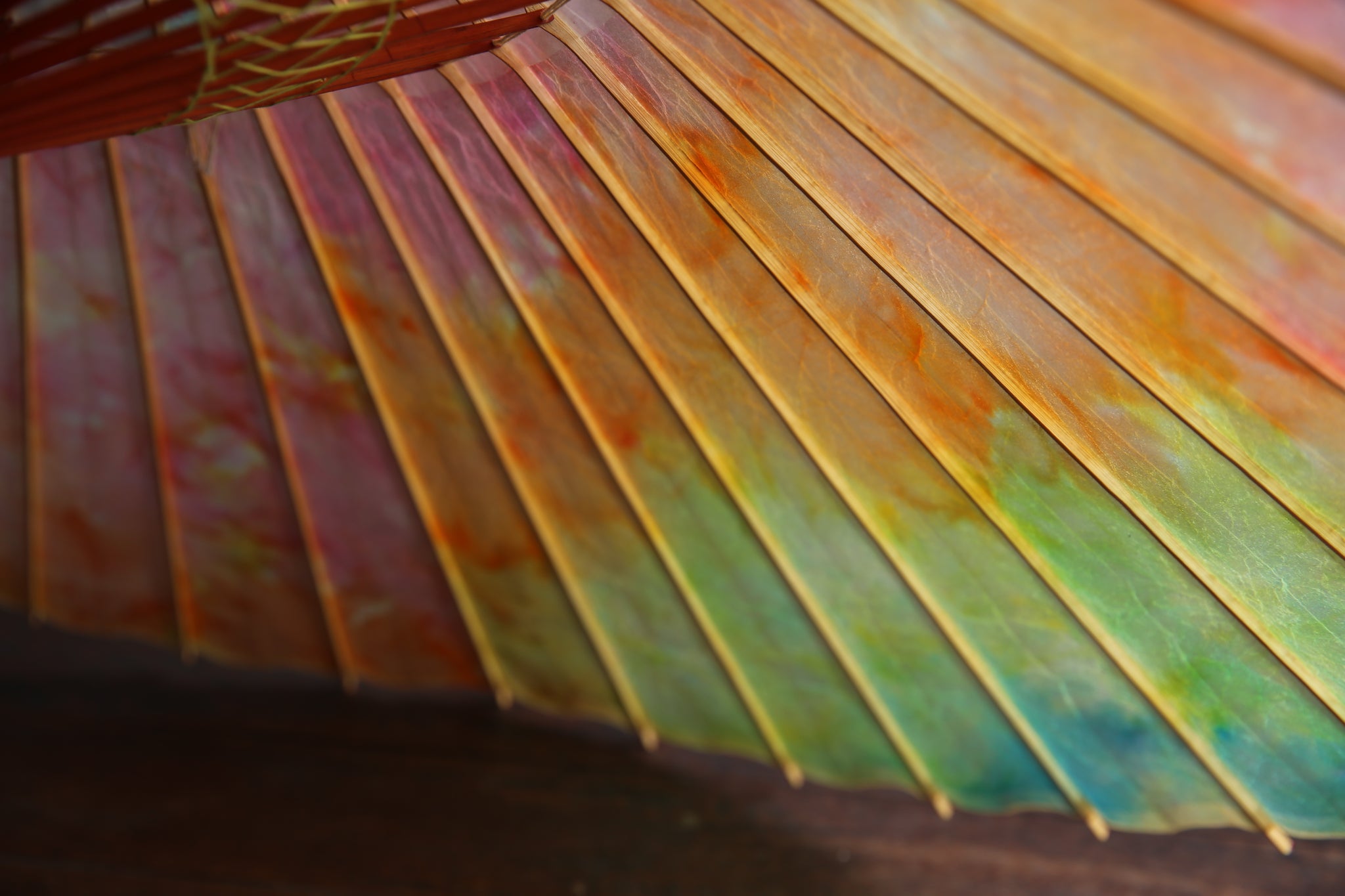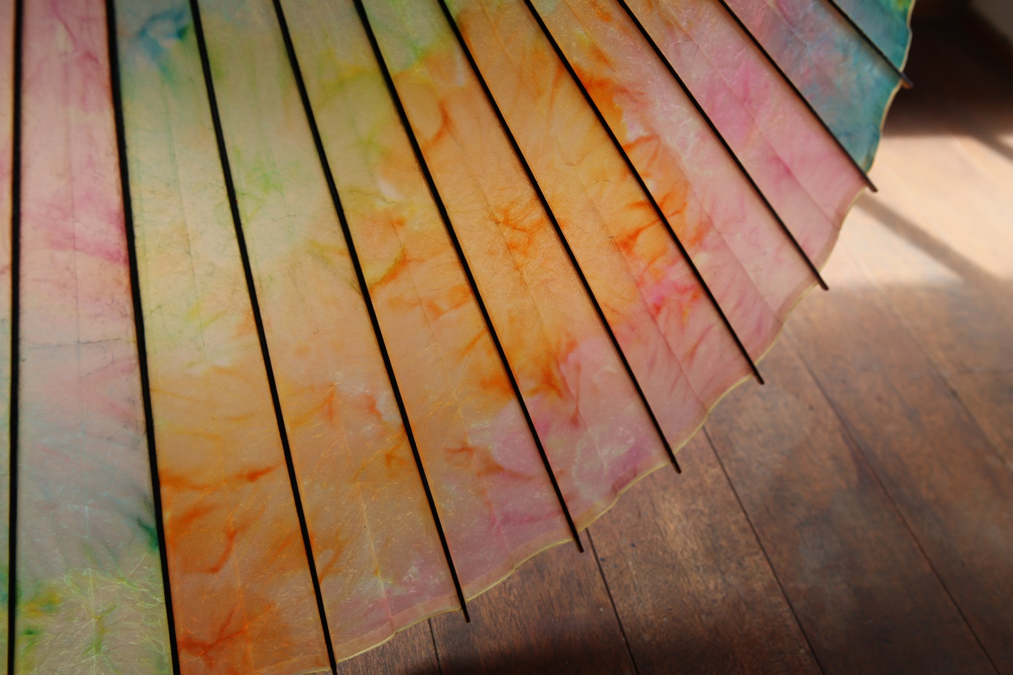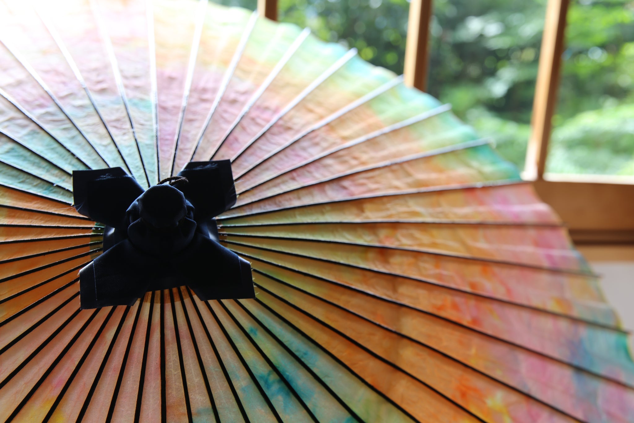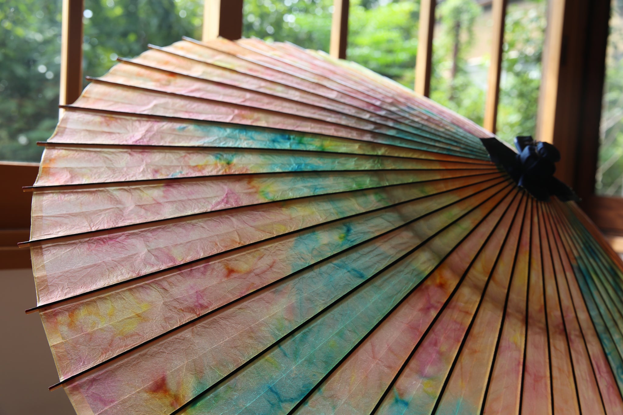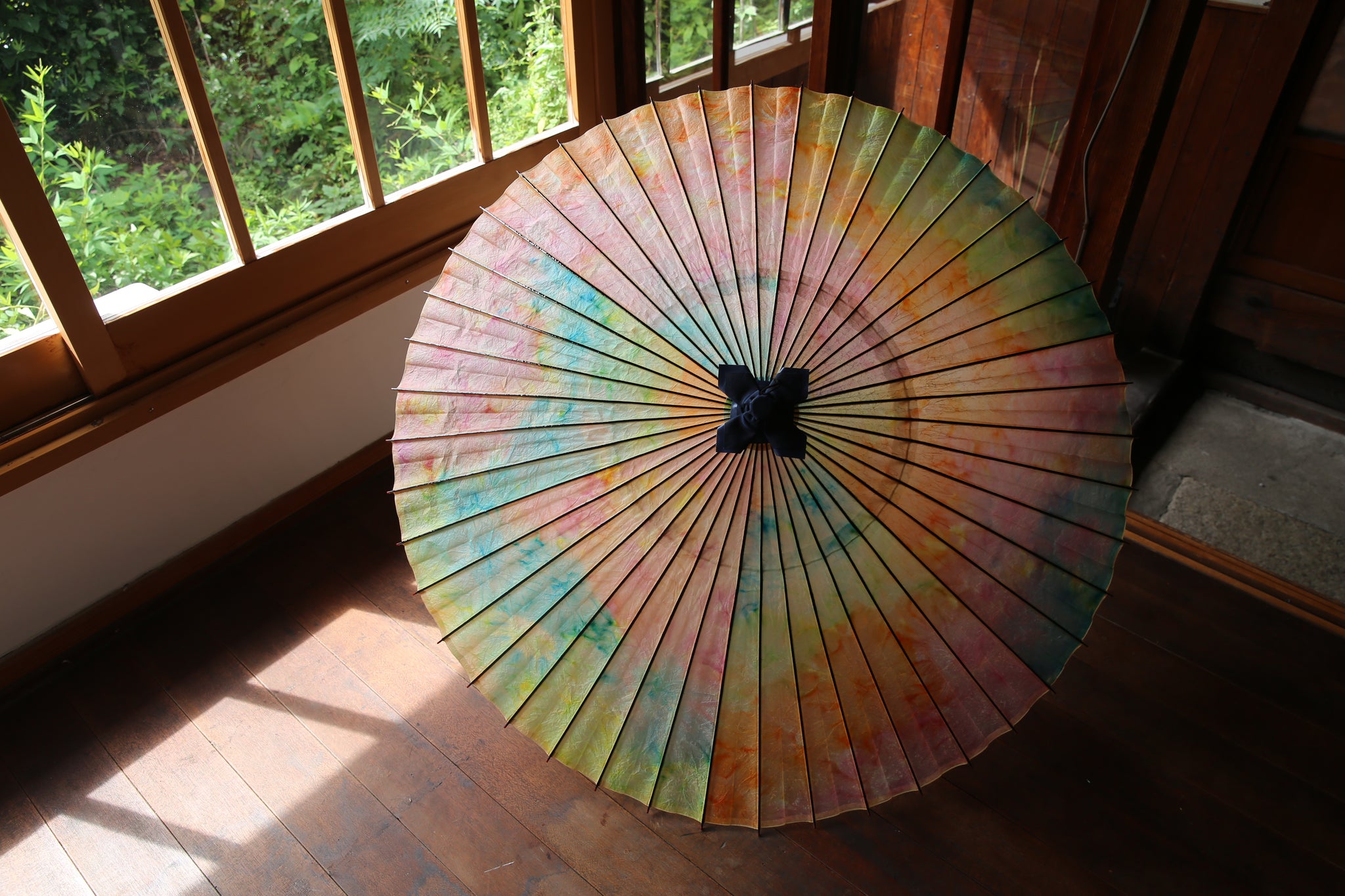 こんなに華やかな和傘は見たことがないというほどインパクトが素晴らしい、特別に美濃手漉き和紙に染めていただいた1点もの。