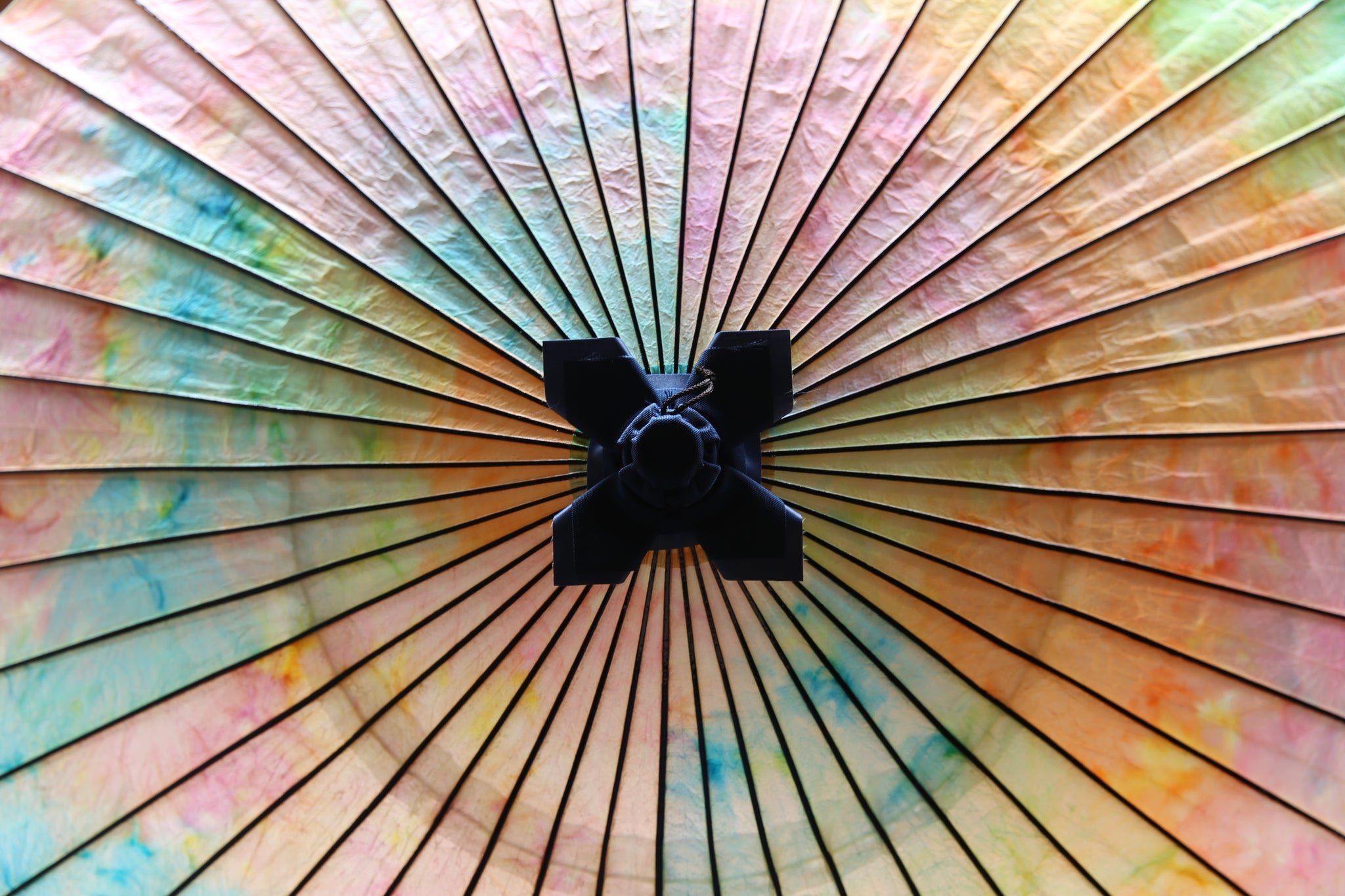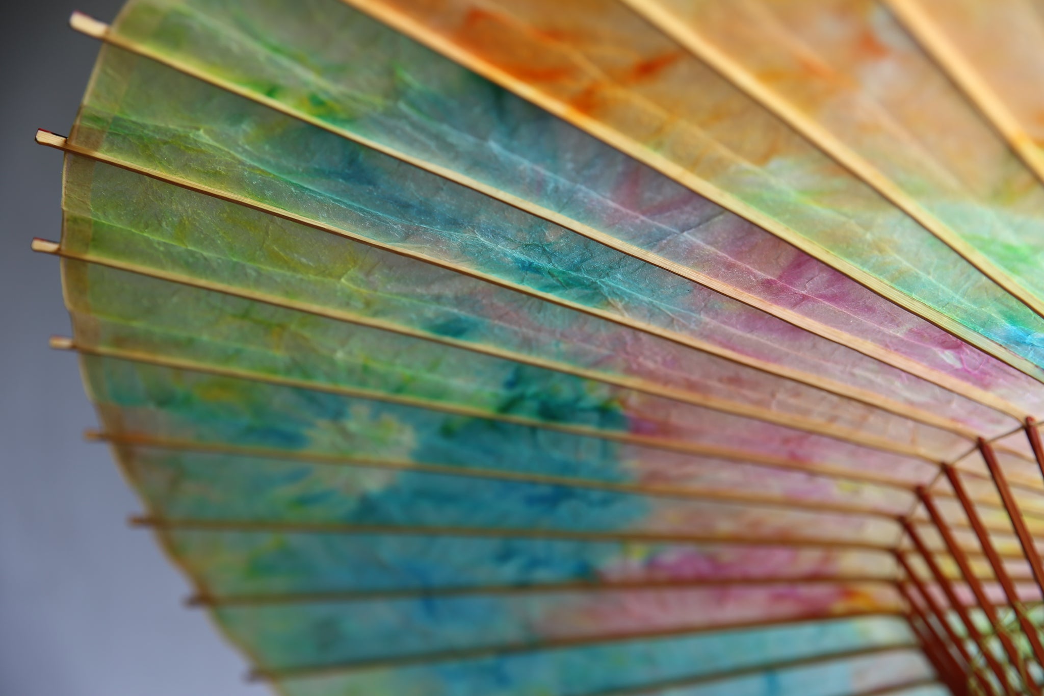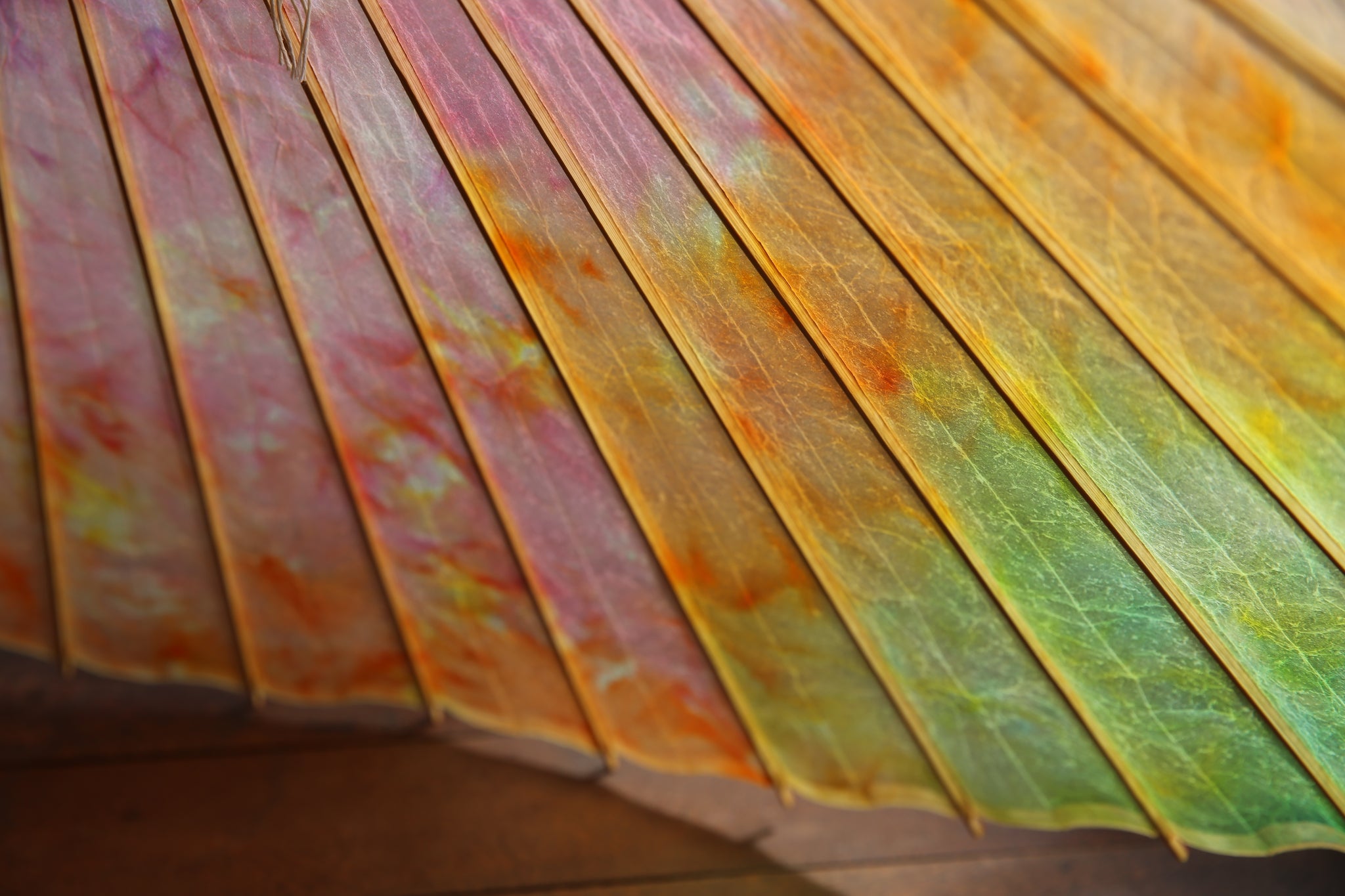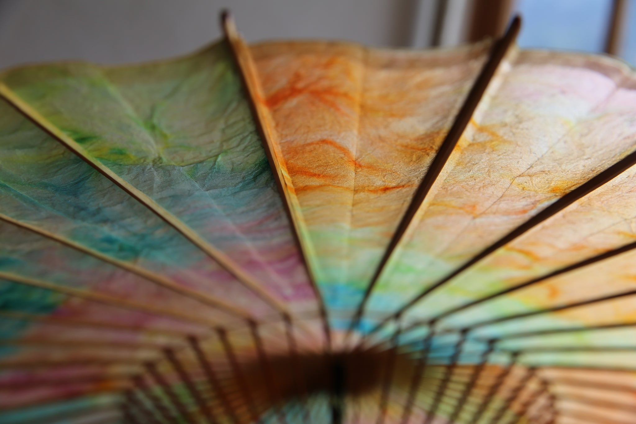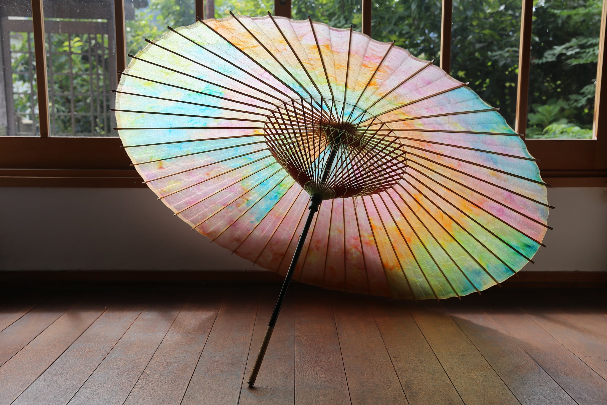 こんなに華やかな和傘は見たことがないというほどインパクトが素晴らしい、特別に美濃手漉き和紙に染めていただいた1点もの。
