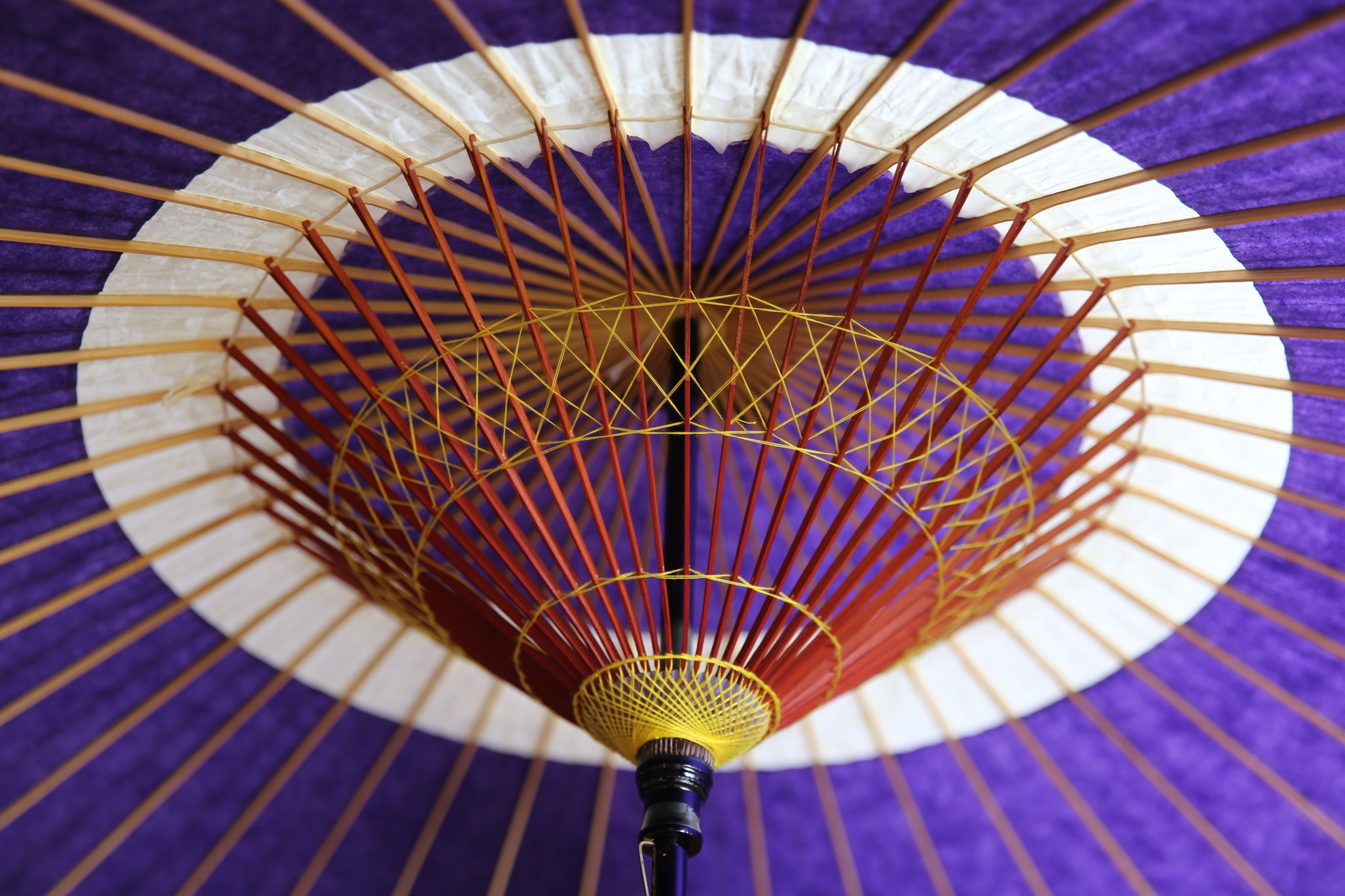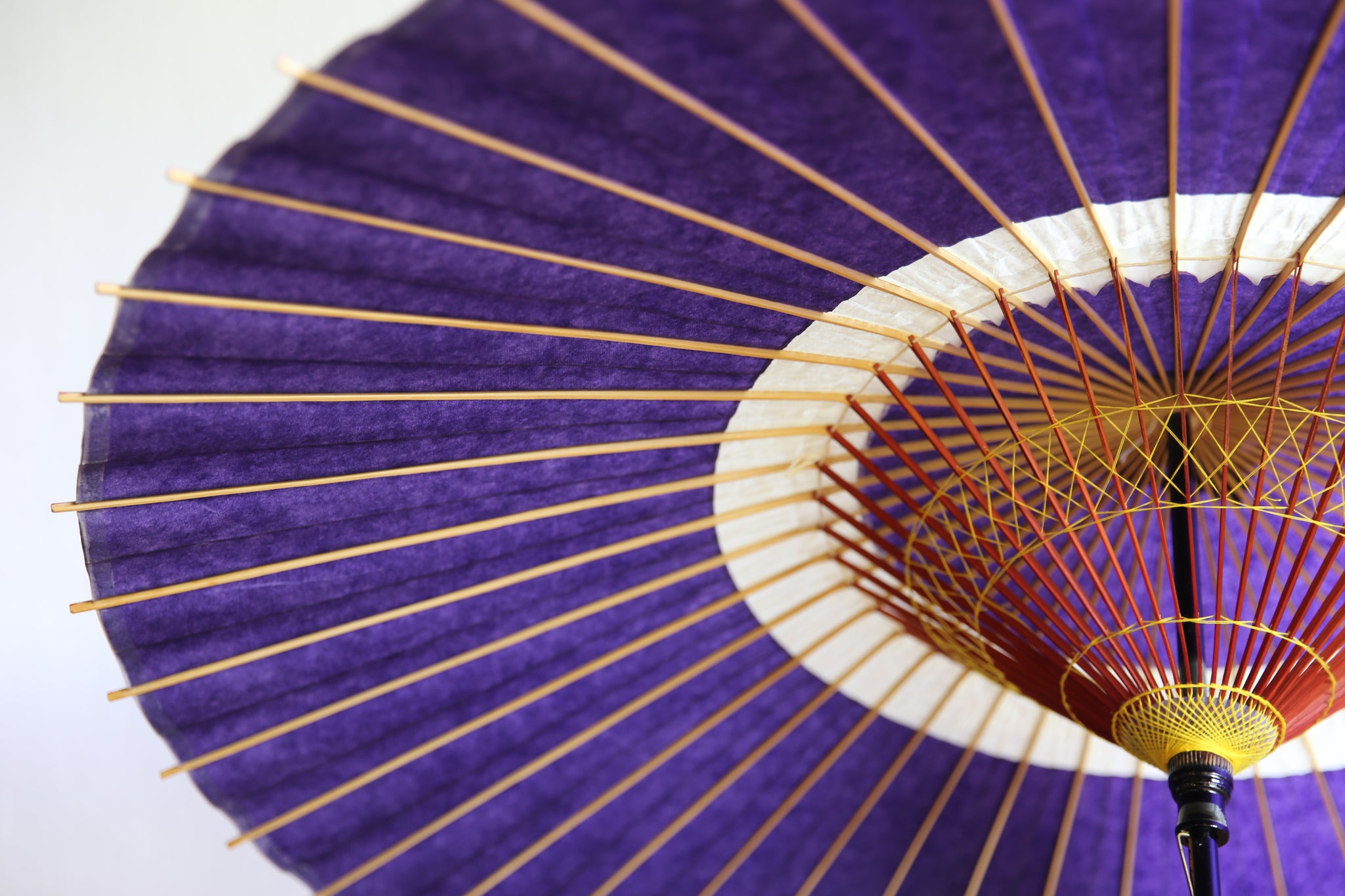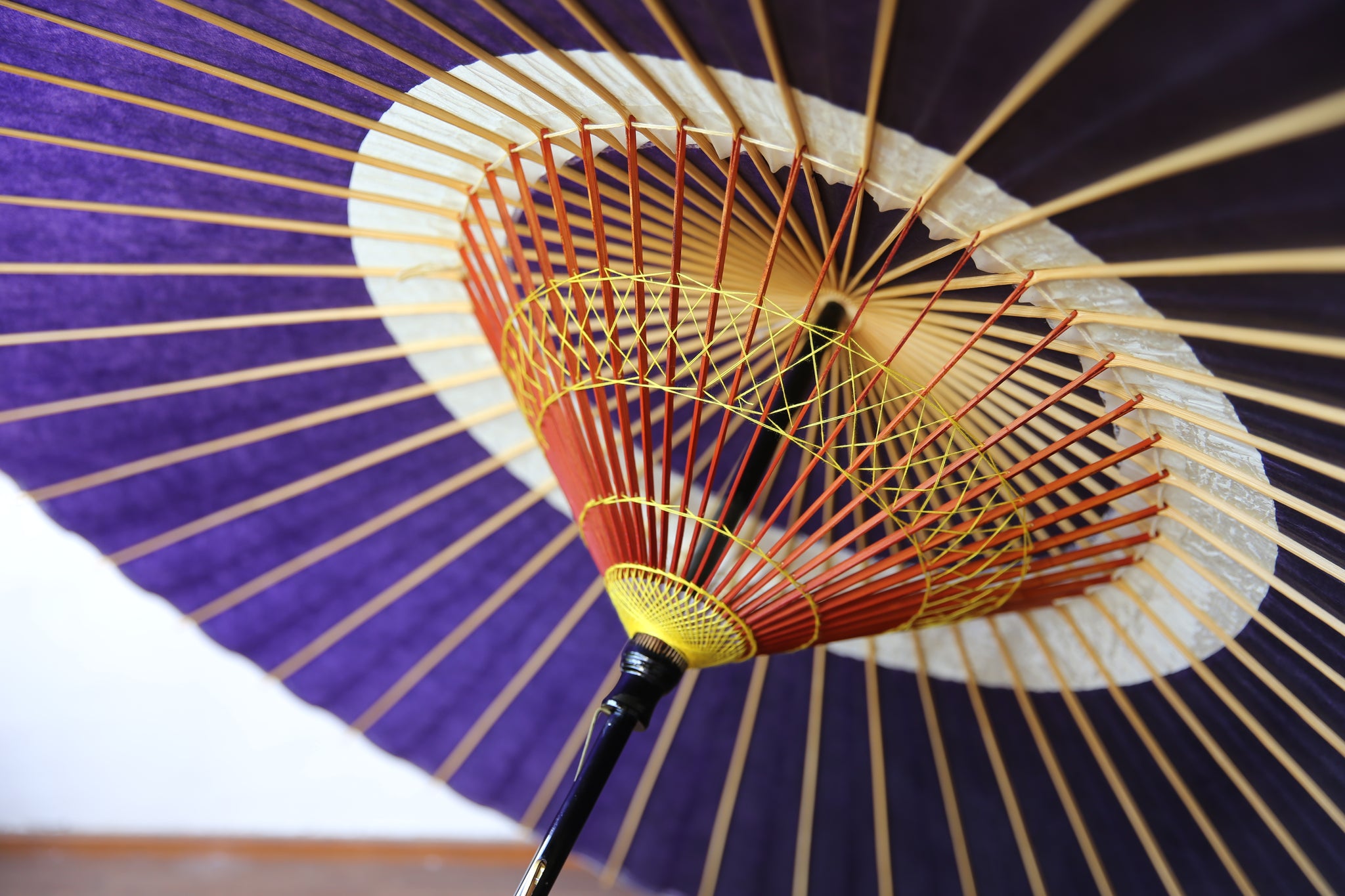 和傘の骨組みは、1本の竹を均等に割り、傘を畳んだ際に元の竹に戻るように組まれています。