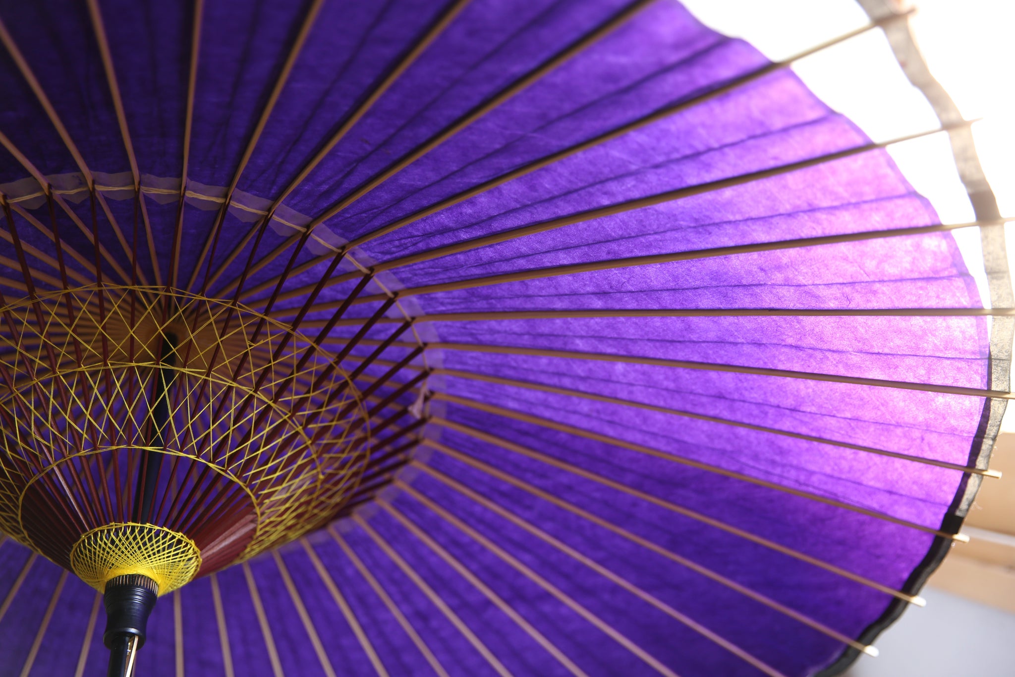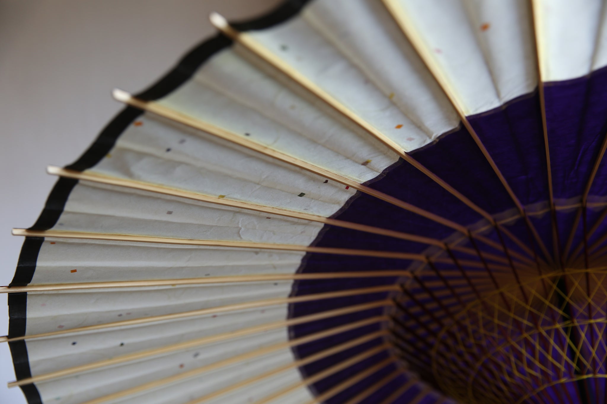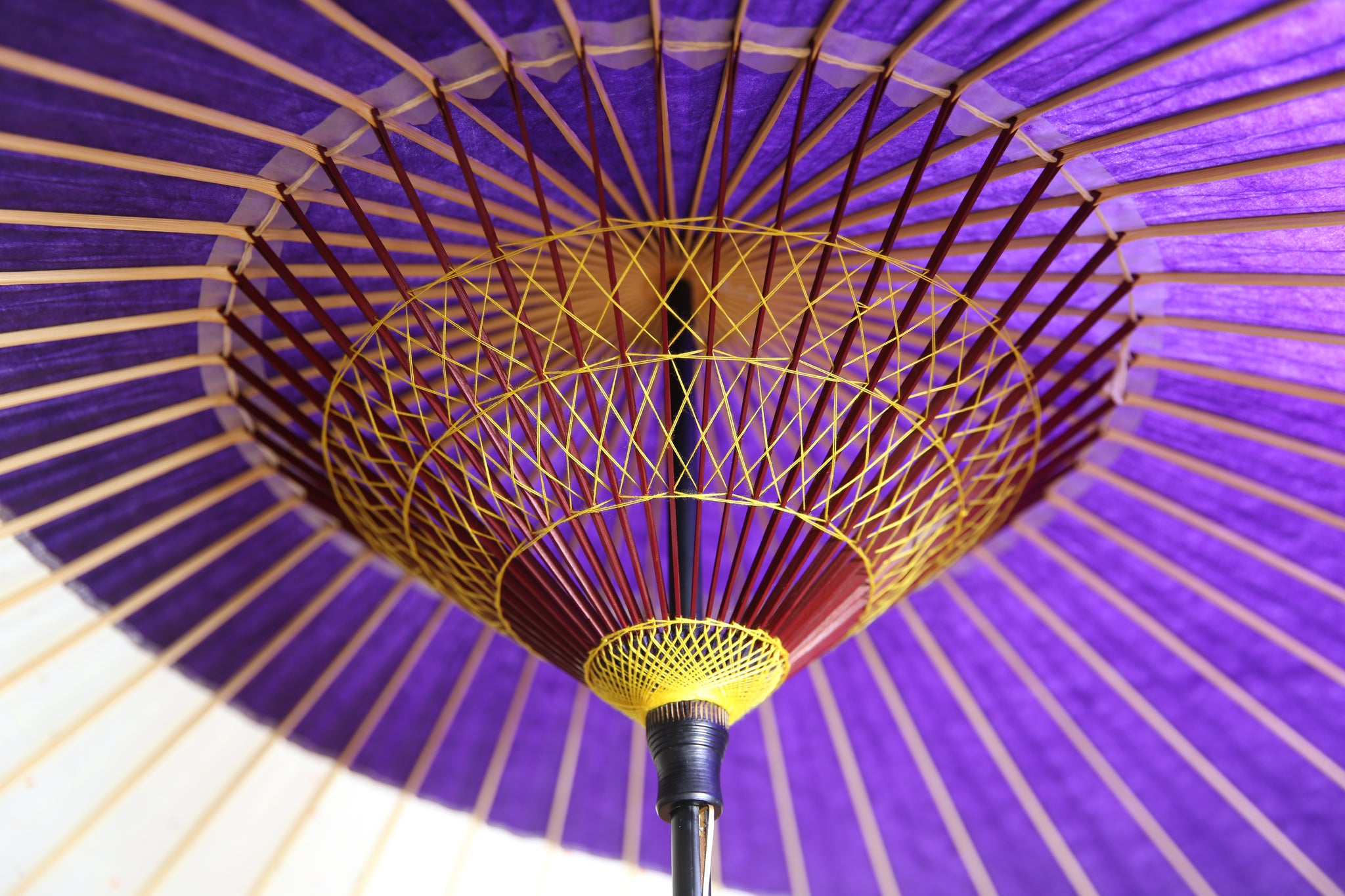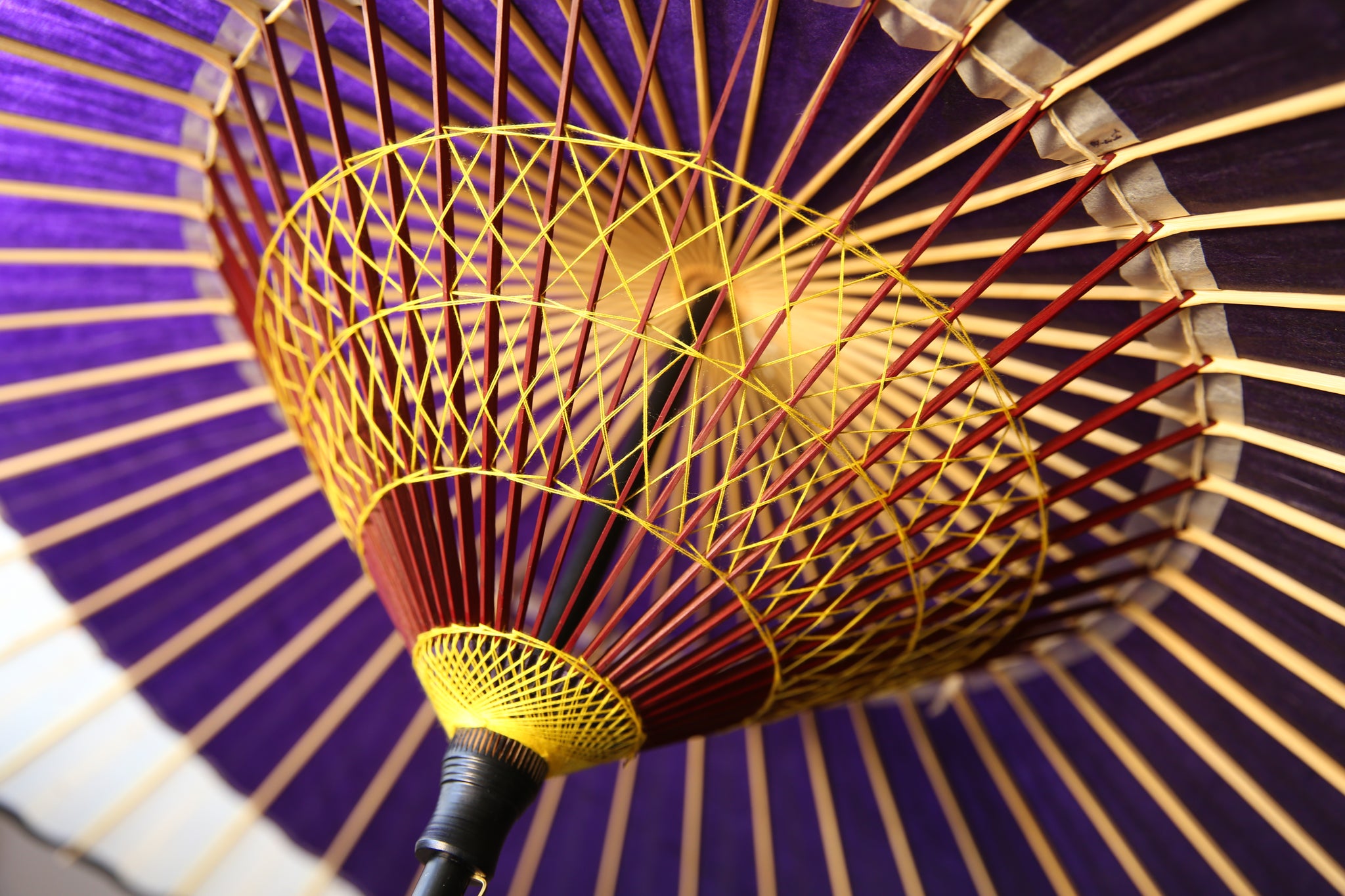 和傘の骨組みは、1本の竹を均等に割り、傘を畳んだ際に元の竹に戻るように組まれています。