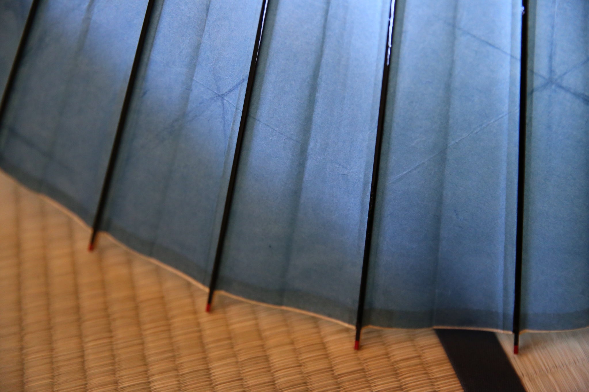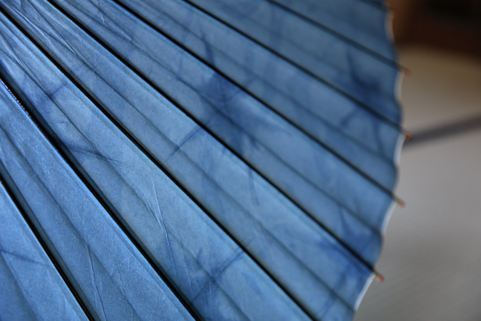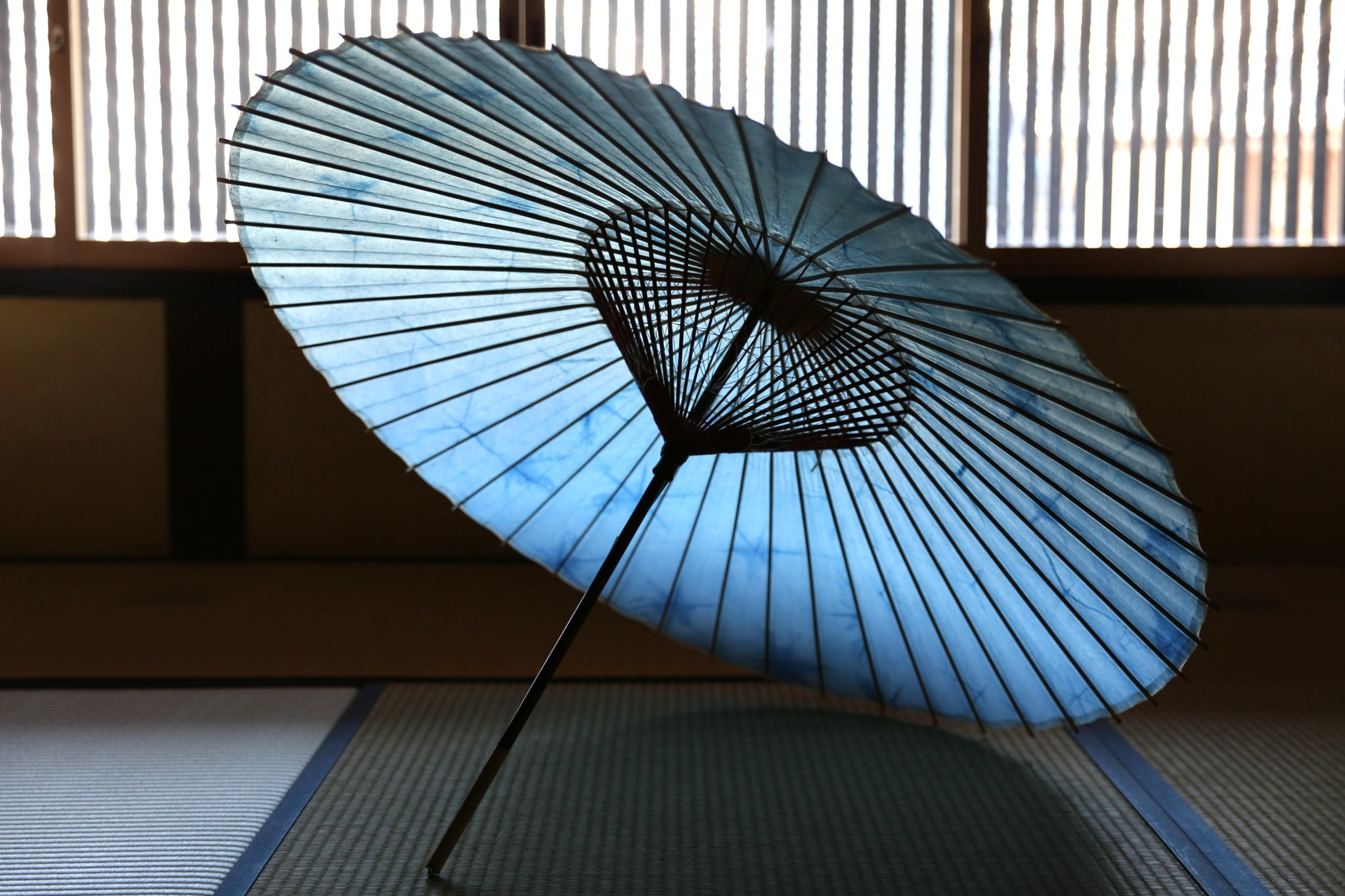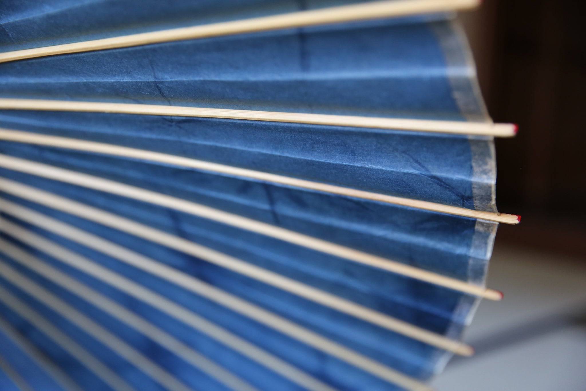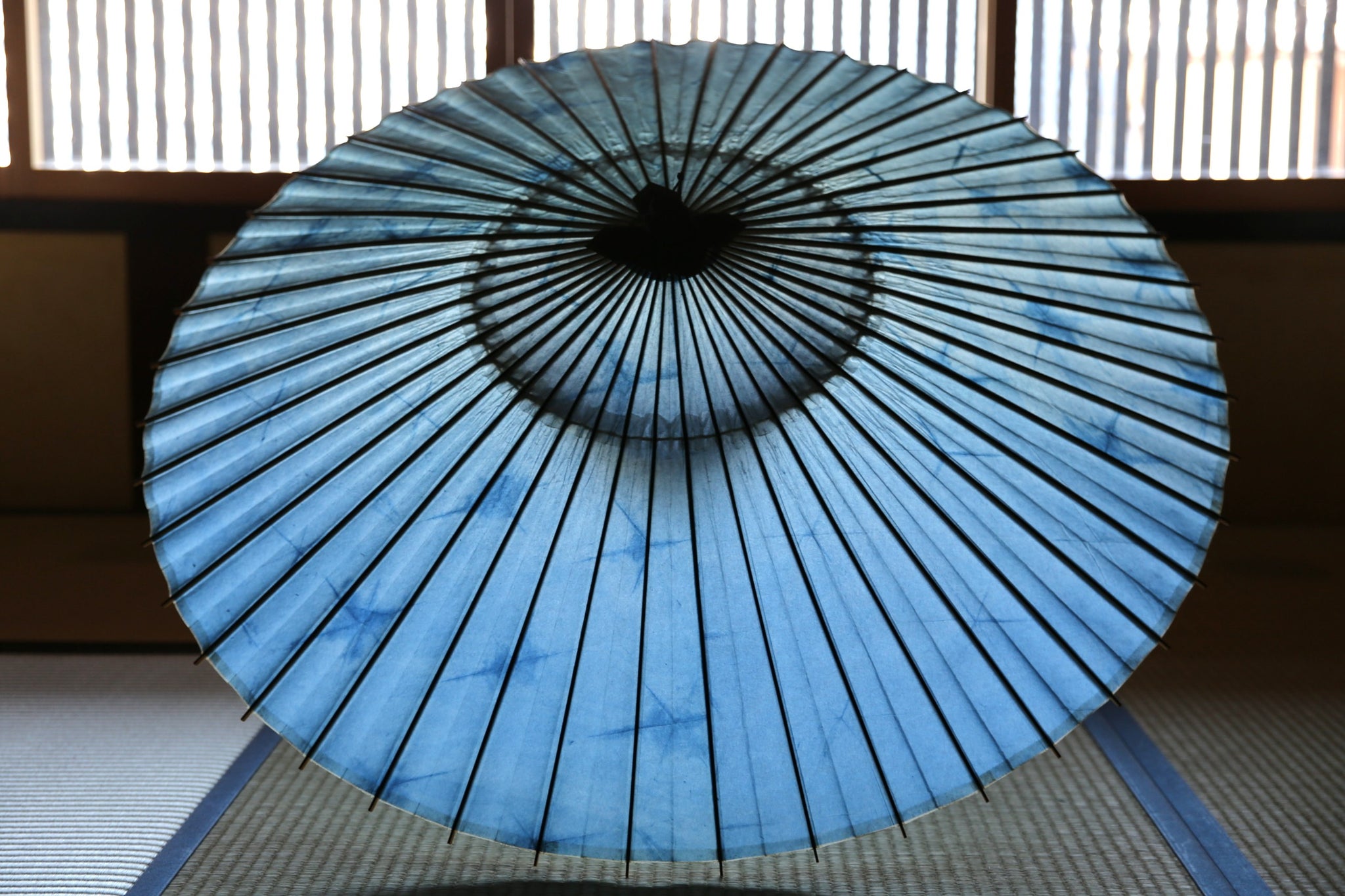 岐阜の石徹白で育った藍で染められた美濃手漉き和紙を、和傘に仕立てた紛れもなく一点もののスペシャルコラボ和傘。