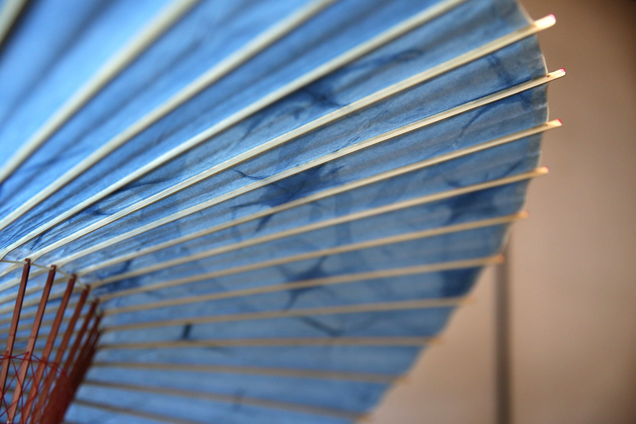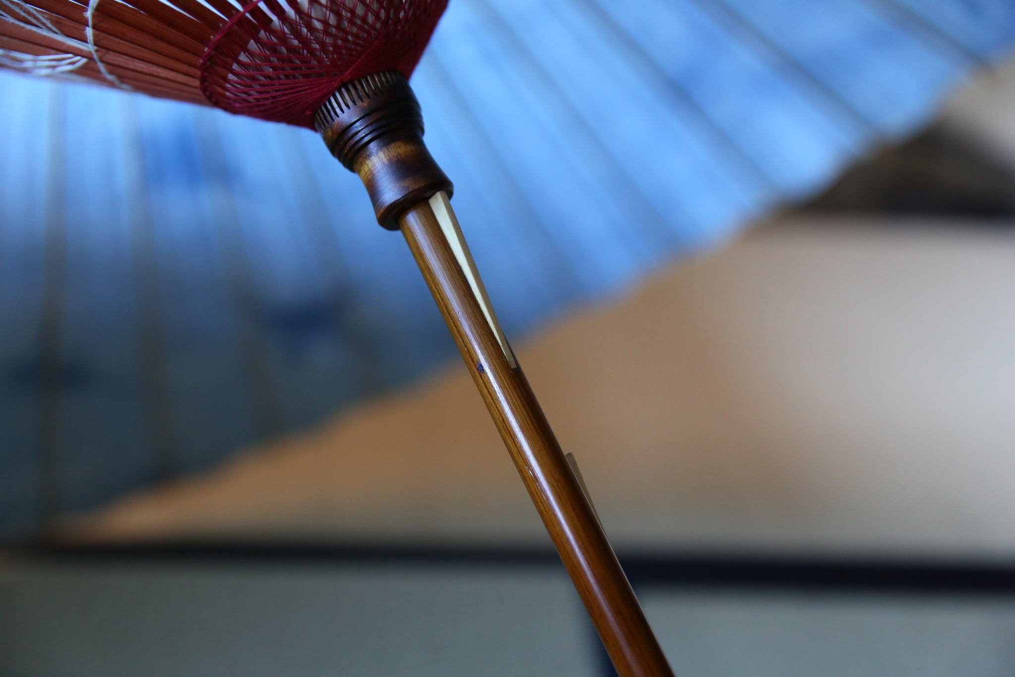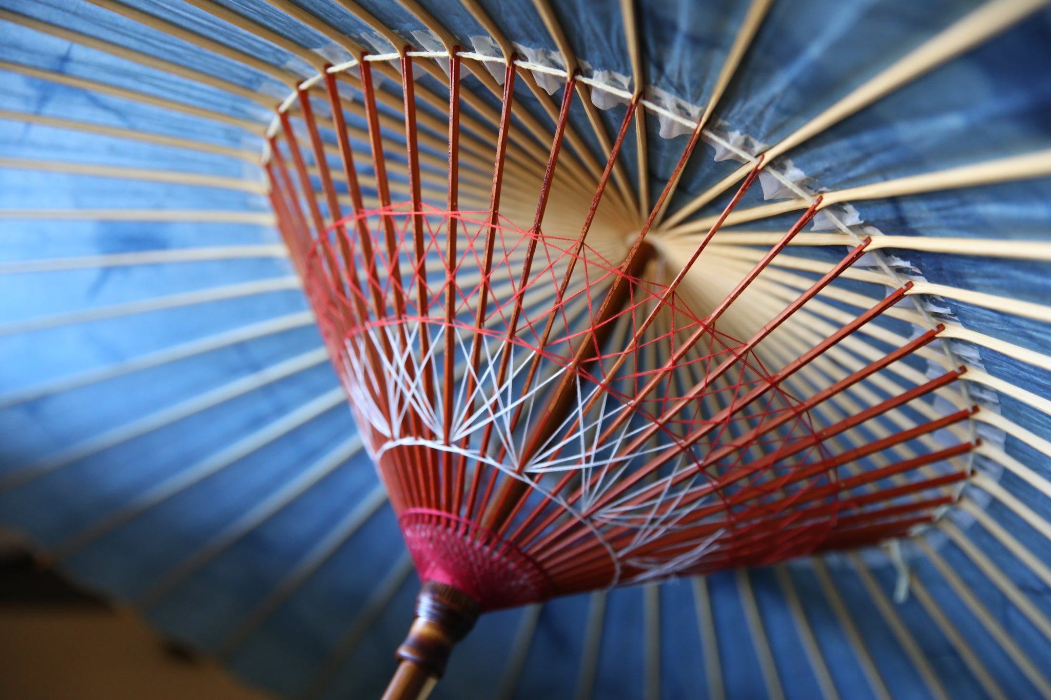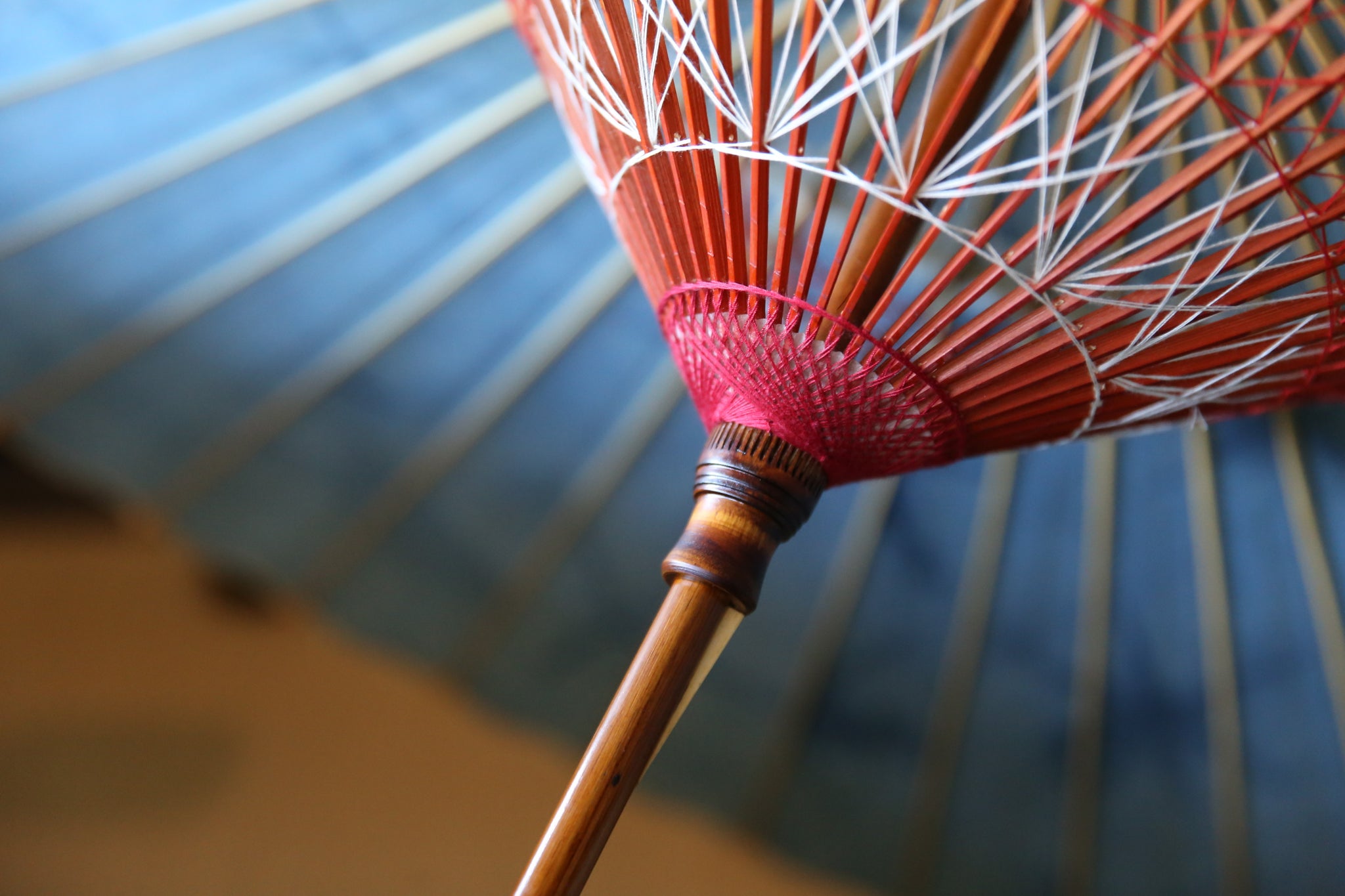 和傘の骨組みは、1本の竹を均等に割り、傘を畳んだ際に元の竹に戻るように組まれています。
