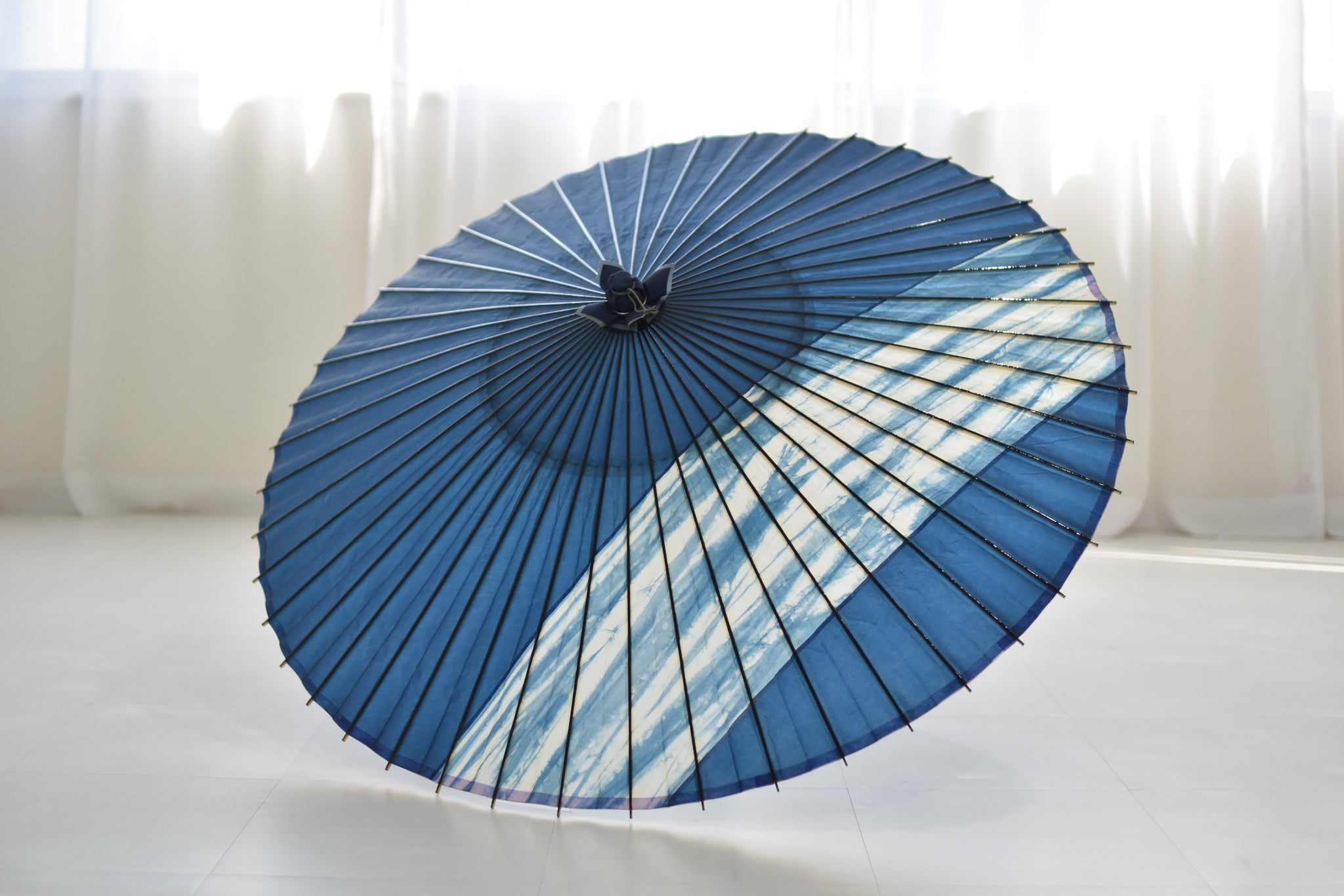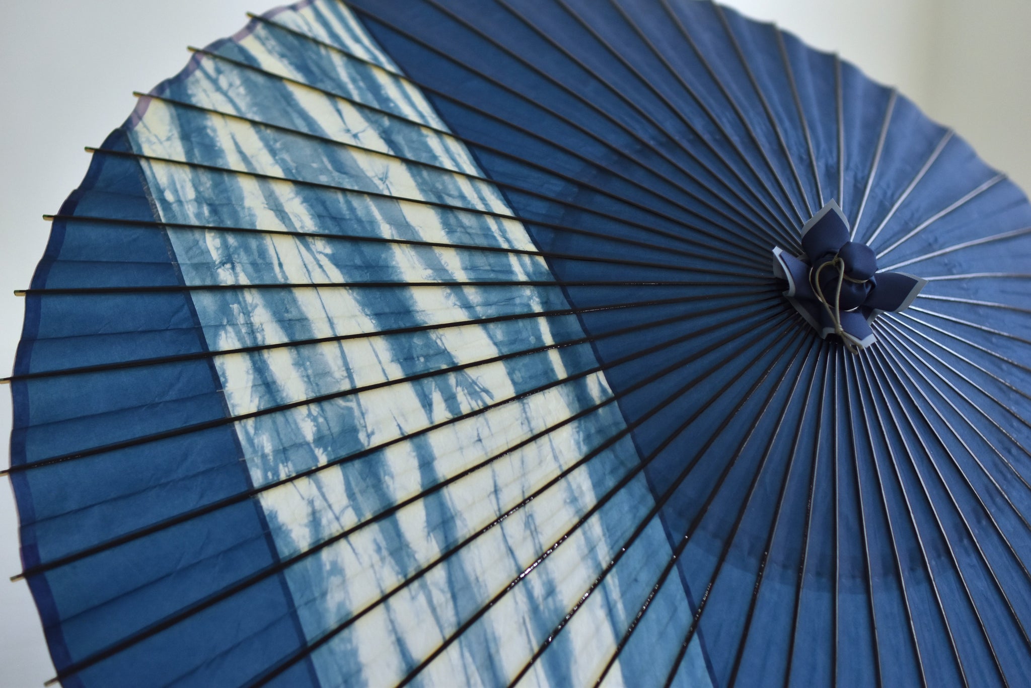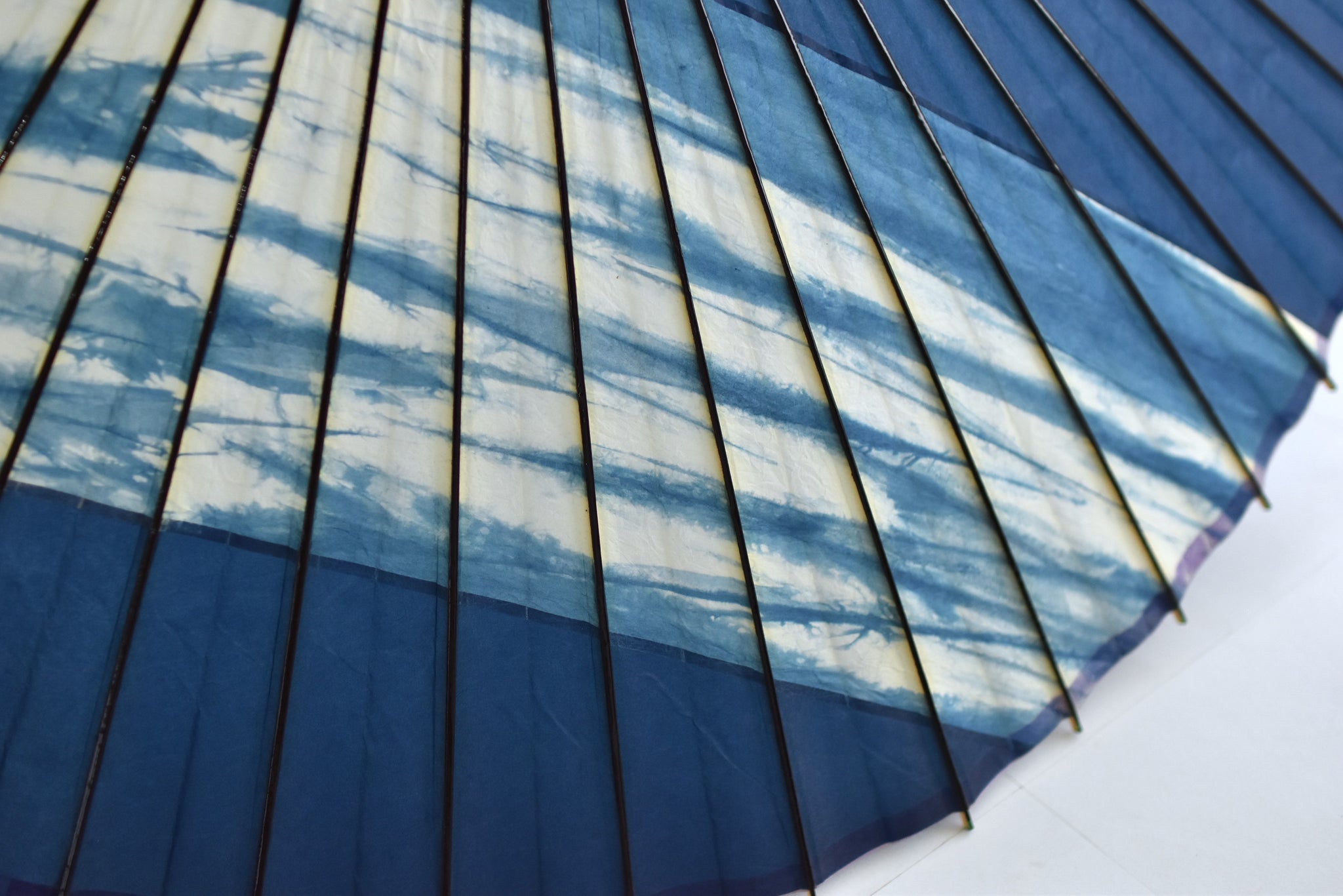 和紙を折り、染めを施され作られた柳の模様は、藍色と白とのコントラストが美しい。