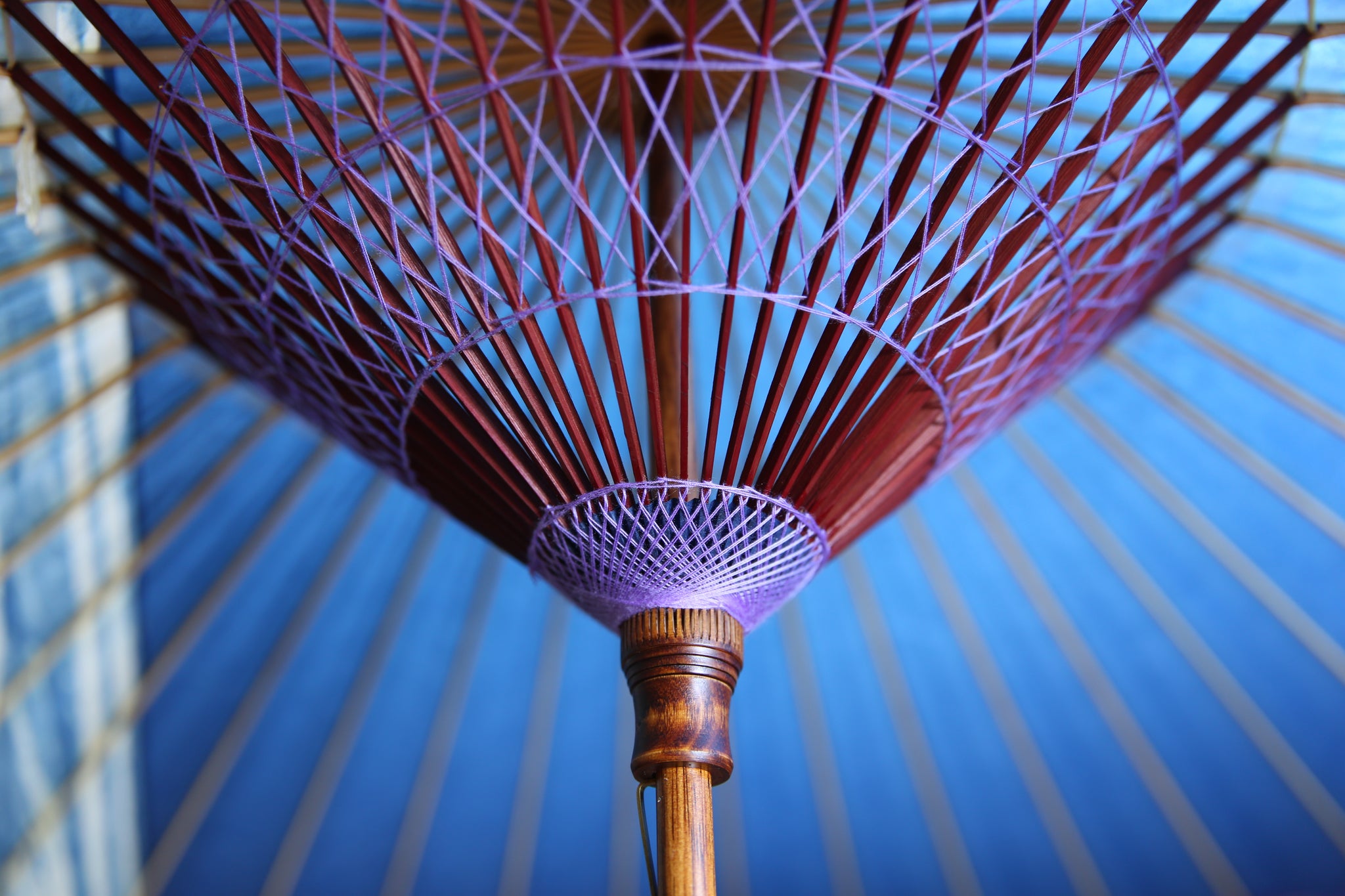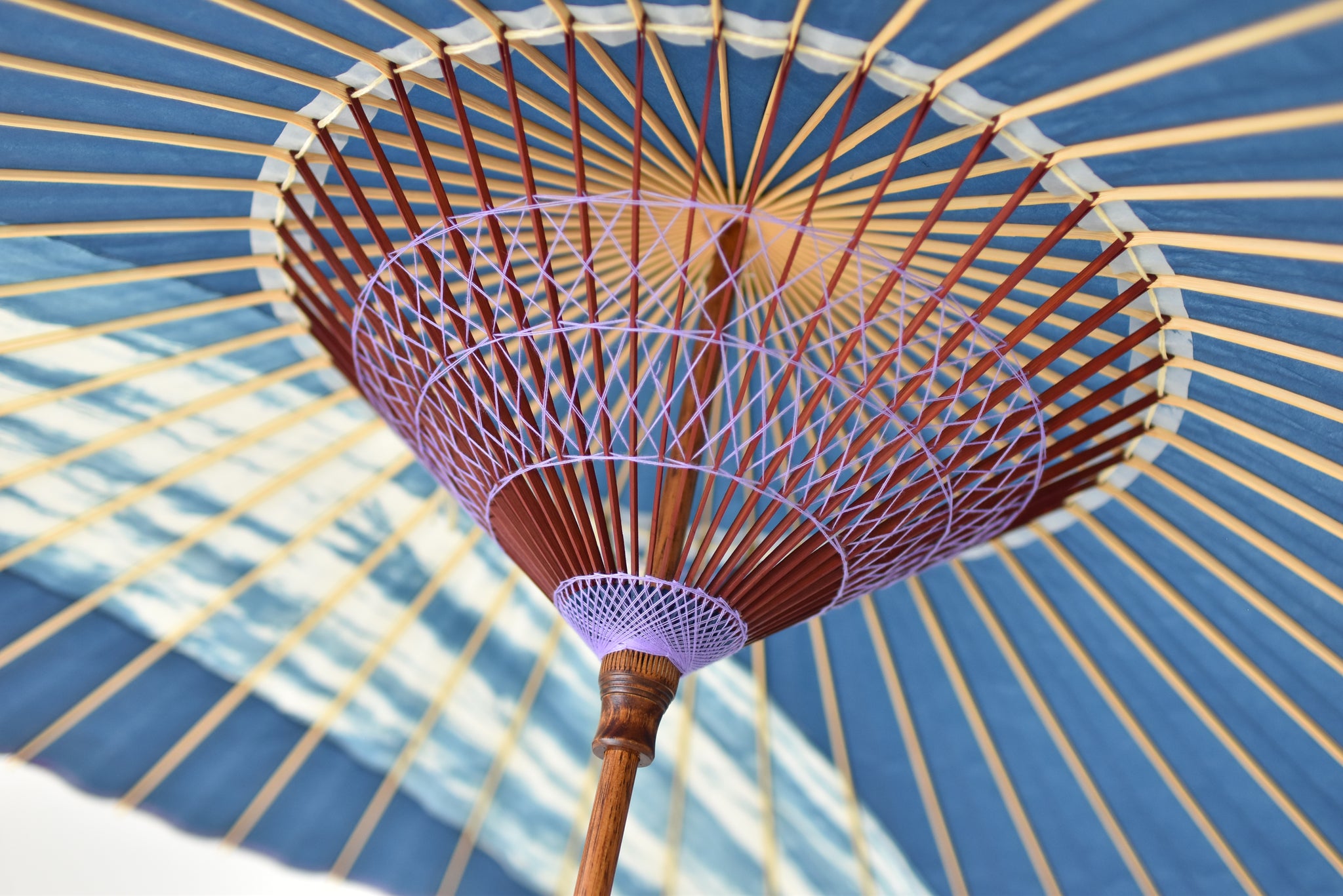 和傘の骨組みは、1本の竹を均等に割り、傘を畳んだ際に元の竹に戻るように組まれています。