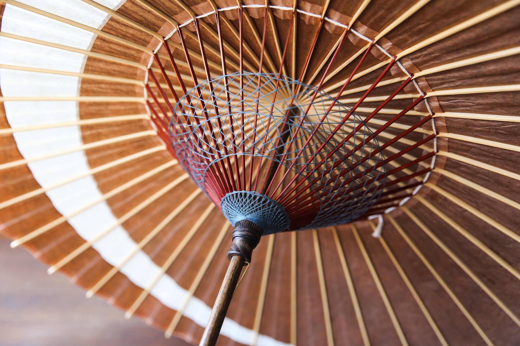和傘の骨組みは、1本の竹を均等に割り、傘を畳んだ際に元の竹に戻るように組まれています。