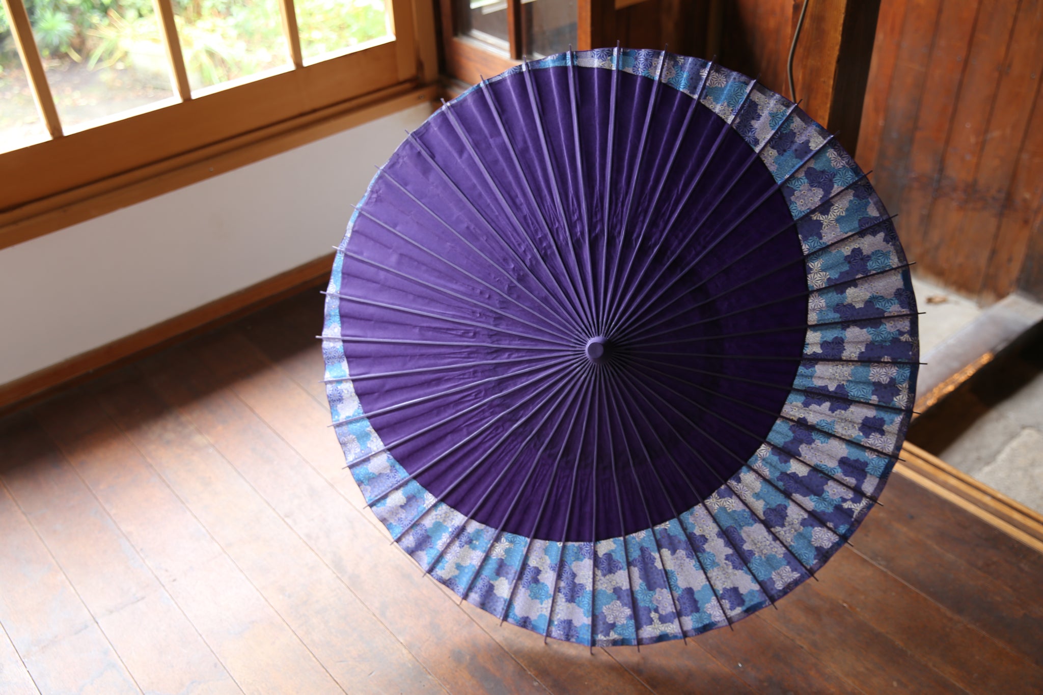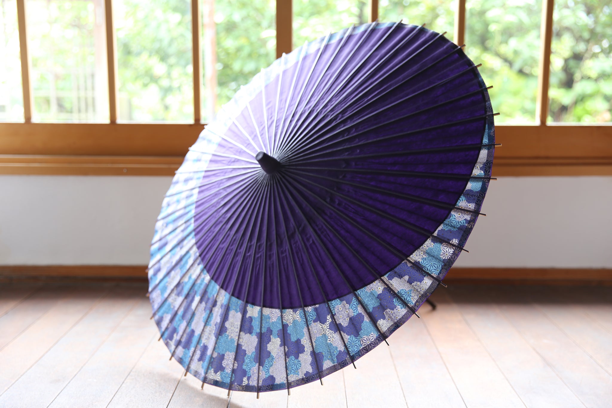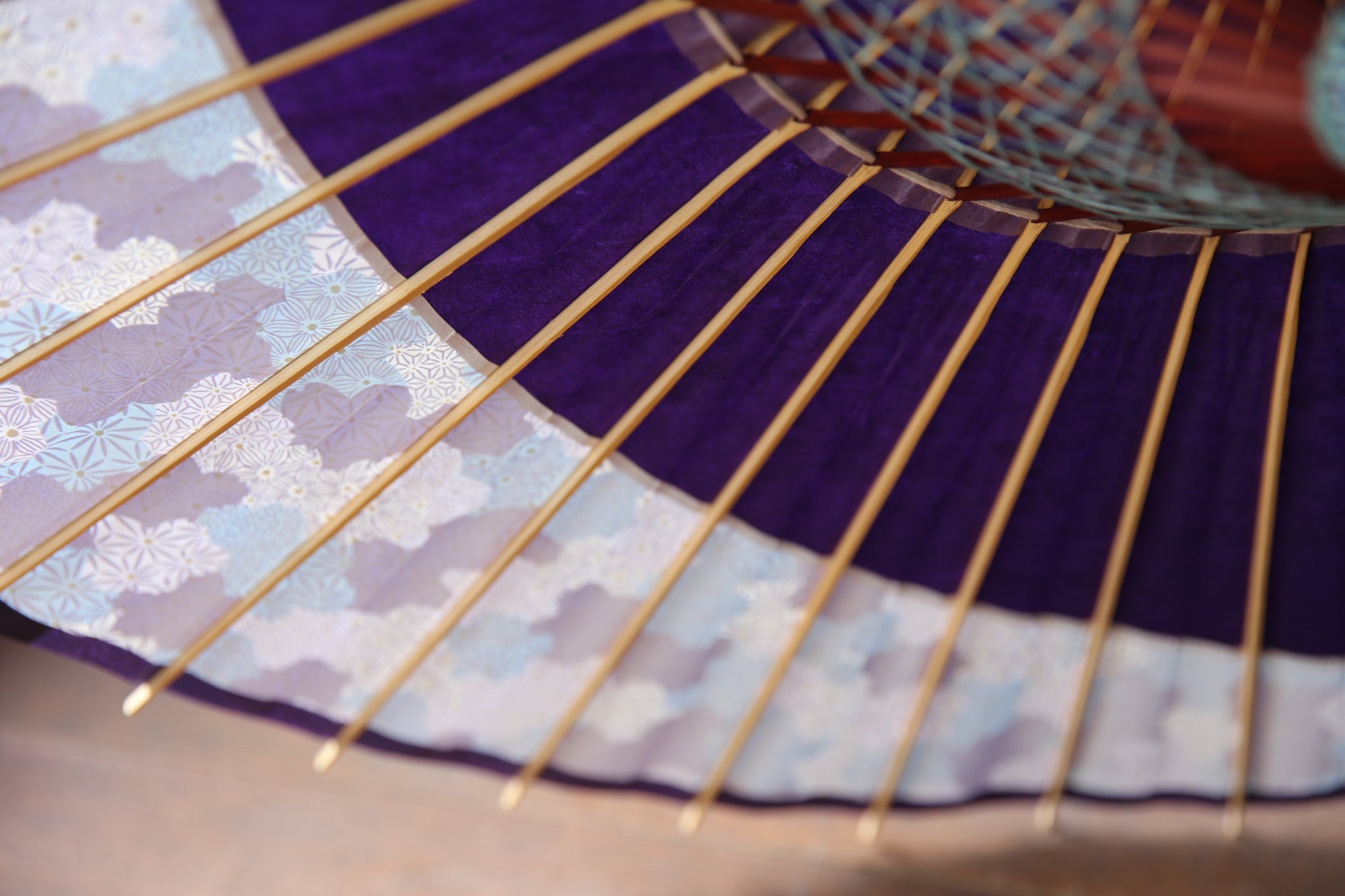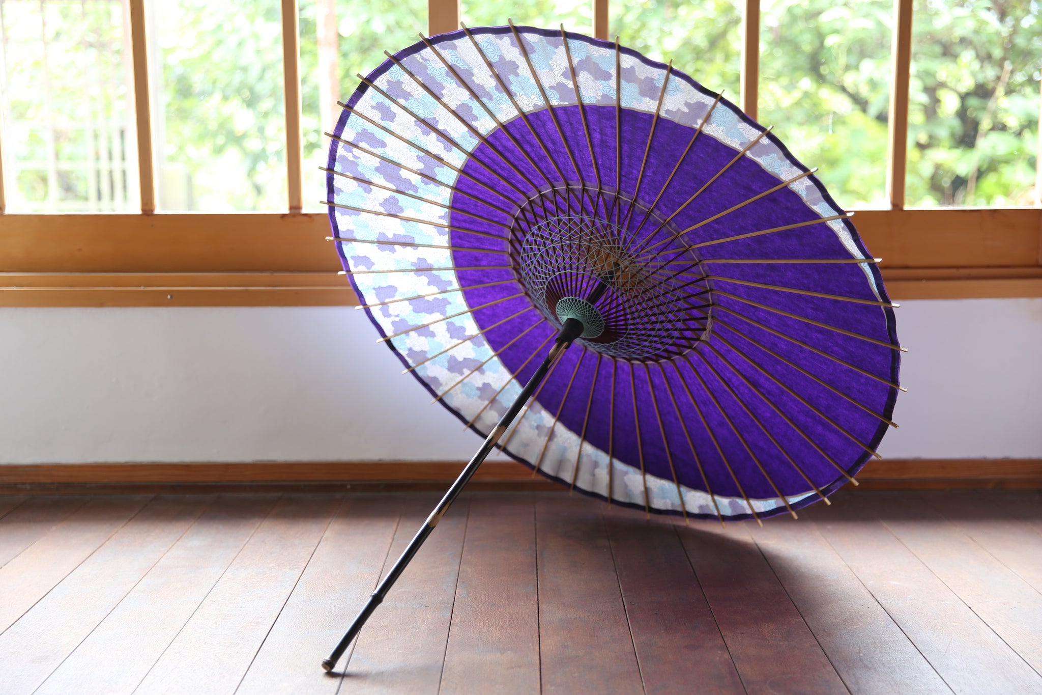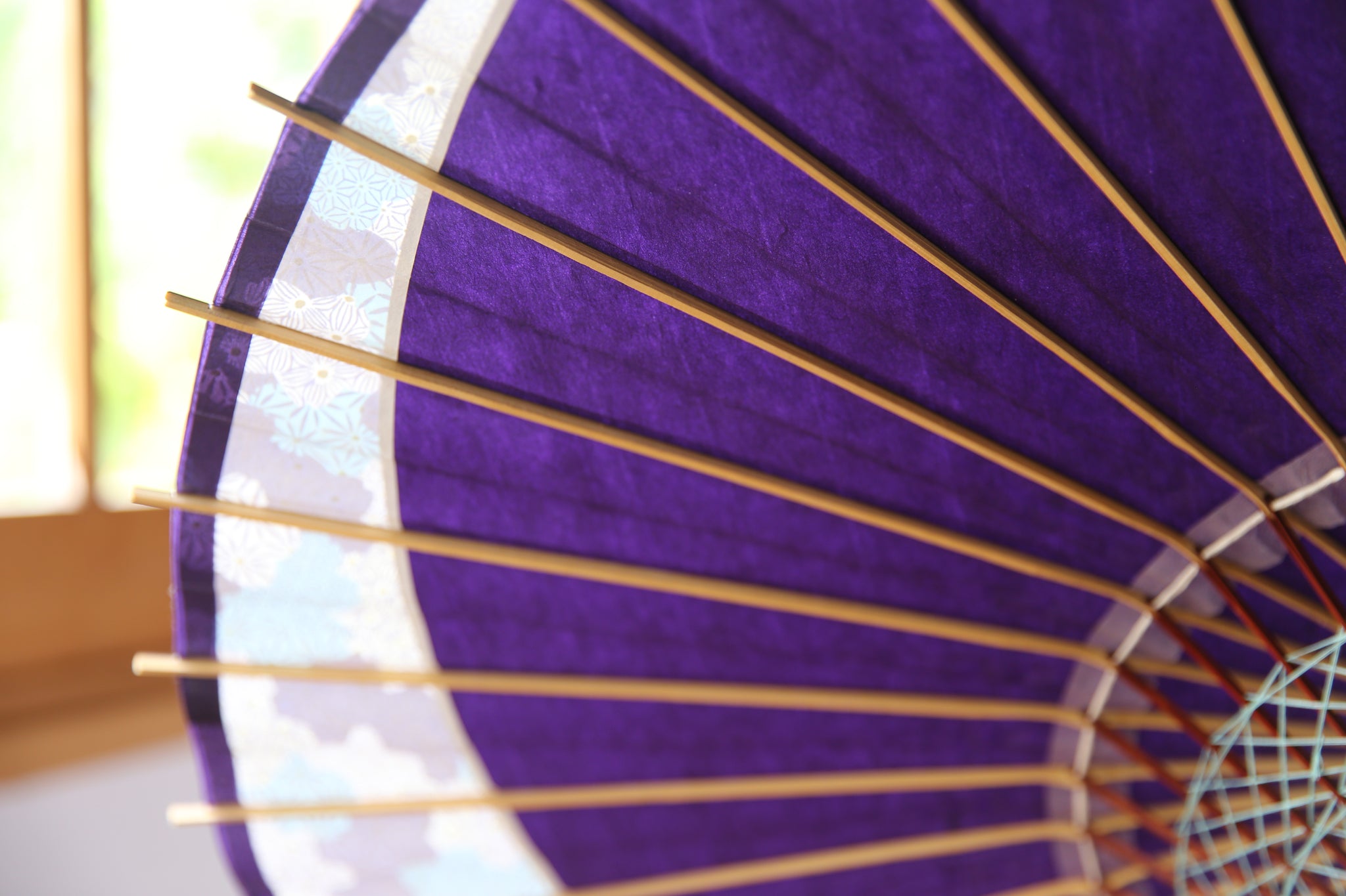 骨の塗装も紫で和紙との統一感があり、糸かがりの色は水色で涼やかに。