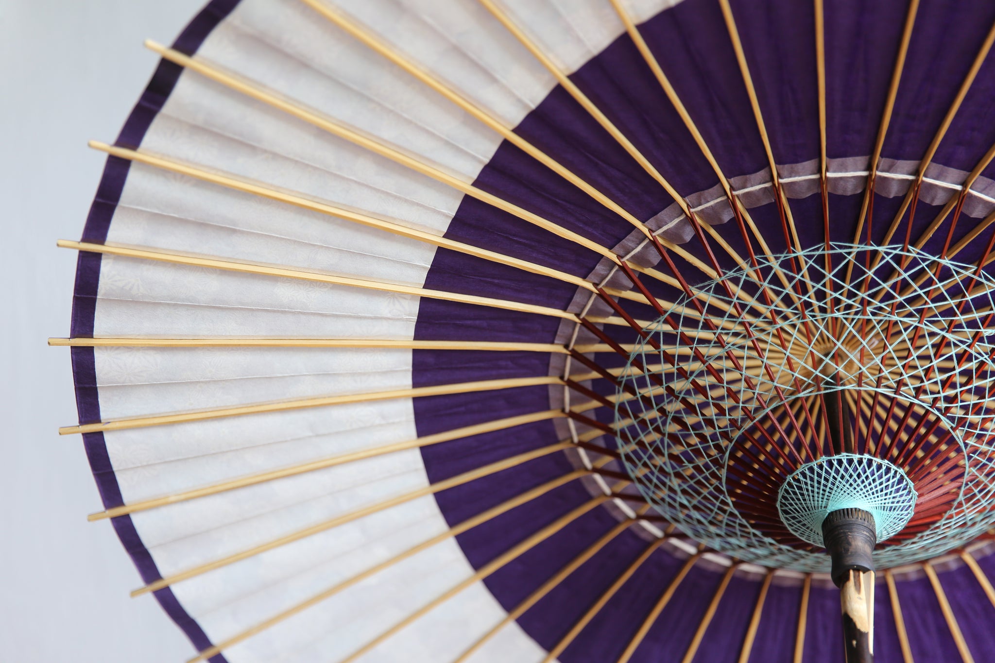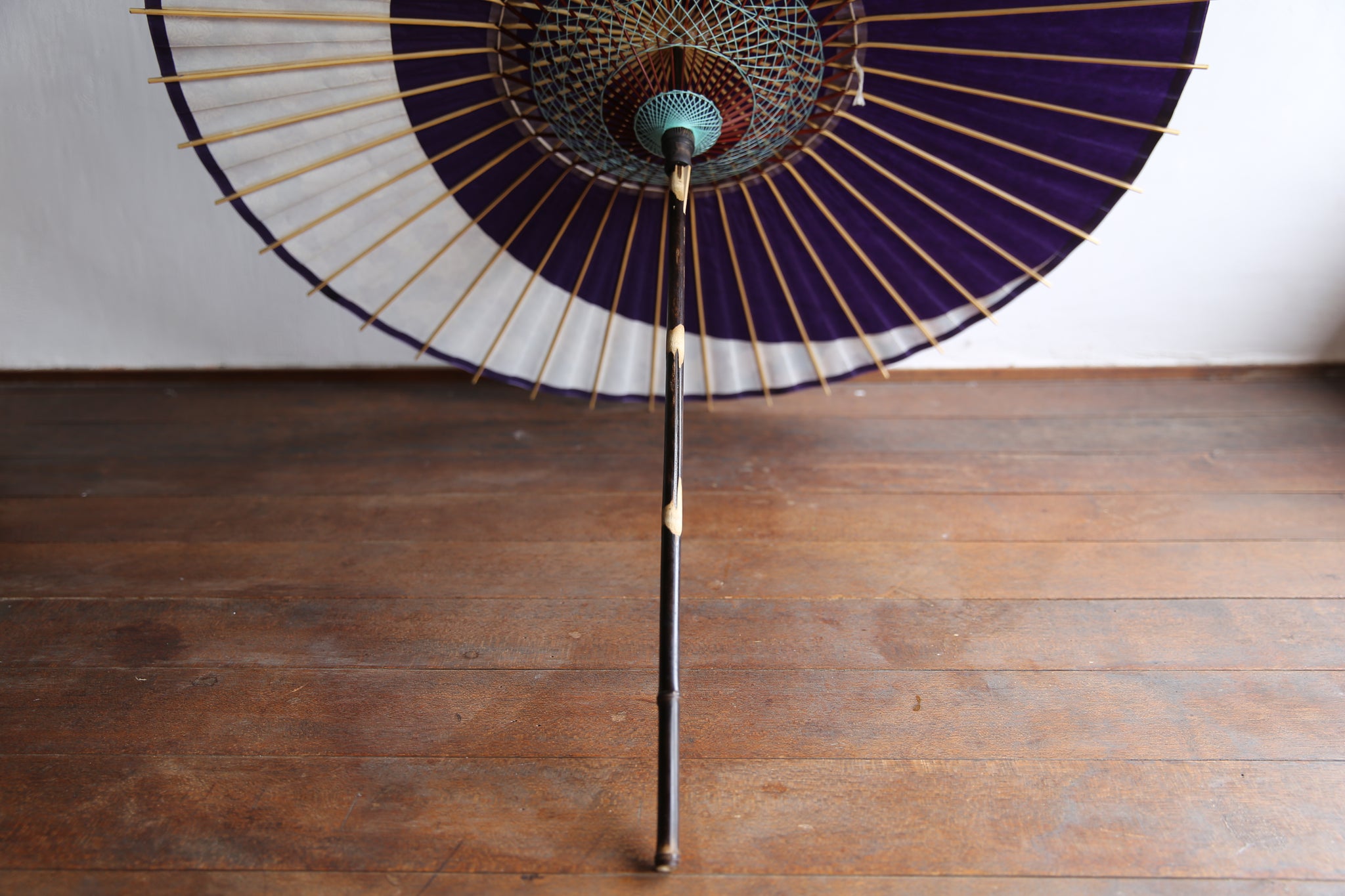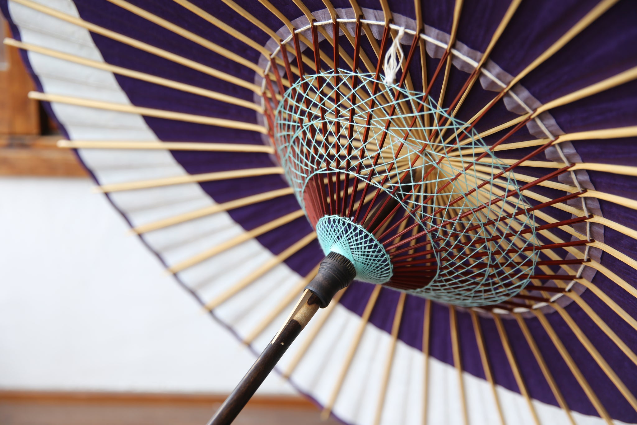 和傘の骨組みは、1本の竹を均等に割り、傘を畳んだ際に元の竹に戻るように組まれています。