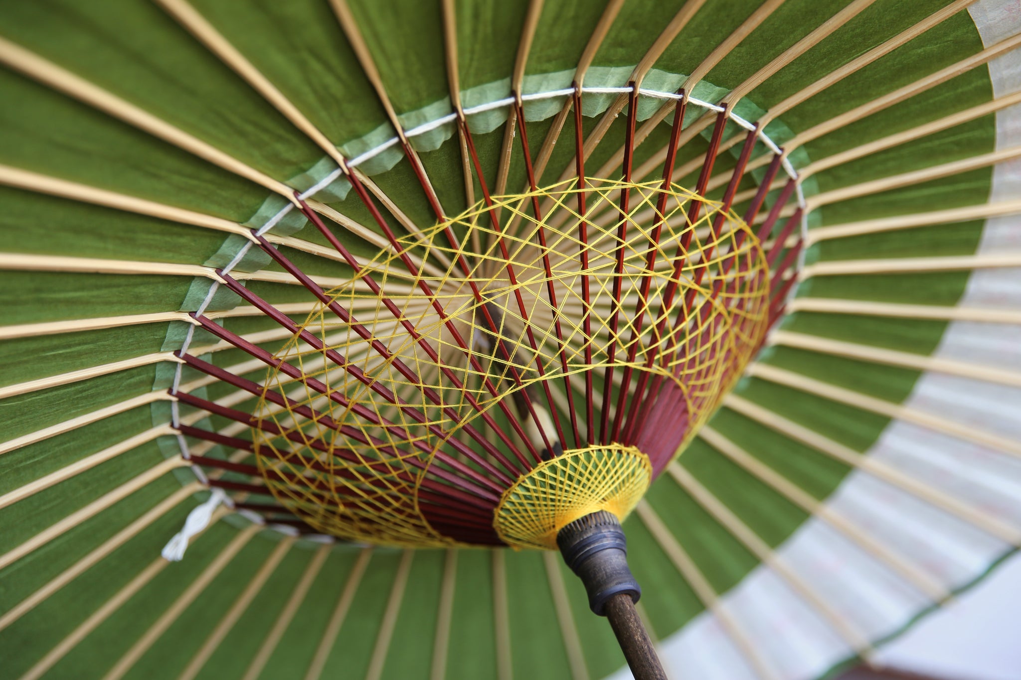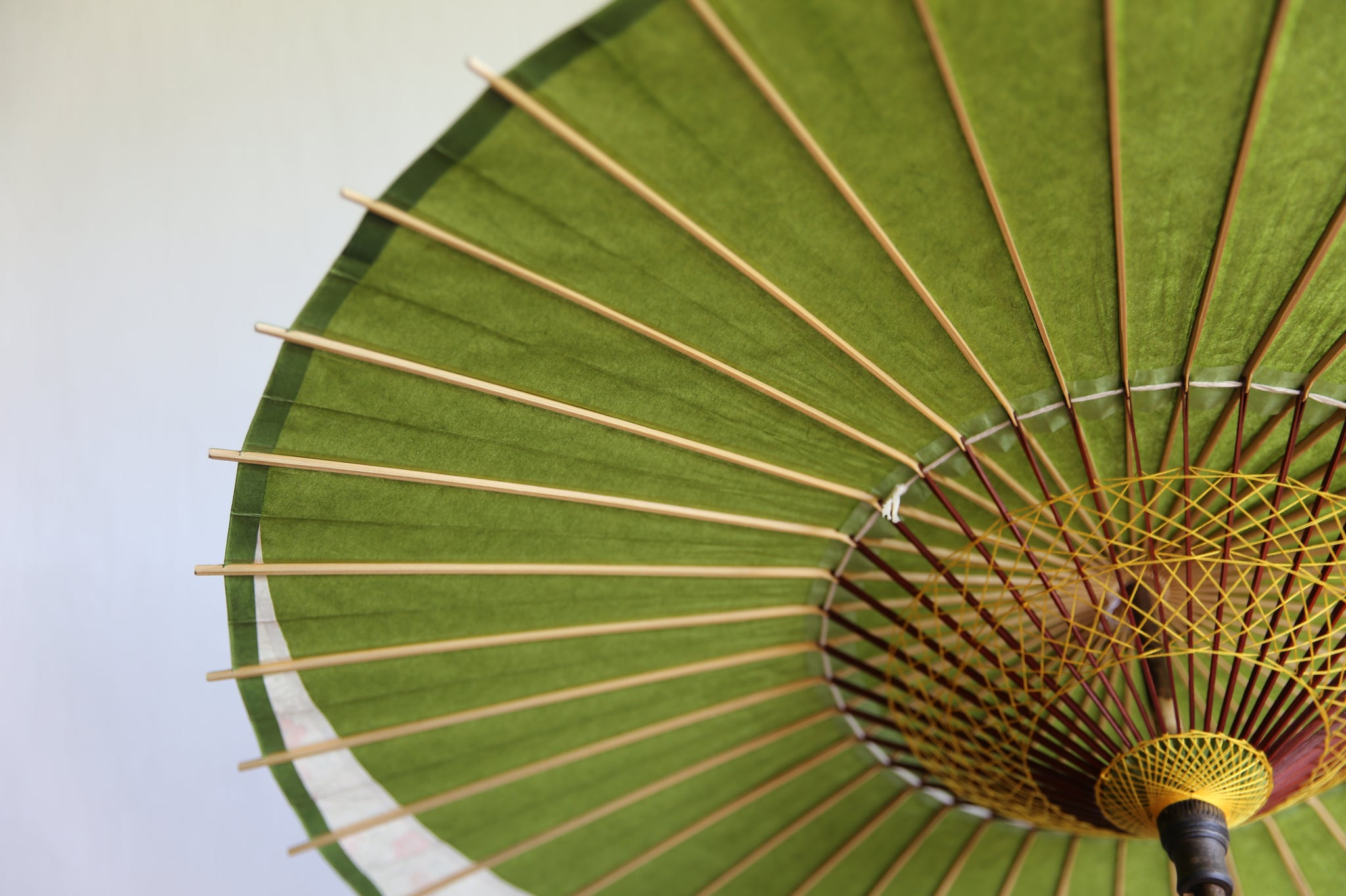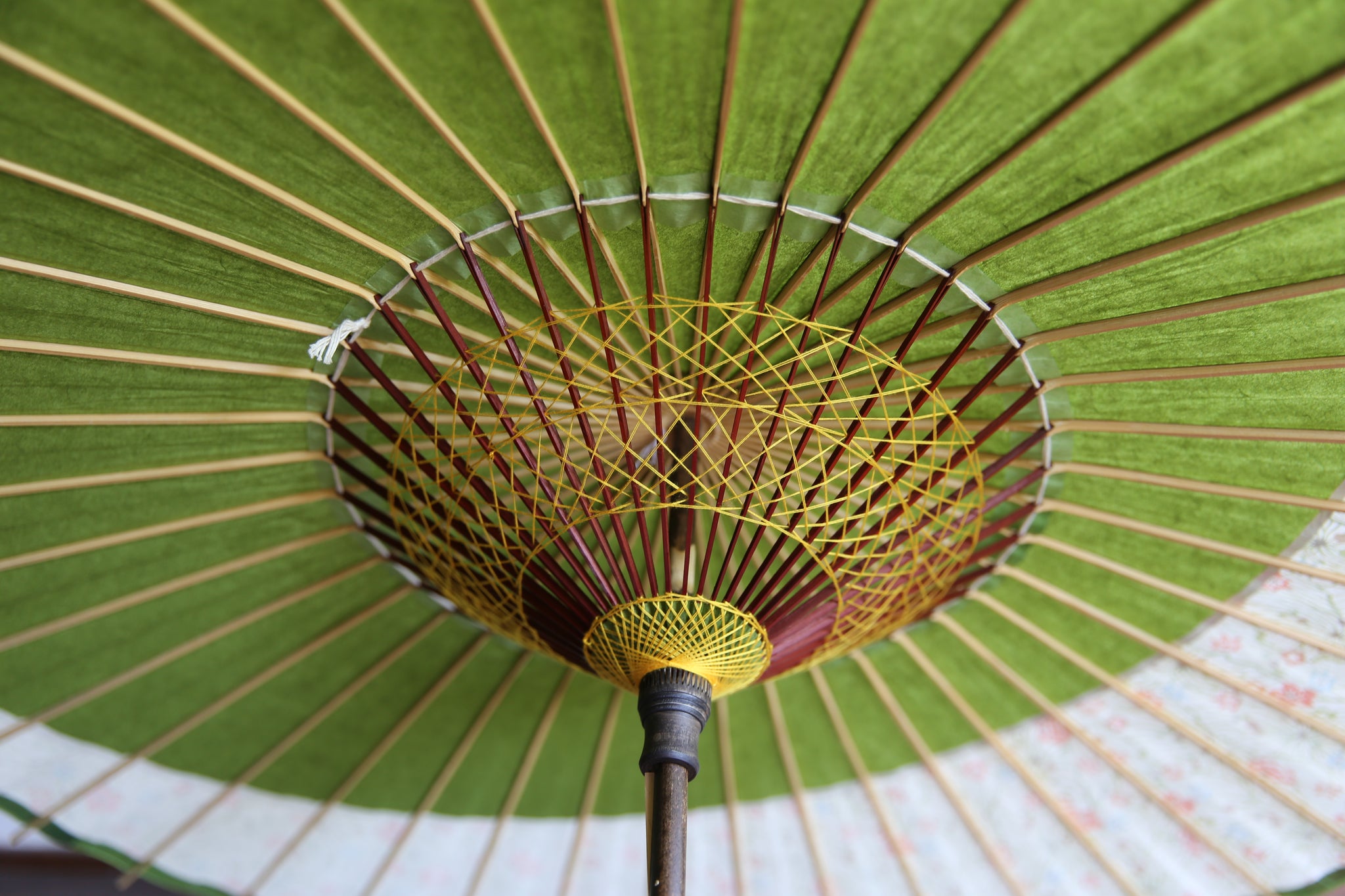 和傘の骨組みは、1本の竹を均等に割り、傘を畳んだ際に元の竹に戻るように組まれています。