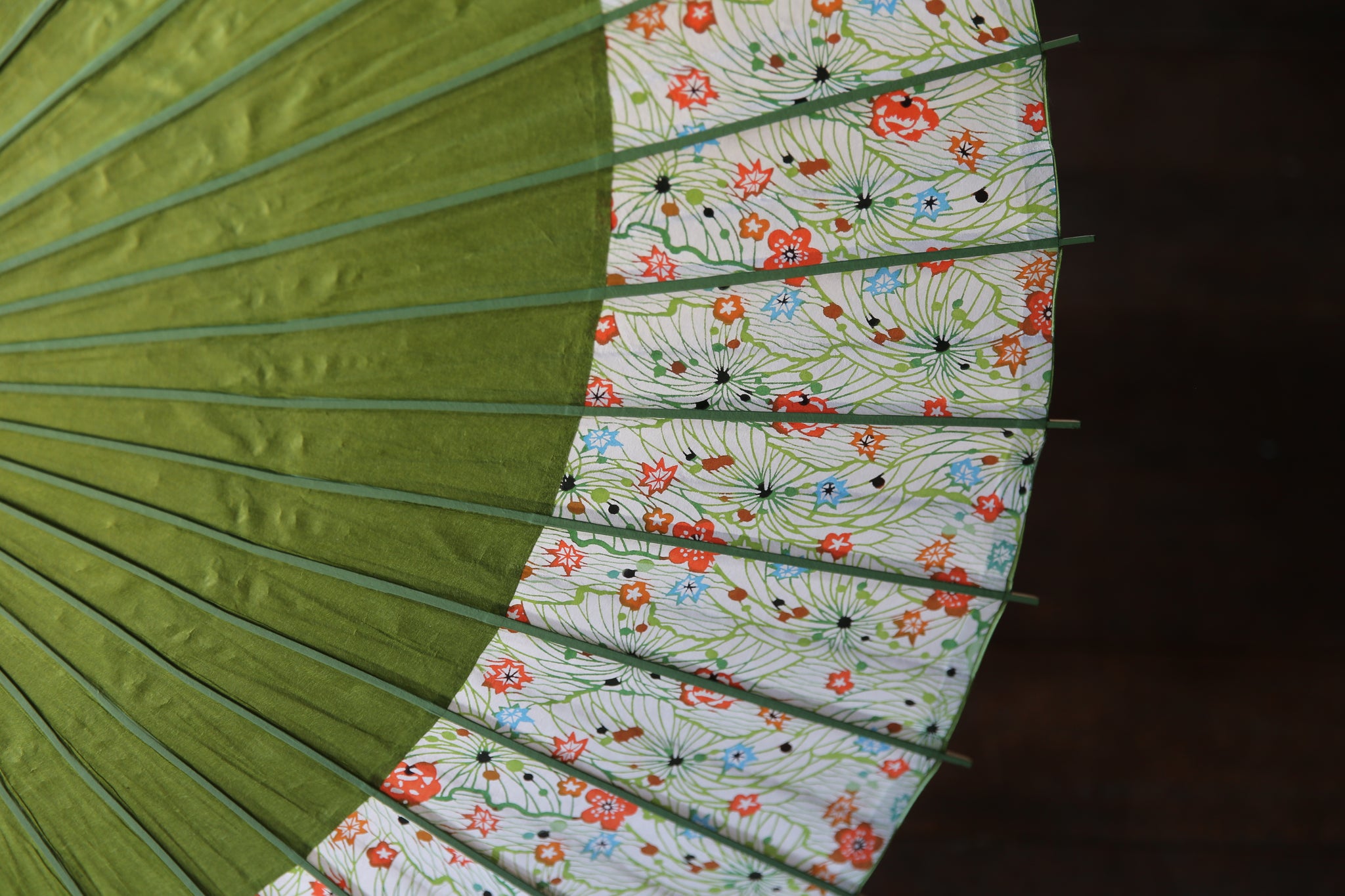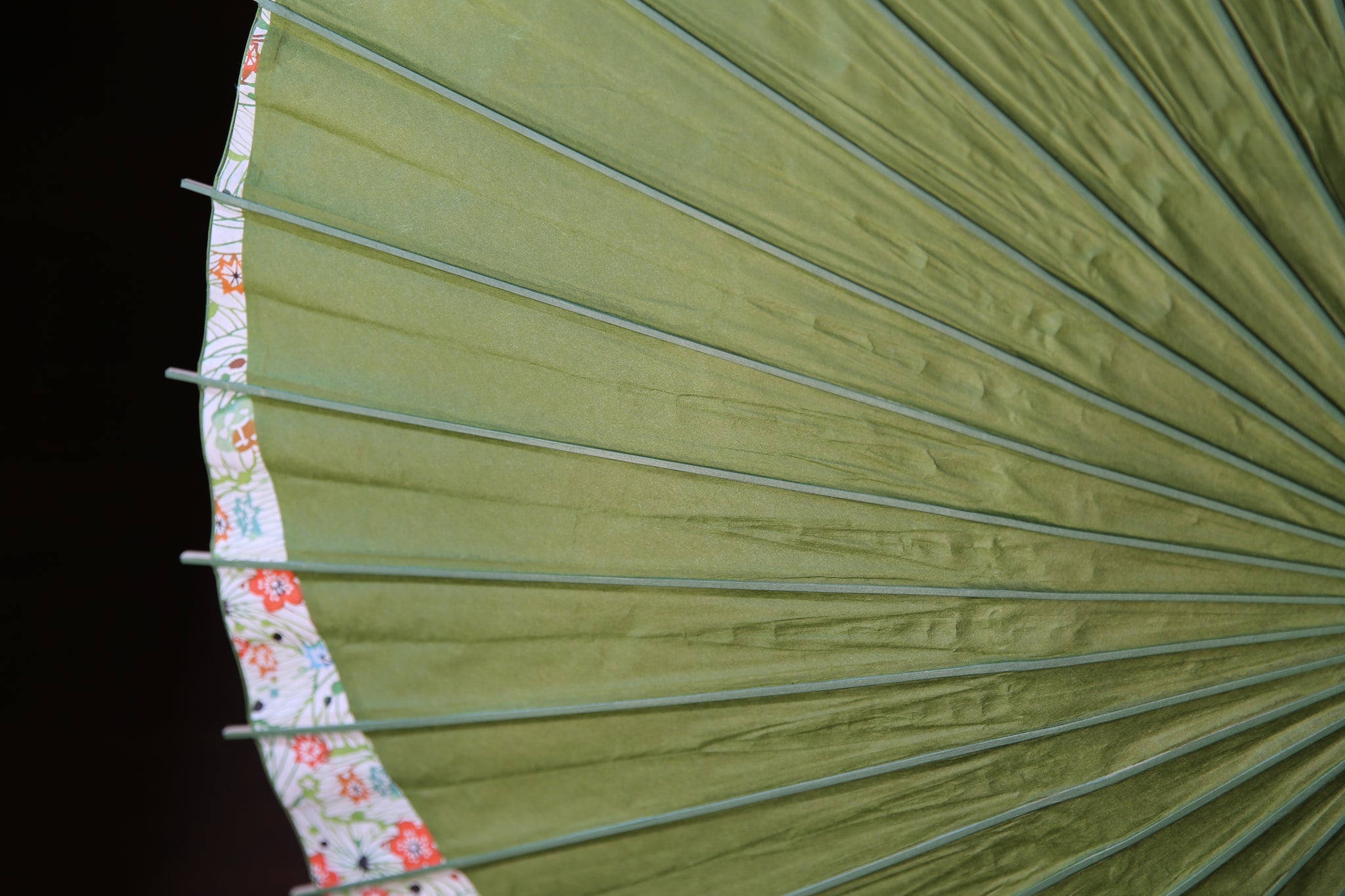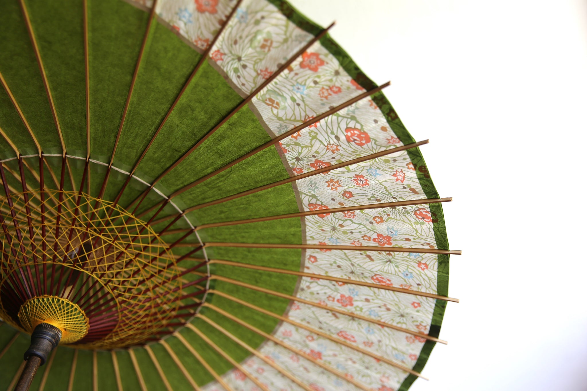 和傘の骨組みは、1本の竹を均等に割り、傘を畳んだ際に元の竹に戻るように組まれています。