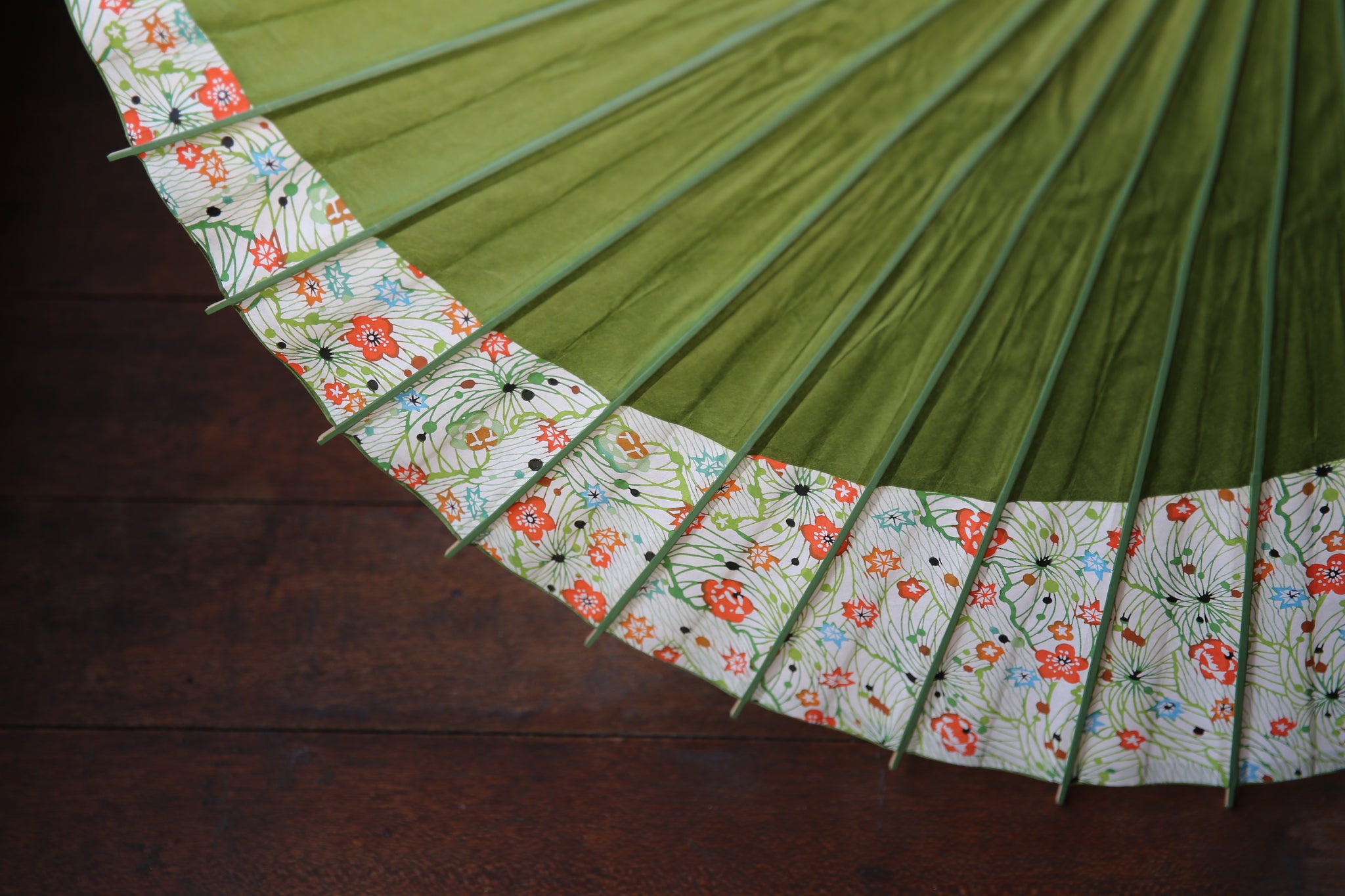 無地の鶯色とオレンジ系の花柄の組み合わせ。抹茶のようにも感じる深い黄緑が清々しい。