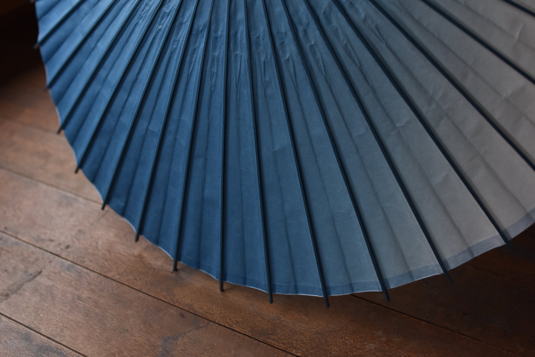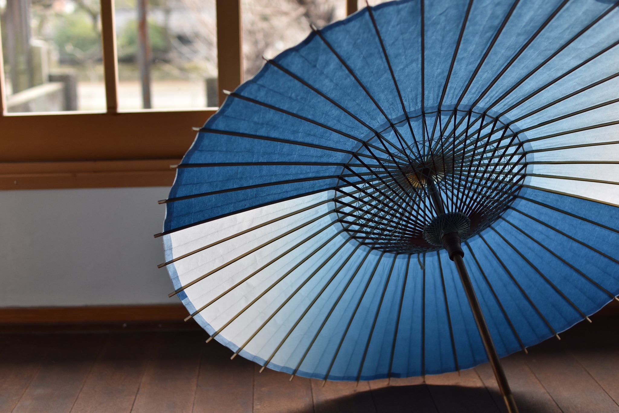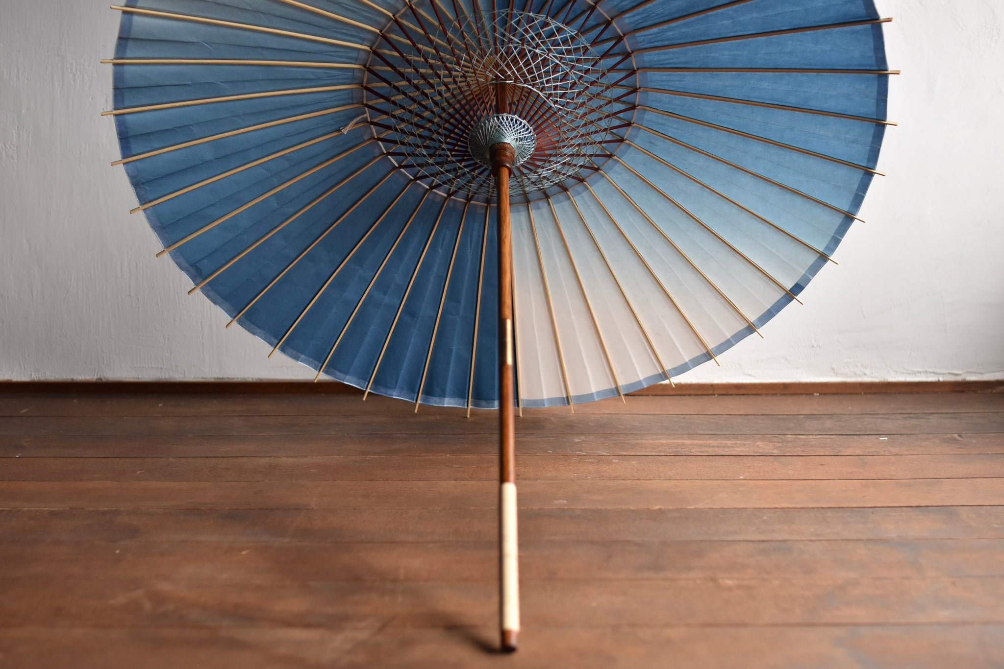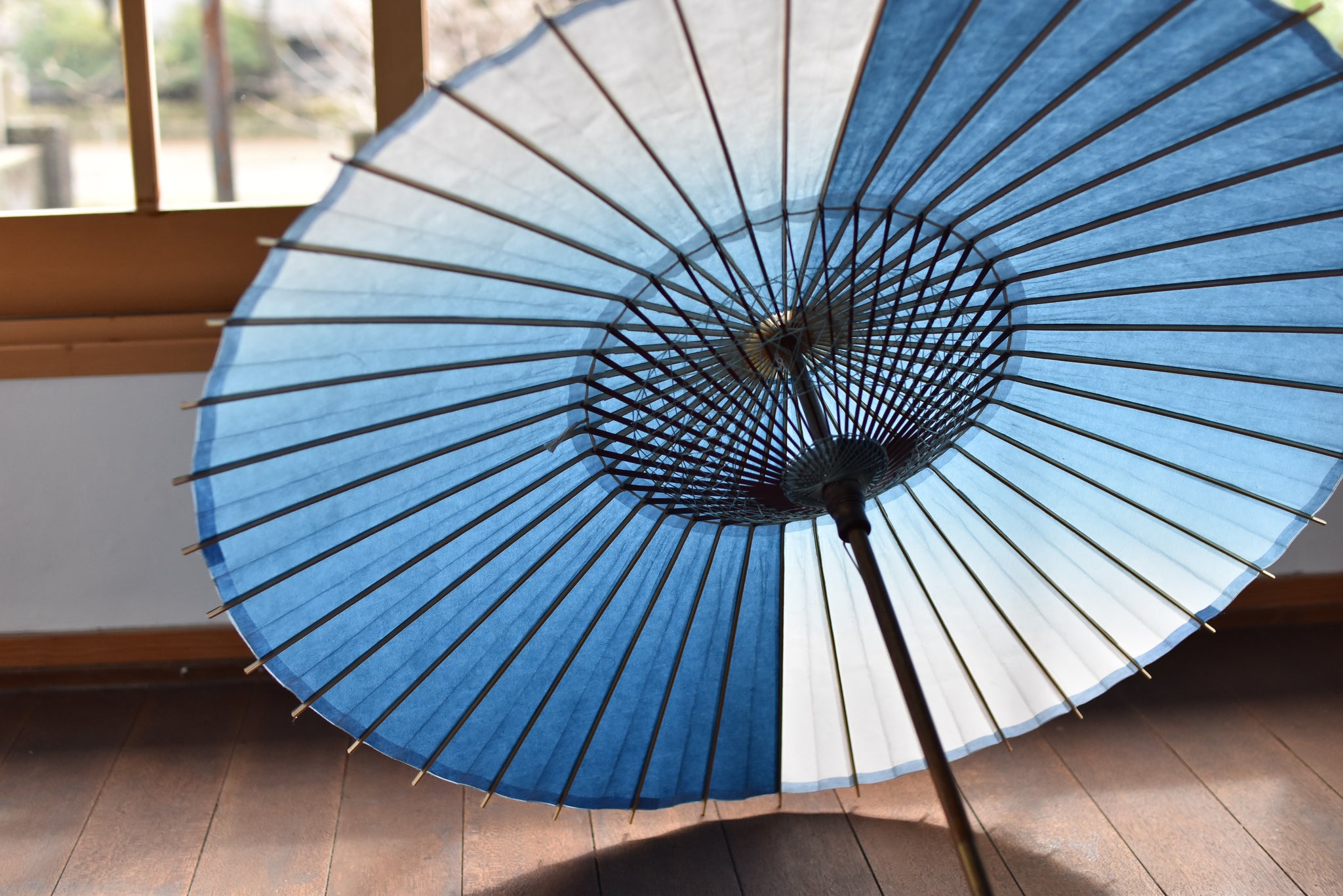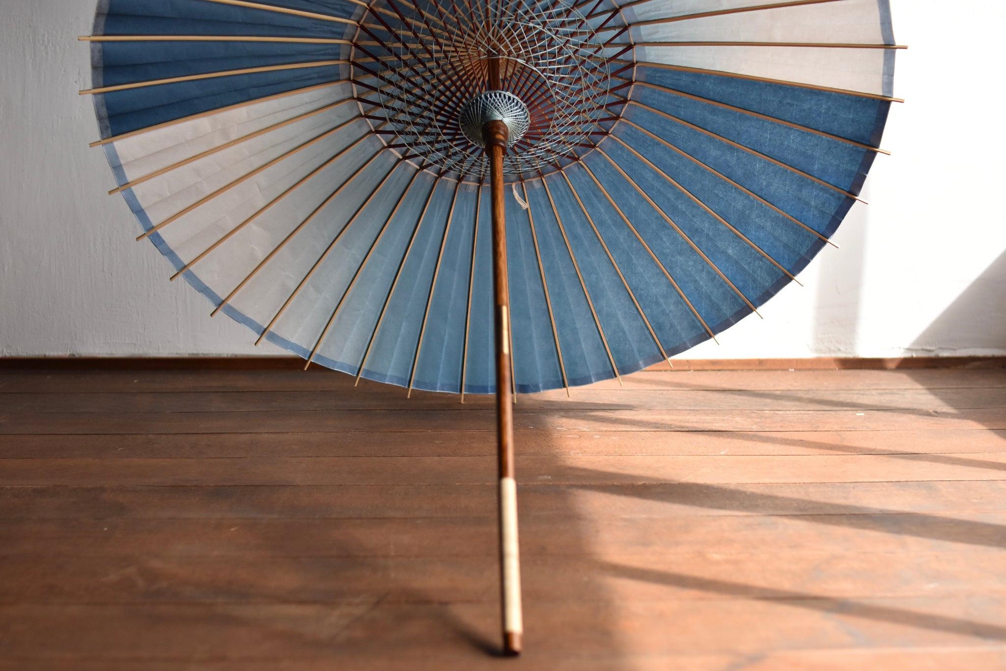 和傘職人であった、仐日和 河合幹子さんのお祖母様が30年程前に製作された阿波和紙の藍染の日傘。