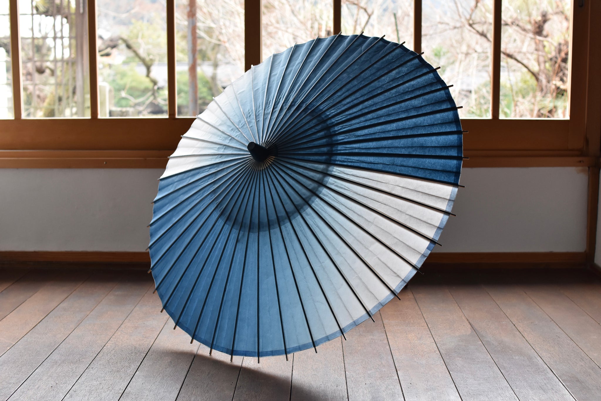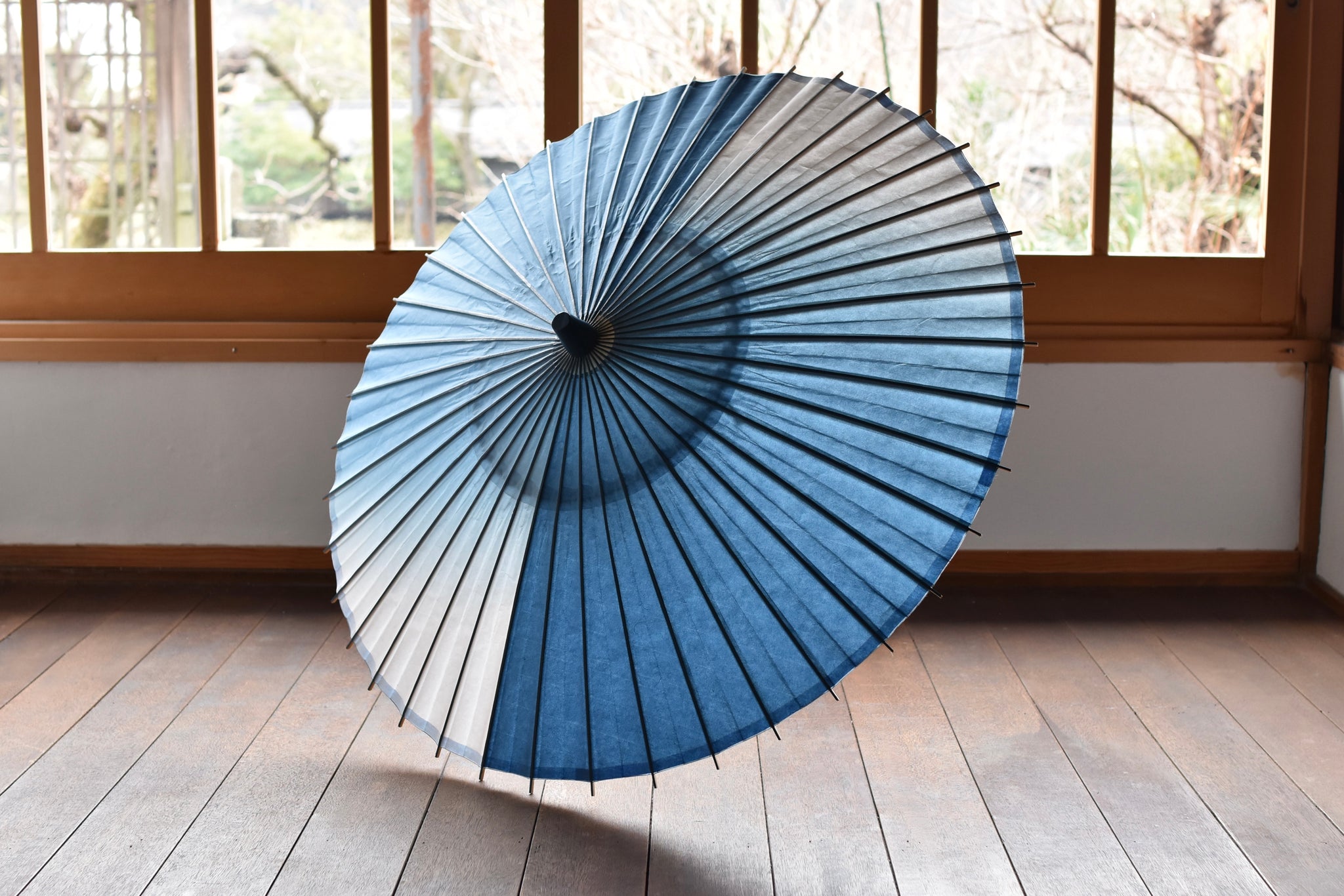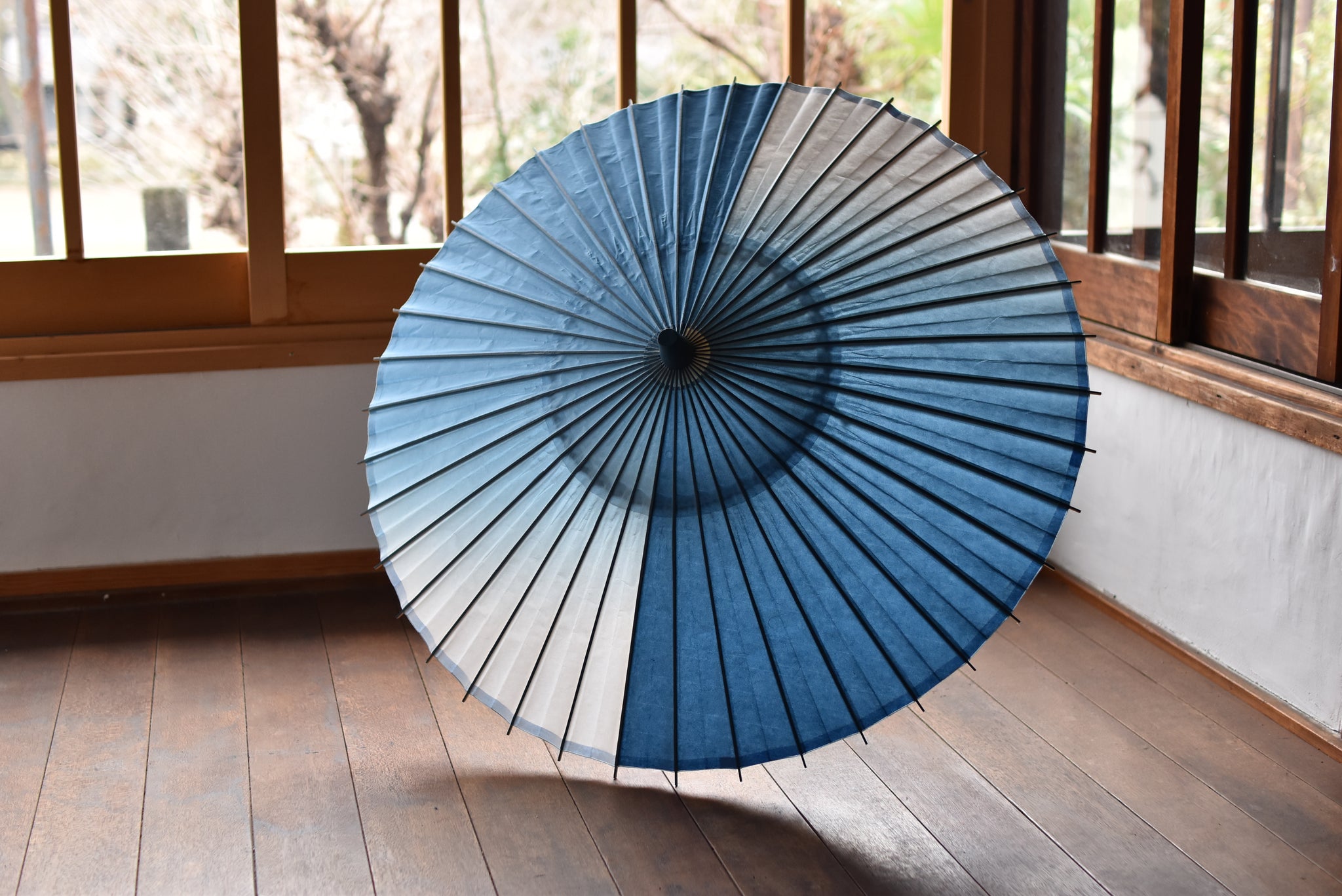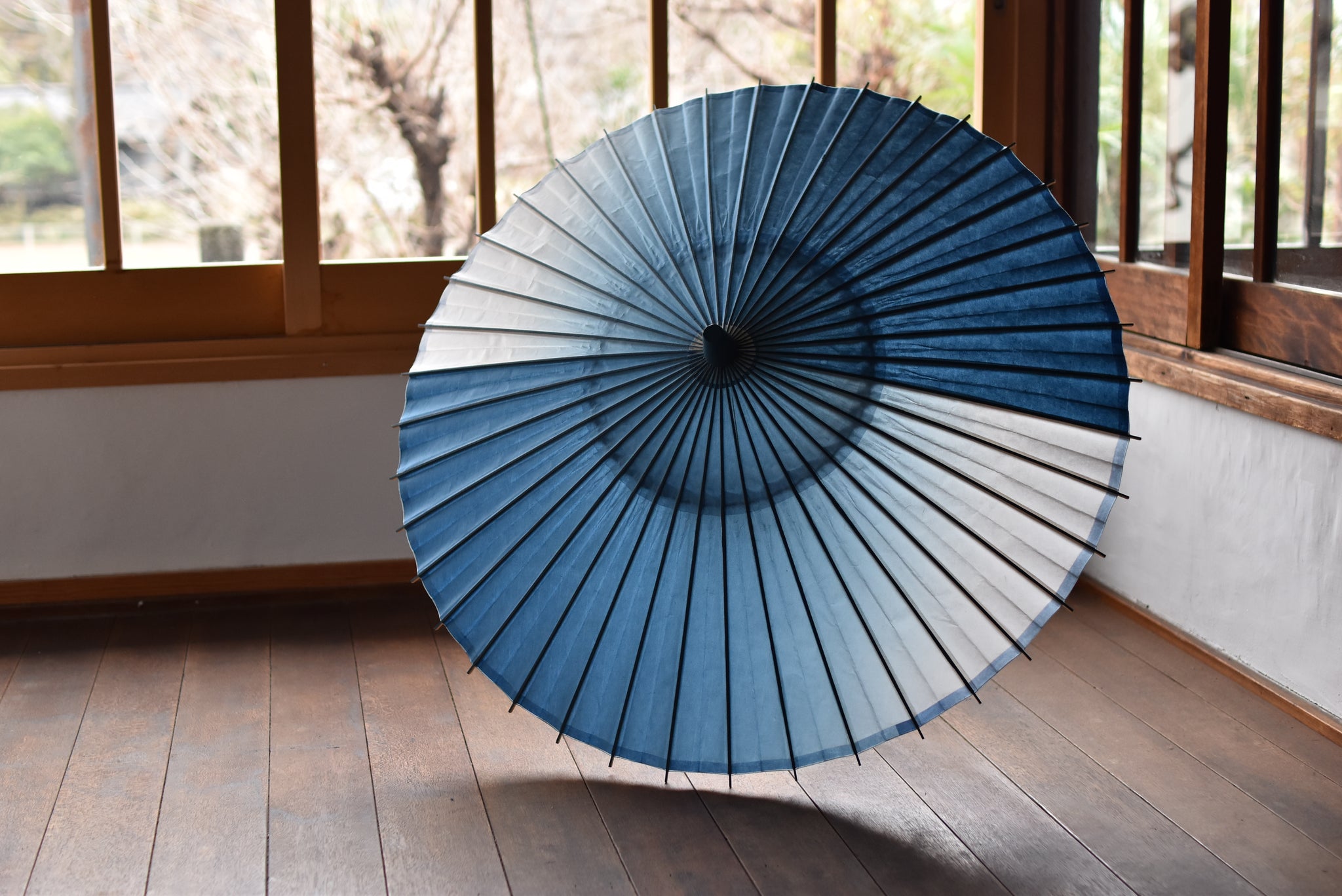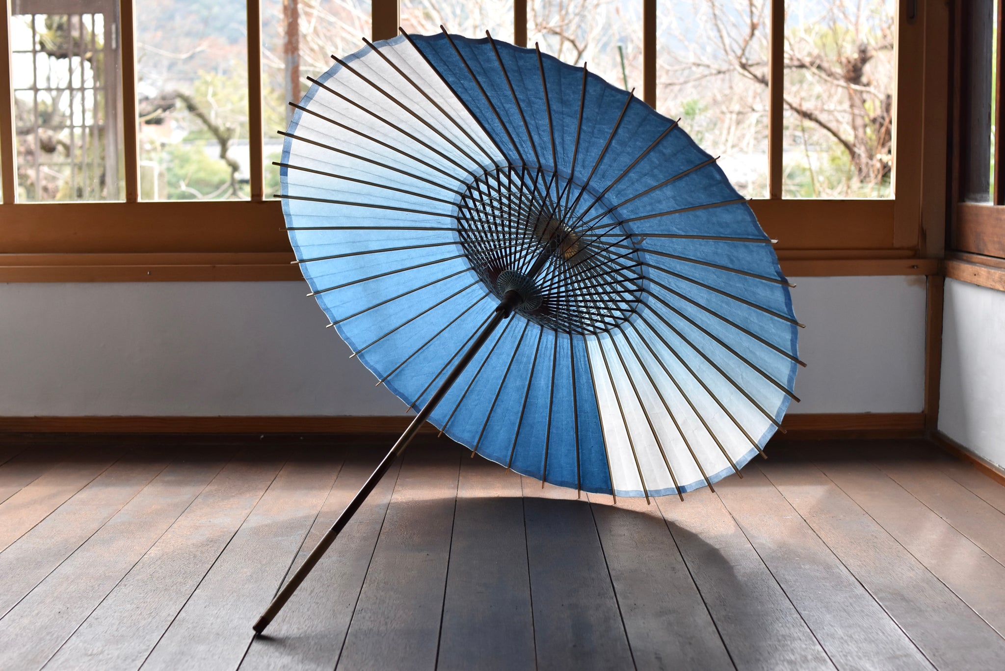 和傘職人であった、仐日和 河合幹子さんのお祖母様が30年程前に製作された阿波和紙の藍染の日傘。