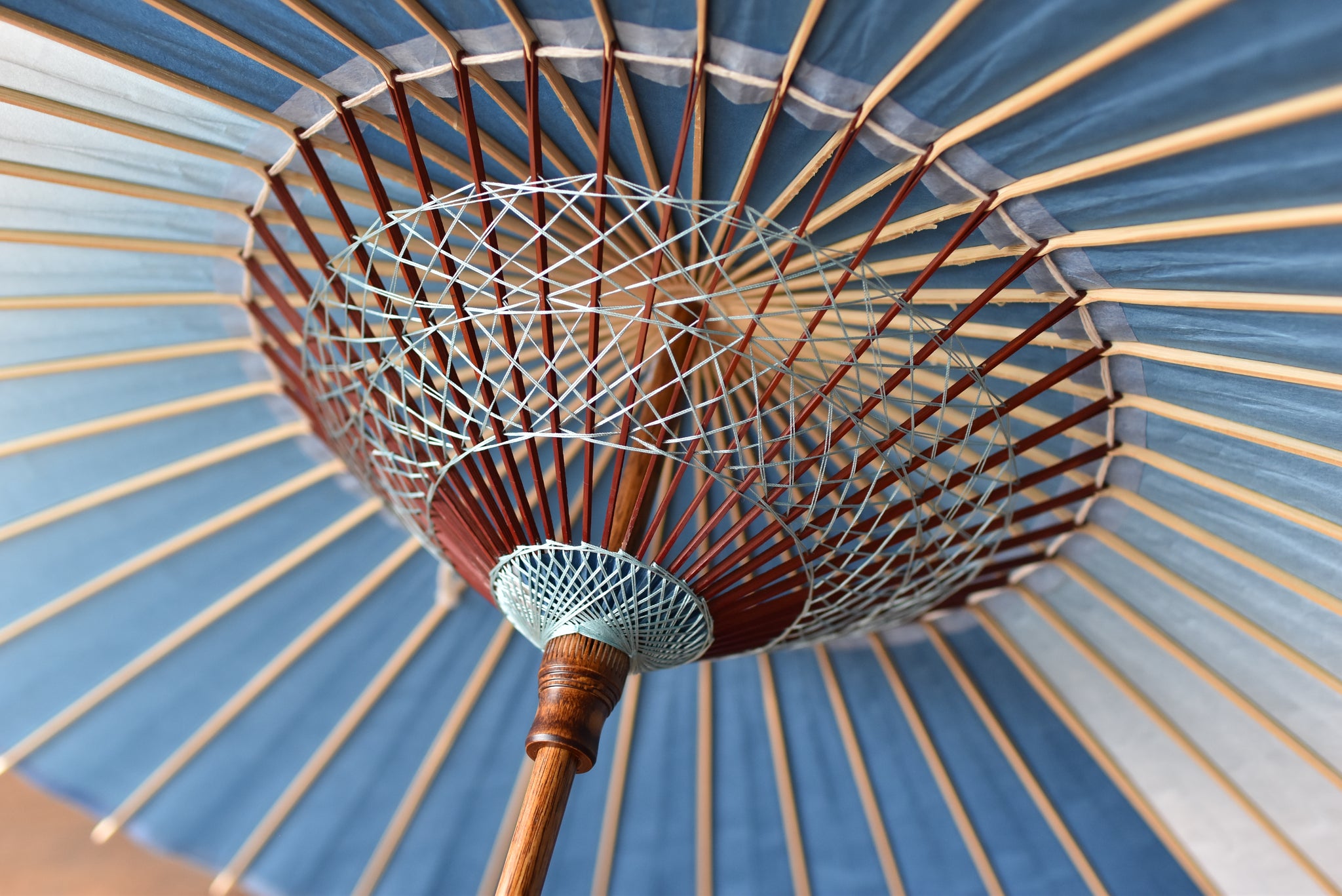 和傘の骨組みは、1本の竹を均等に割り、傘を畳んだ際に元の竹に戻るように組まれています。