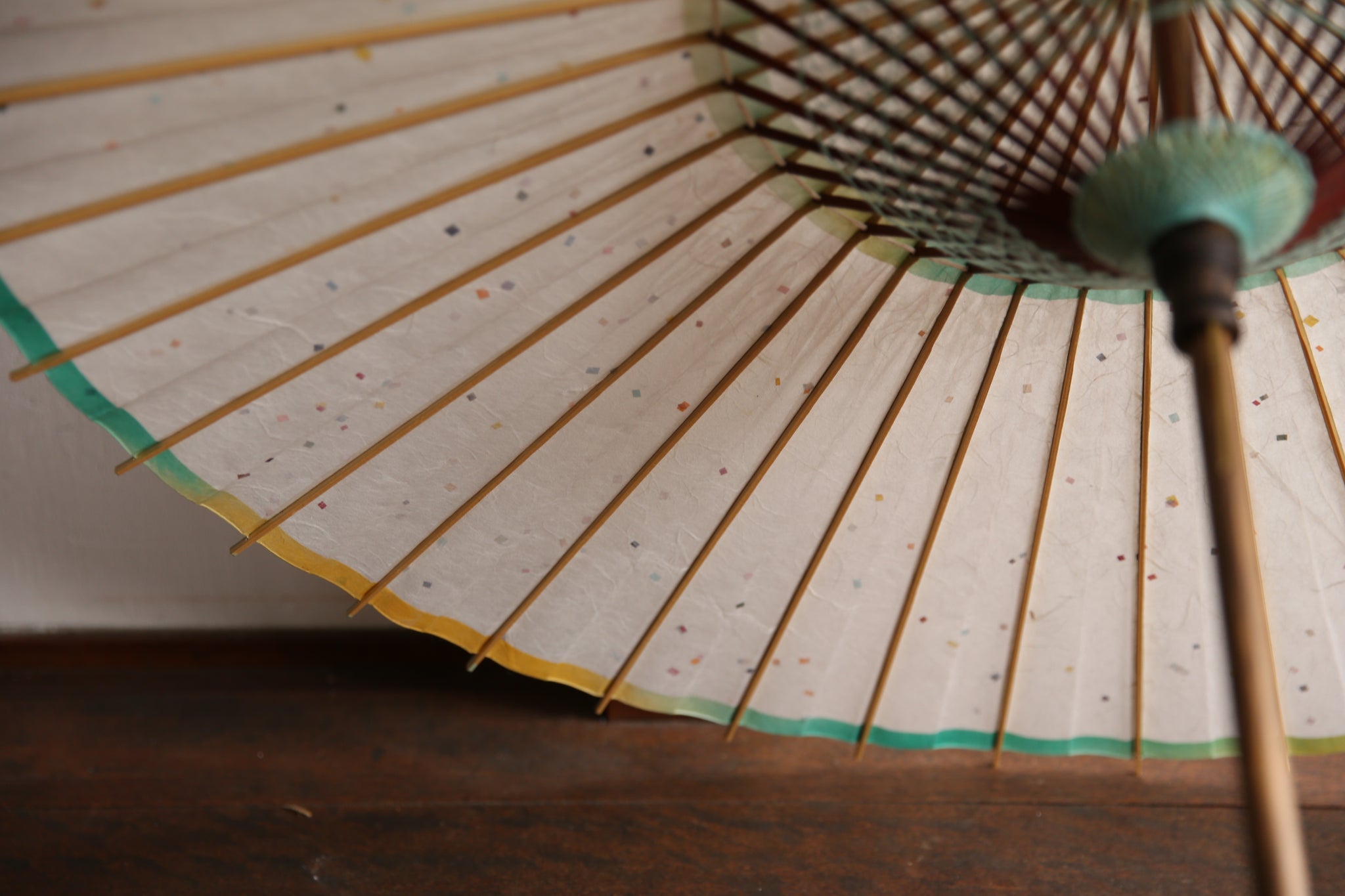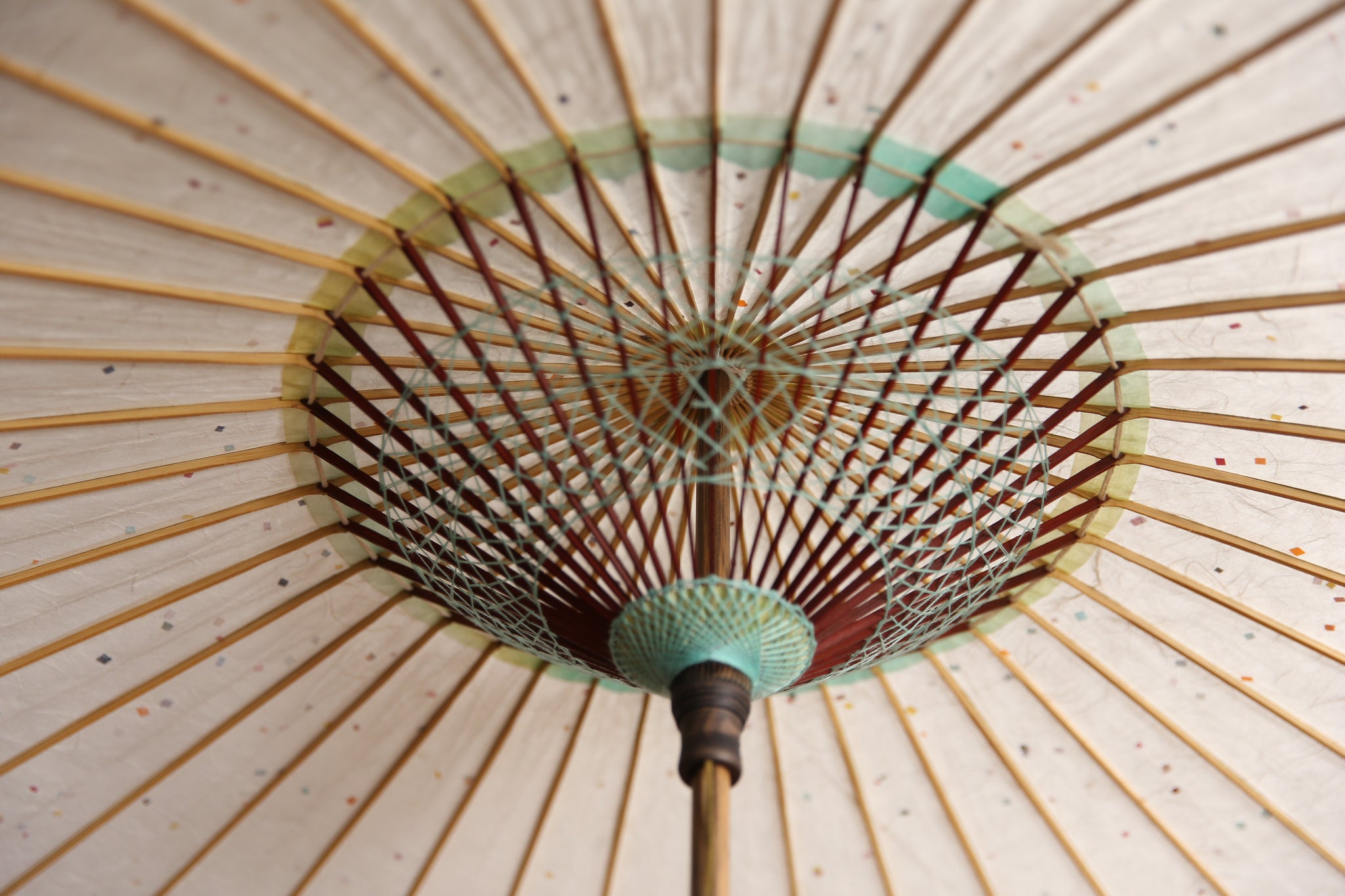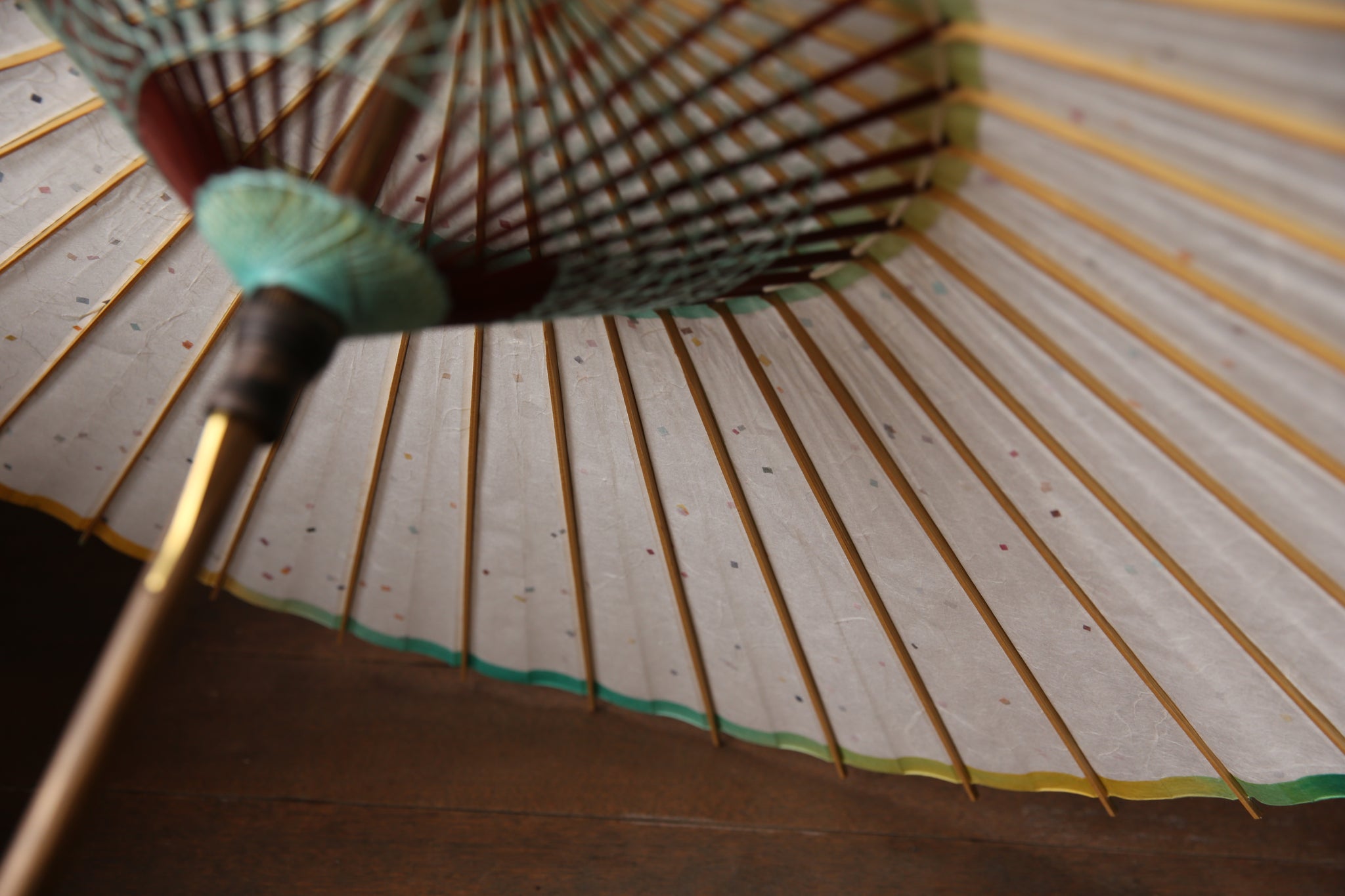 和傘の骨組みは、1本の竹を均等に割り、傘を畳んだ際に元の竹に戻るように組まれています。