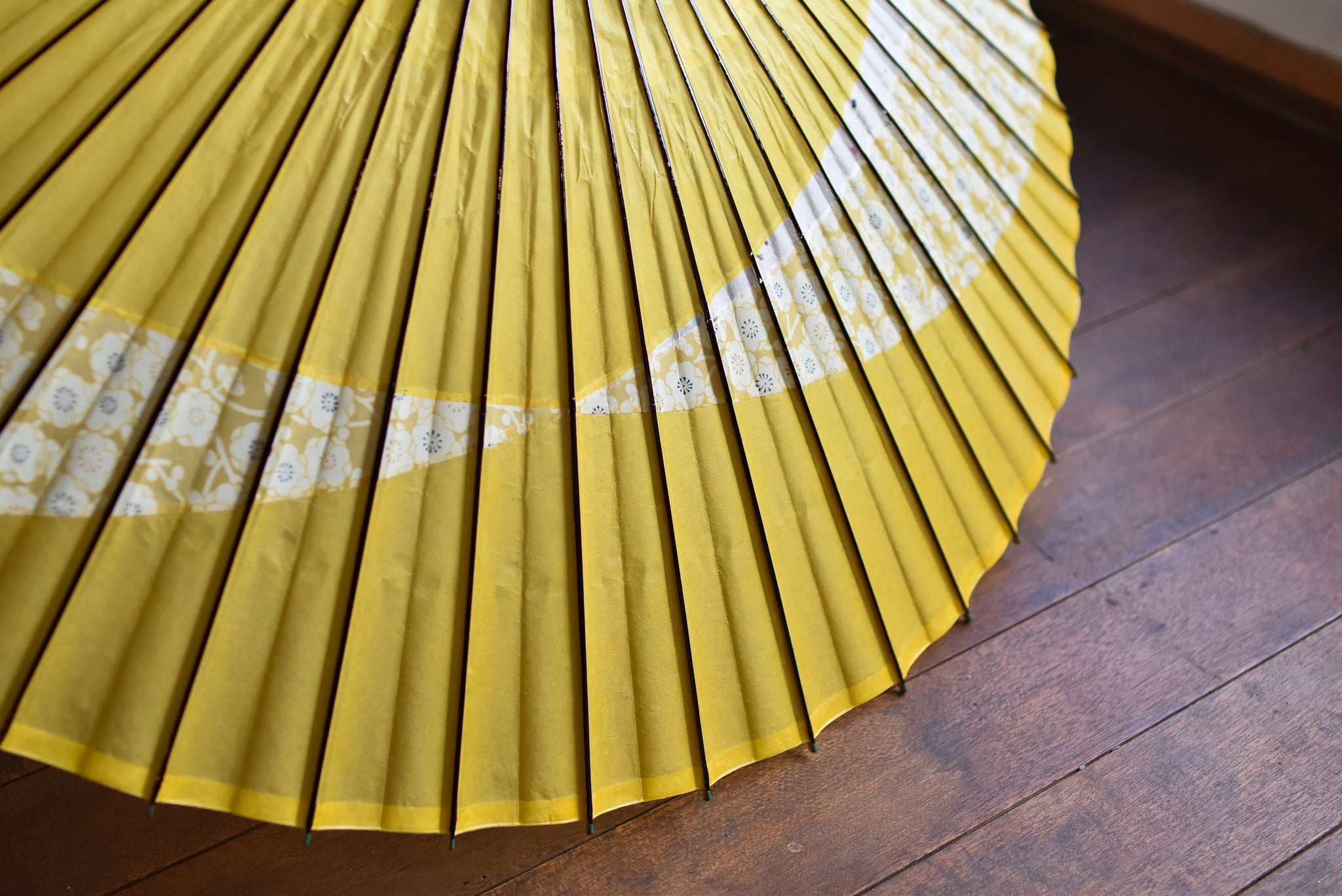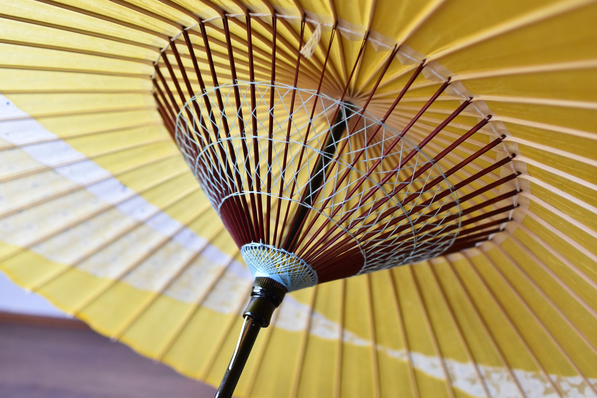 和傘の骨組みは、1本の竹を均等に割り、傘を畳んだ際に元の竹に戻るように組まれています。
