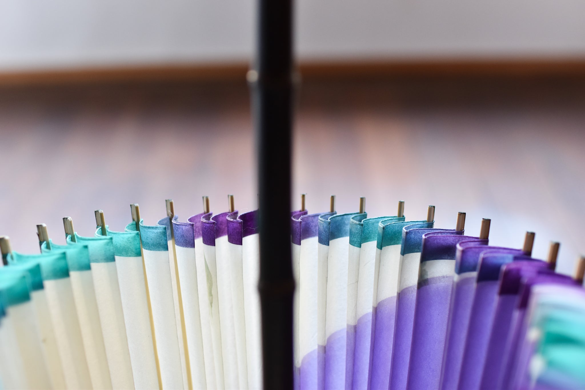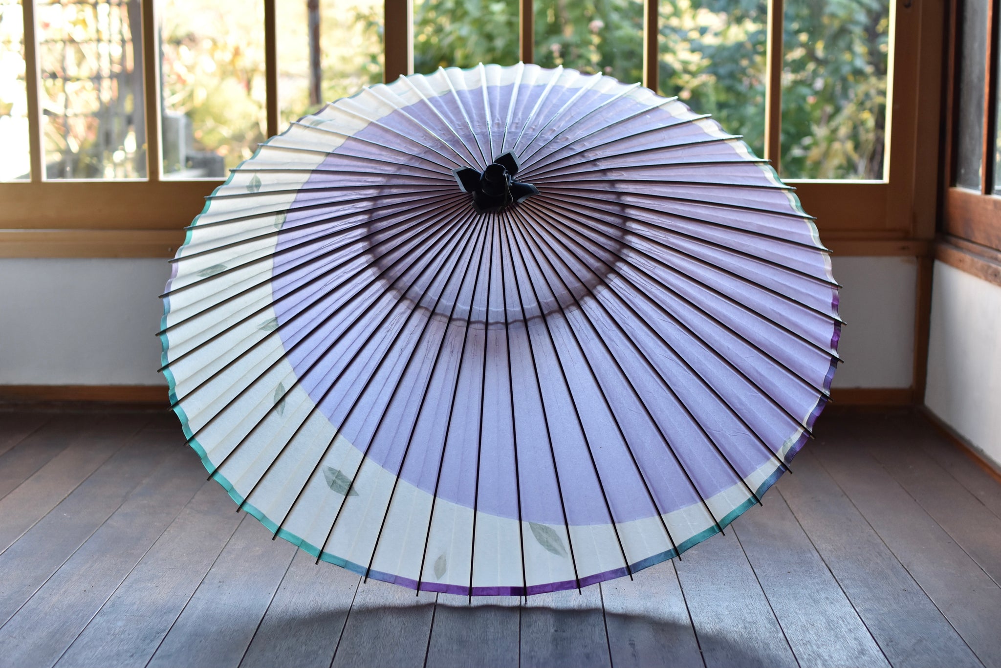 爽やかなラベンダー色の和紙と軒紙の瑞々しいグリーン系のぼかし染がまた美しい。