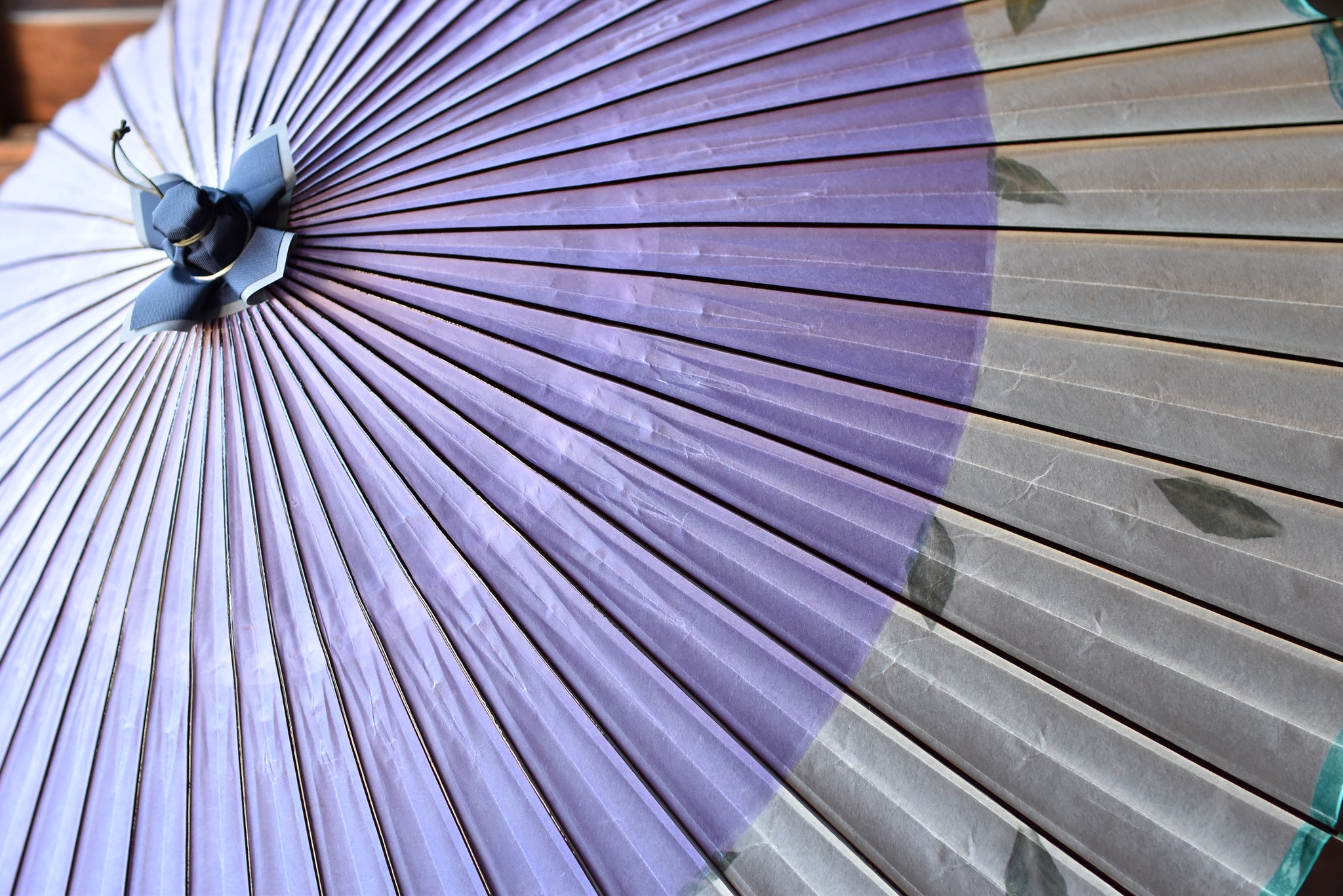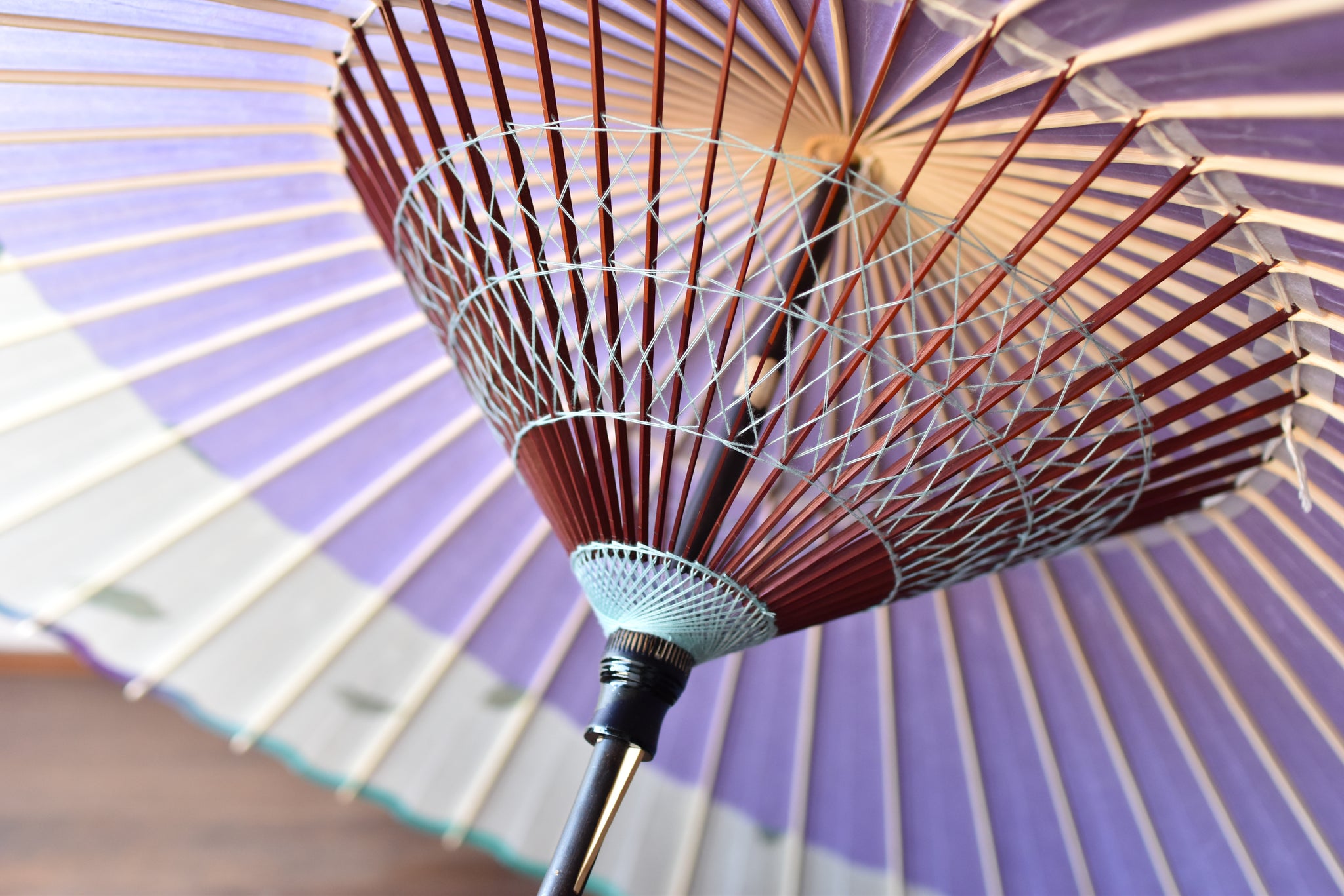 和傘の骨組みは、1本の竹を均等に割り、傘を畳んだ際に元の竹に戻るように組まれています。