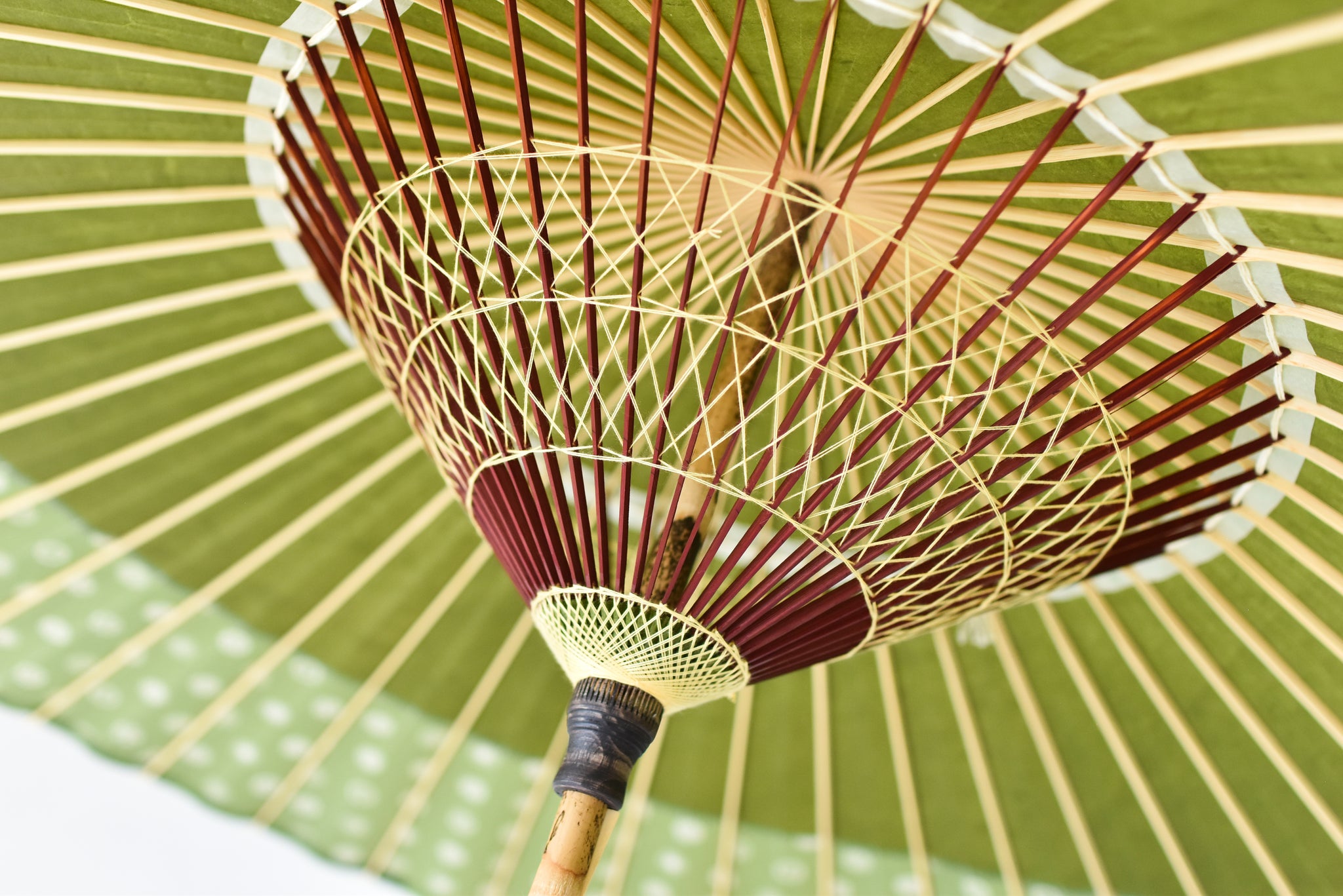 和傘の骨組みは、1本の竹を均等に割り、傘を畳んだ際に元の竹に戻るように組まれています。