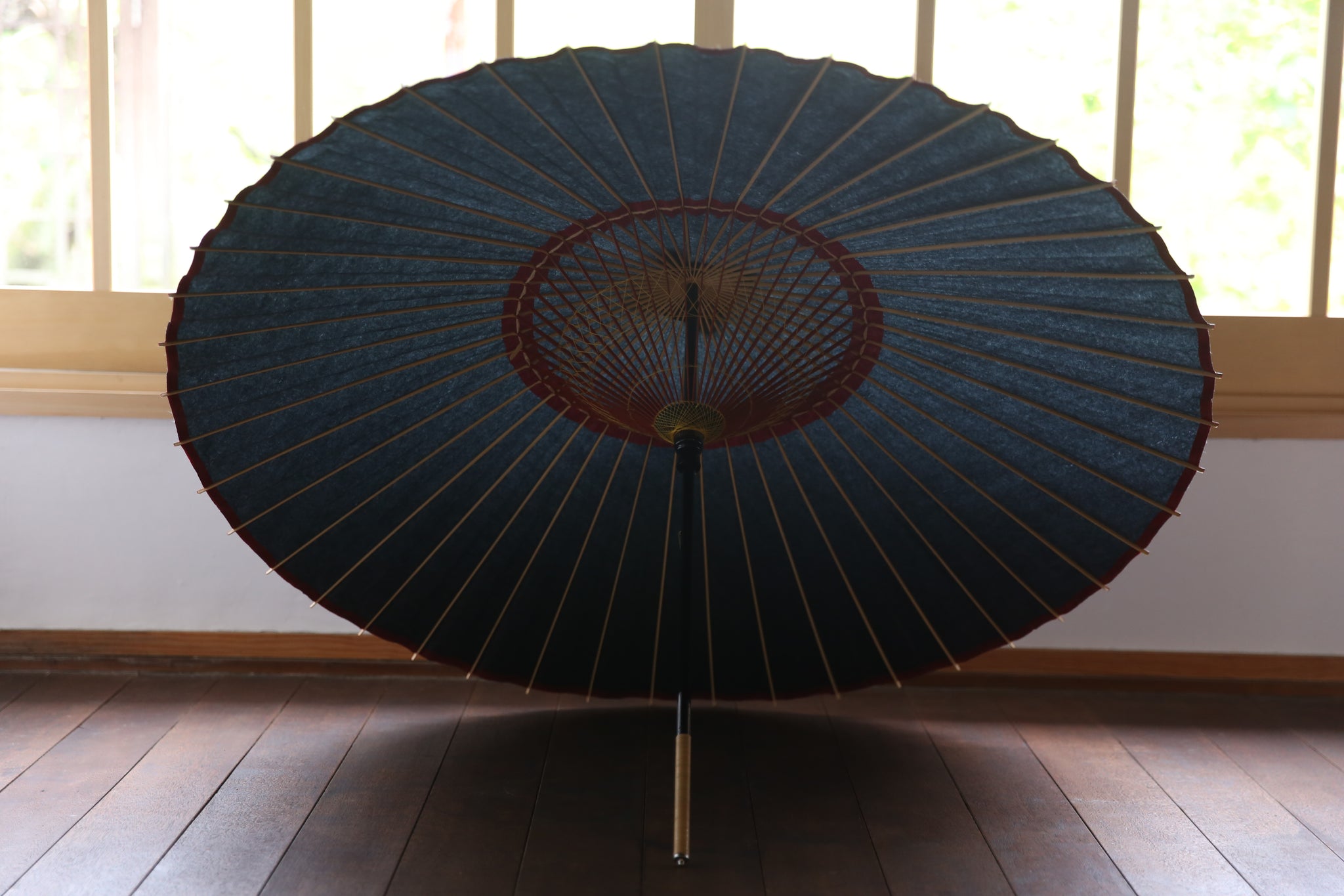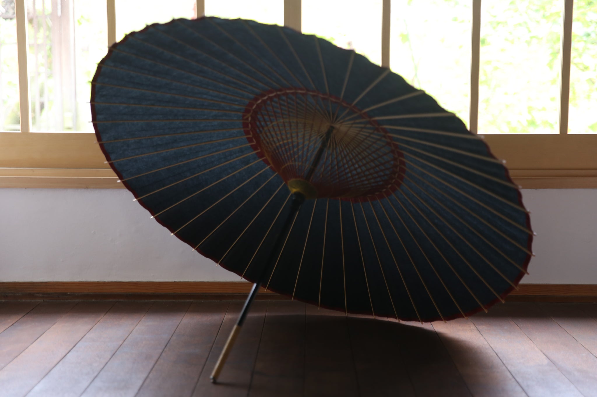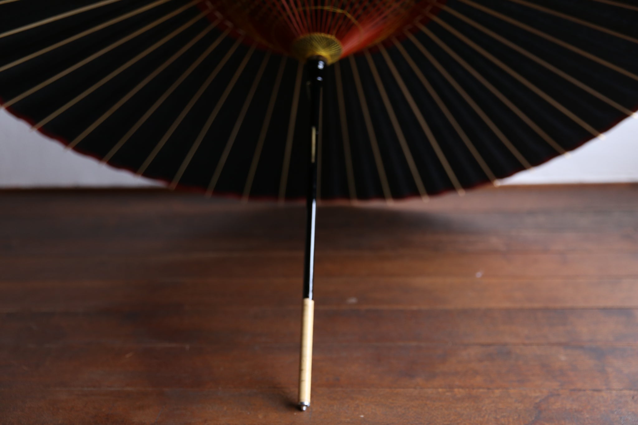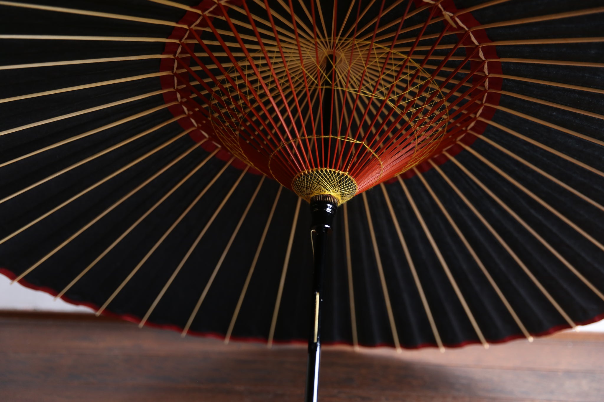 表は黒一色なのですが、内側は軒紙、中置紙や小骨の赤が効いていて、粋な和傘です。