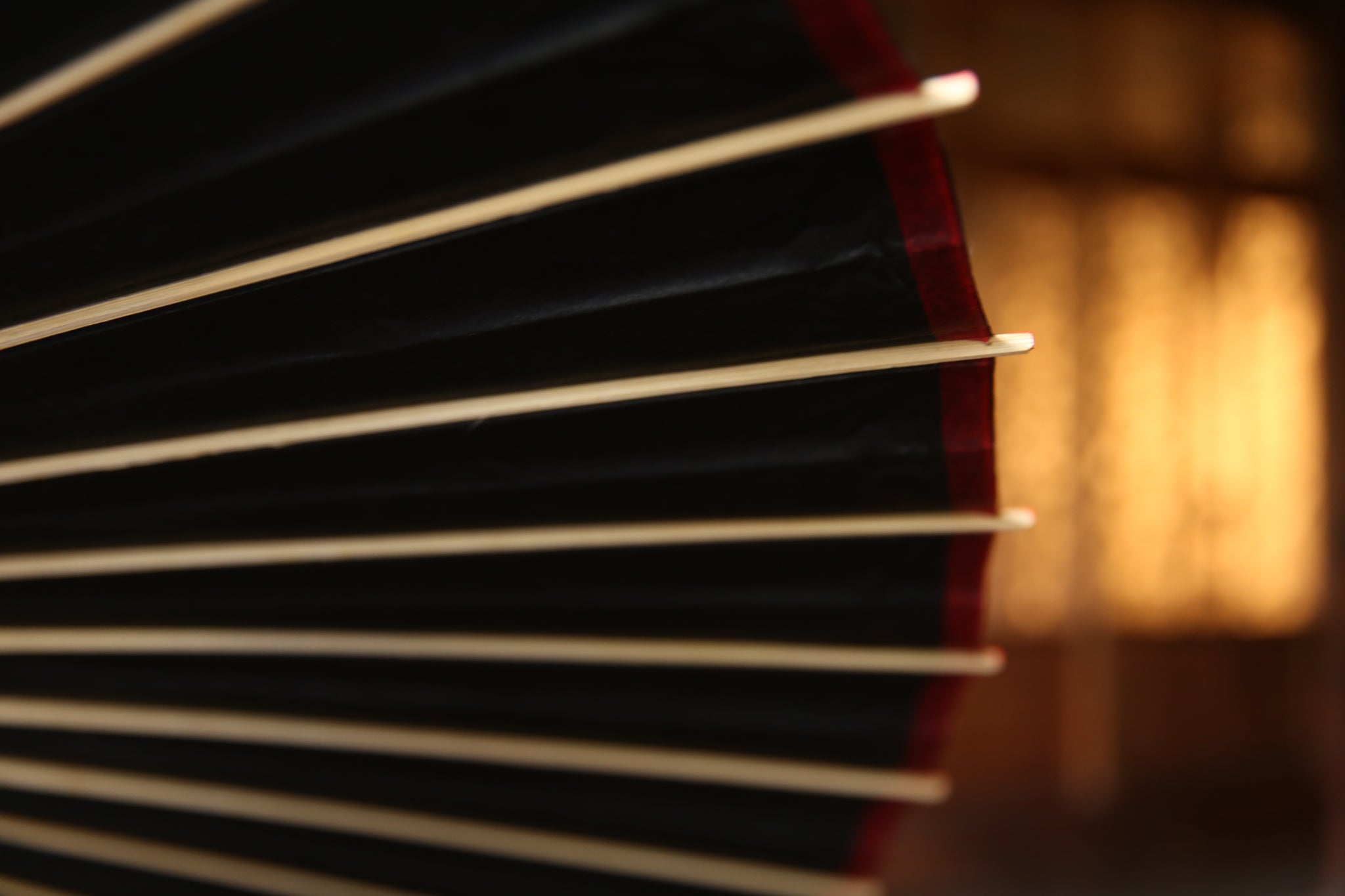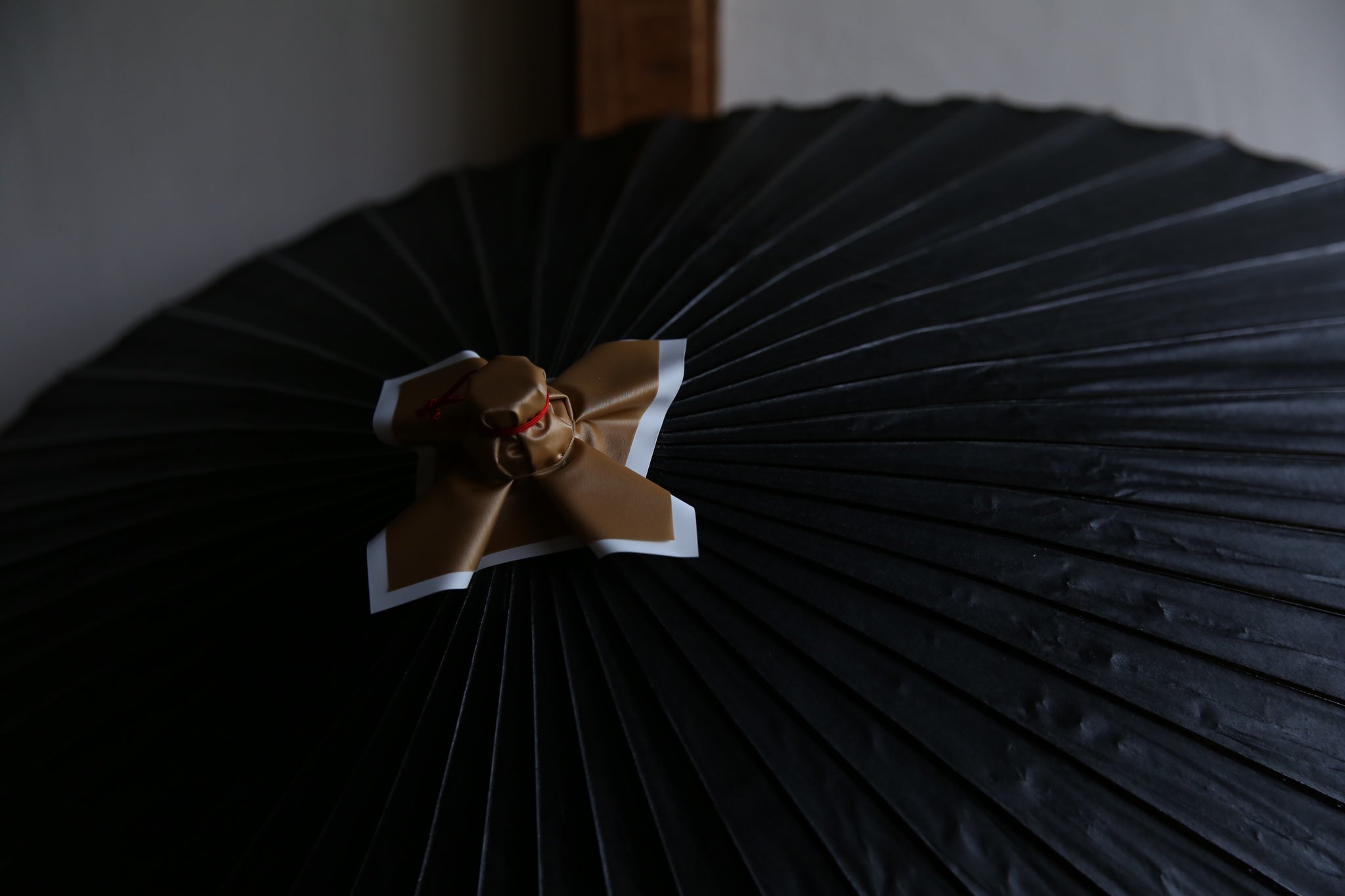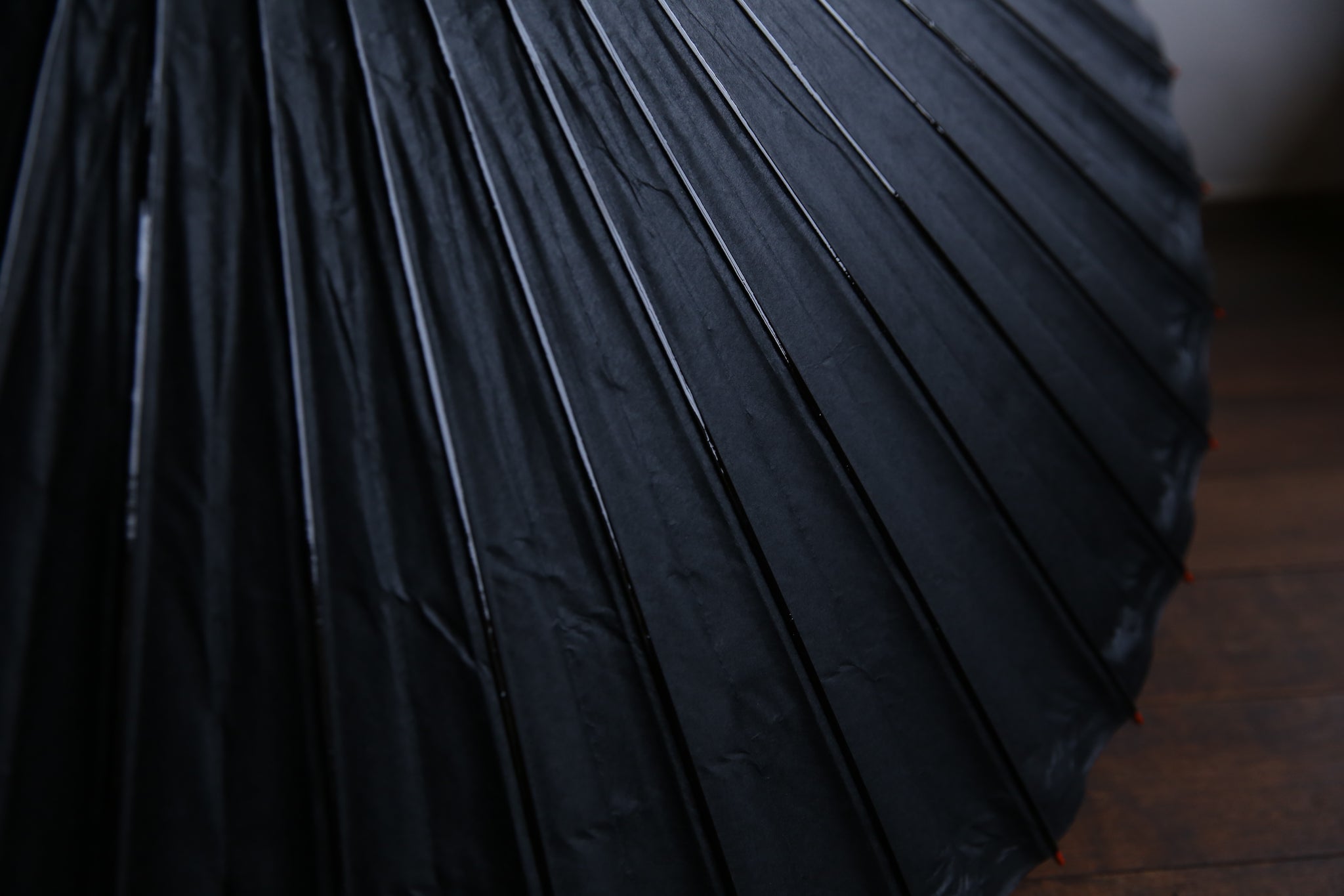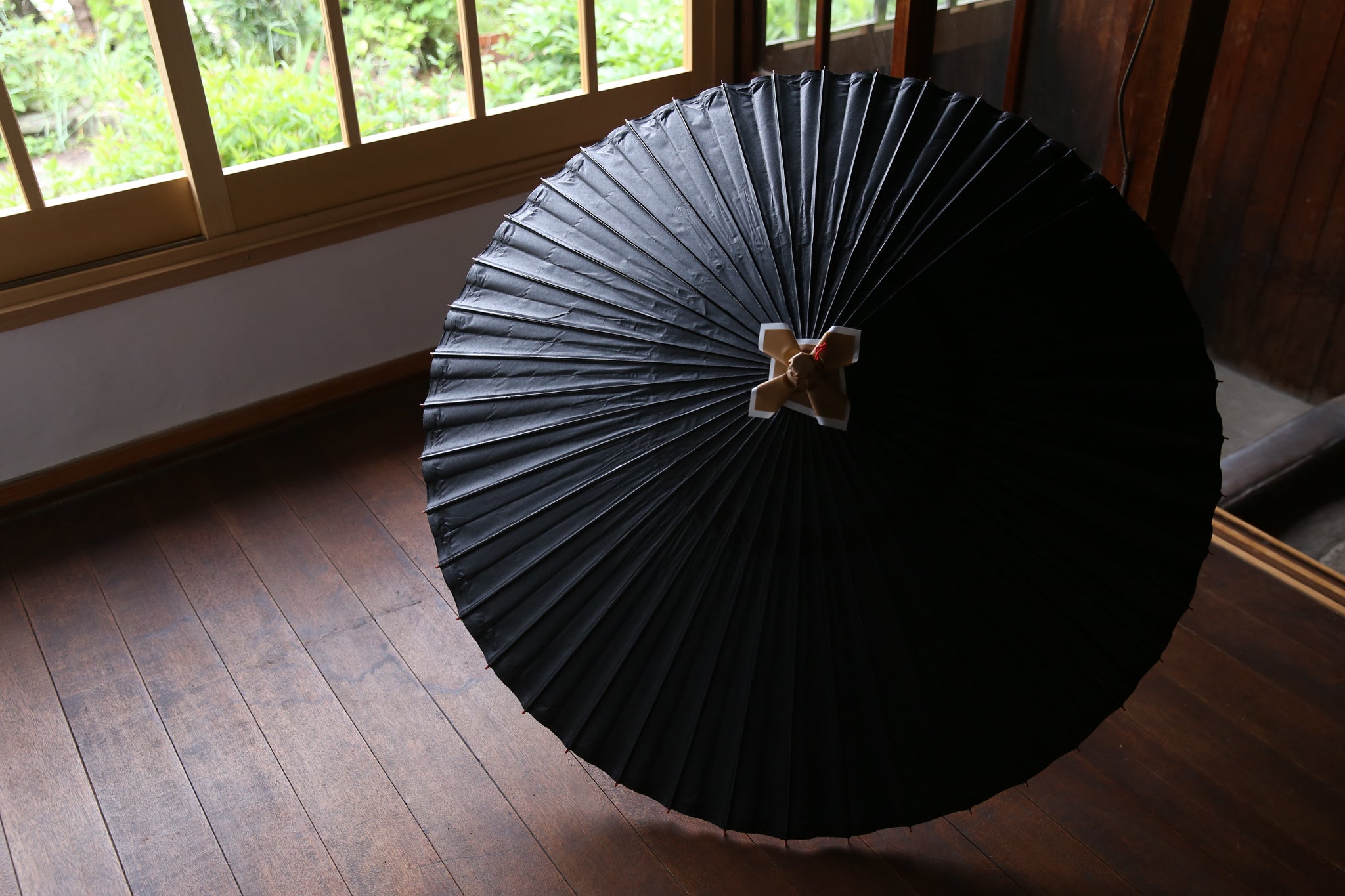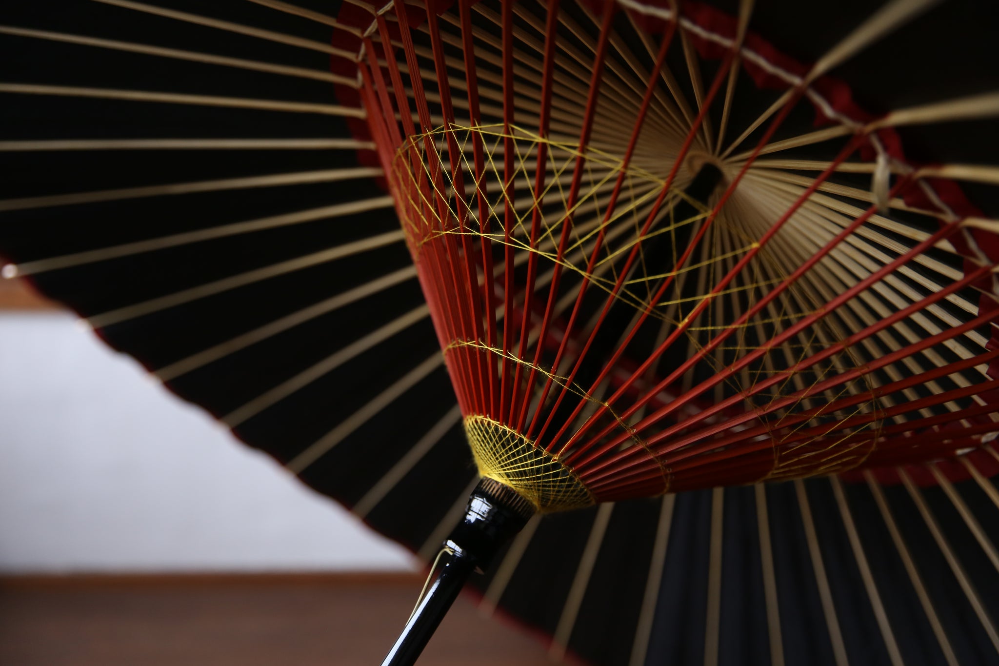 表は黒一色なのですが、内側は軒紙、中置紙や小骨の赤が効いていて、粋な和傘です。