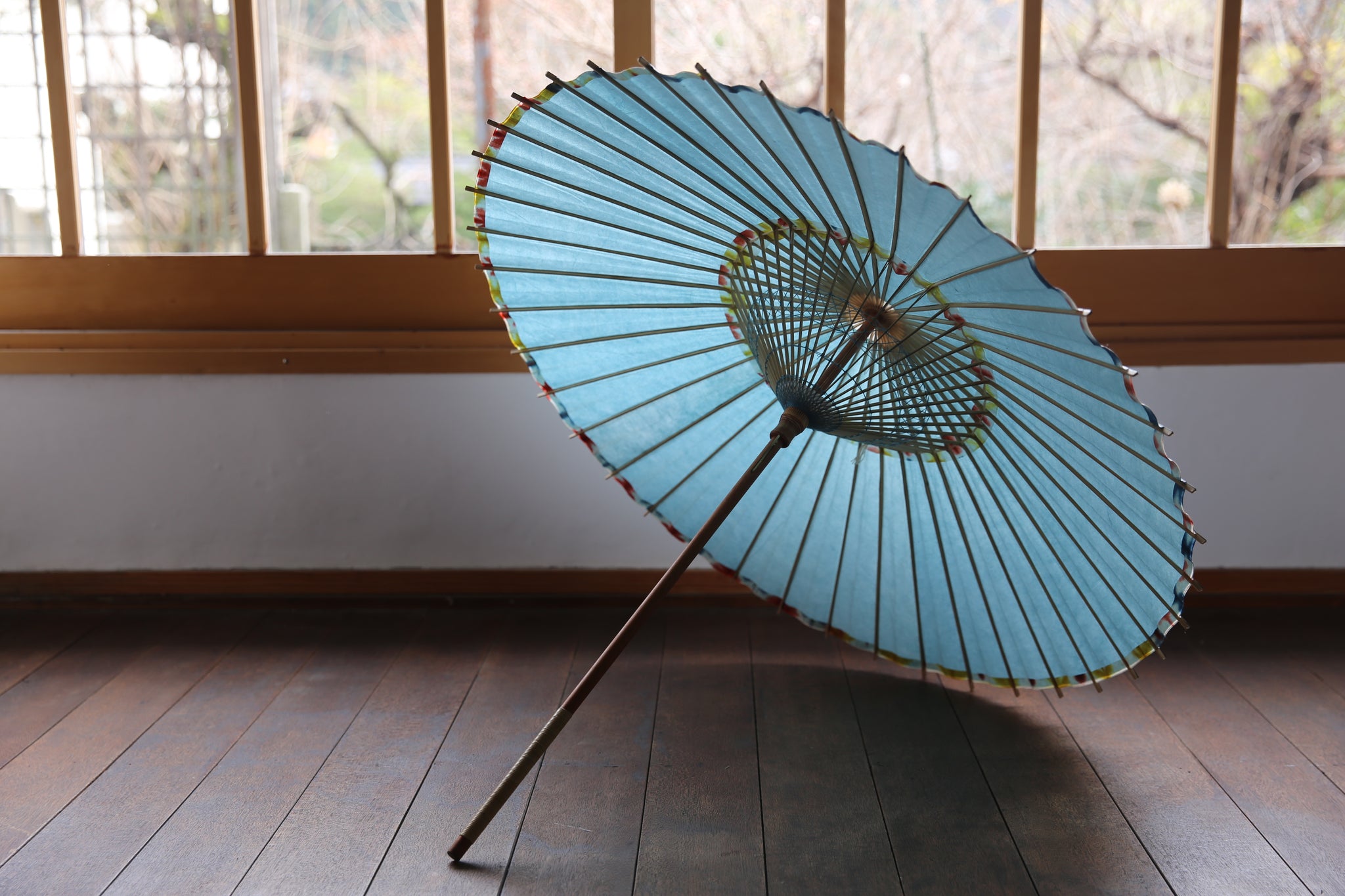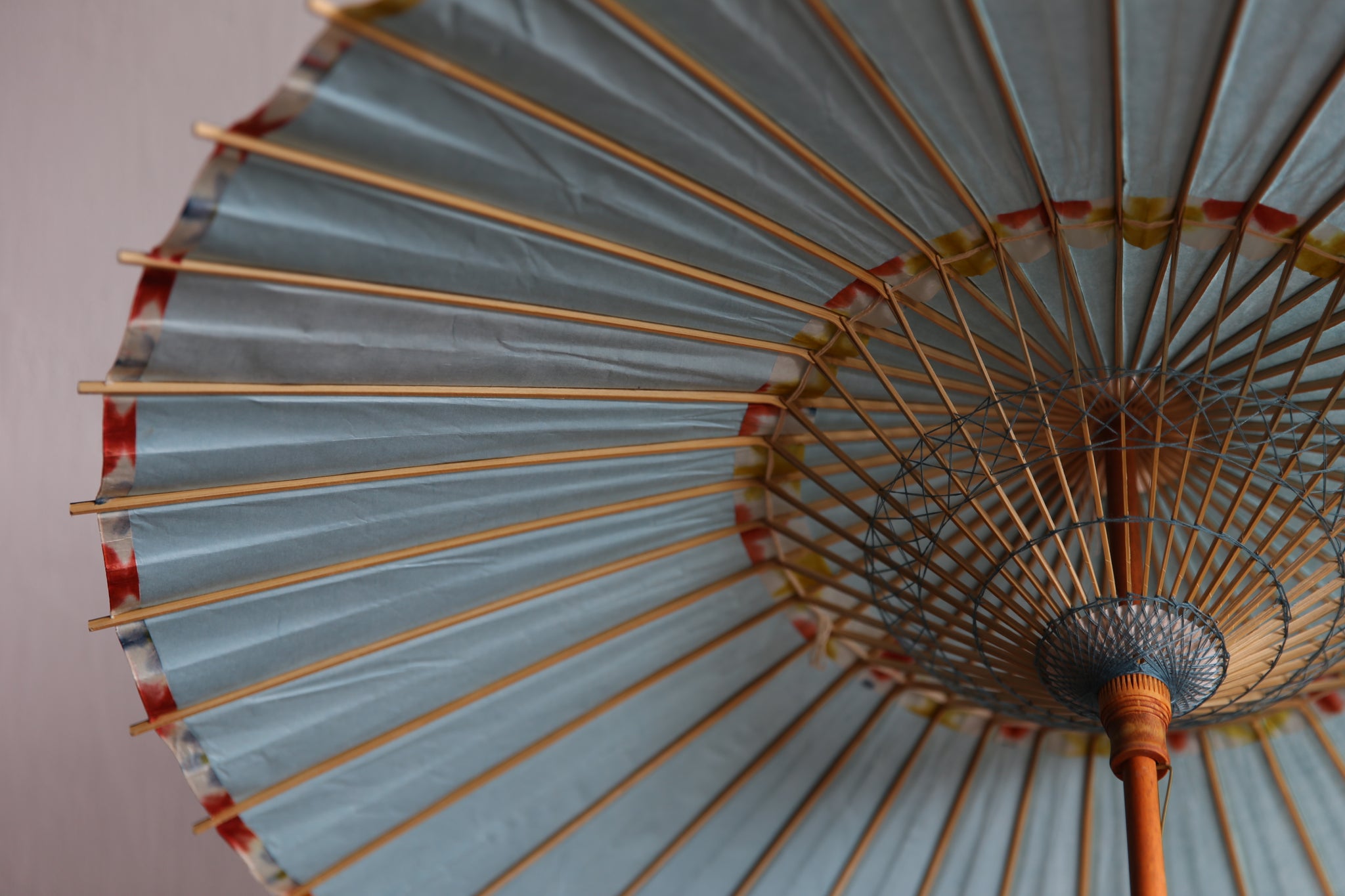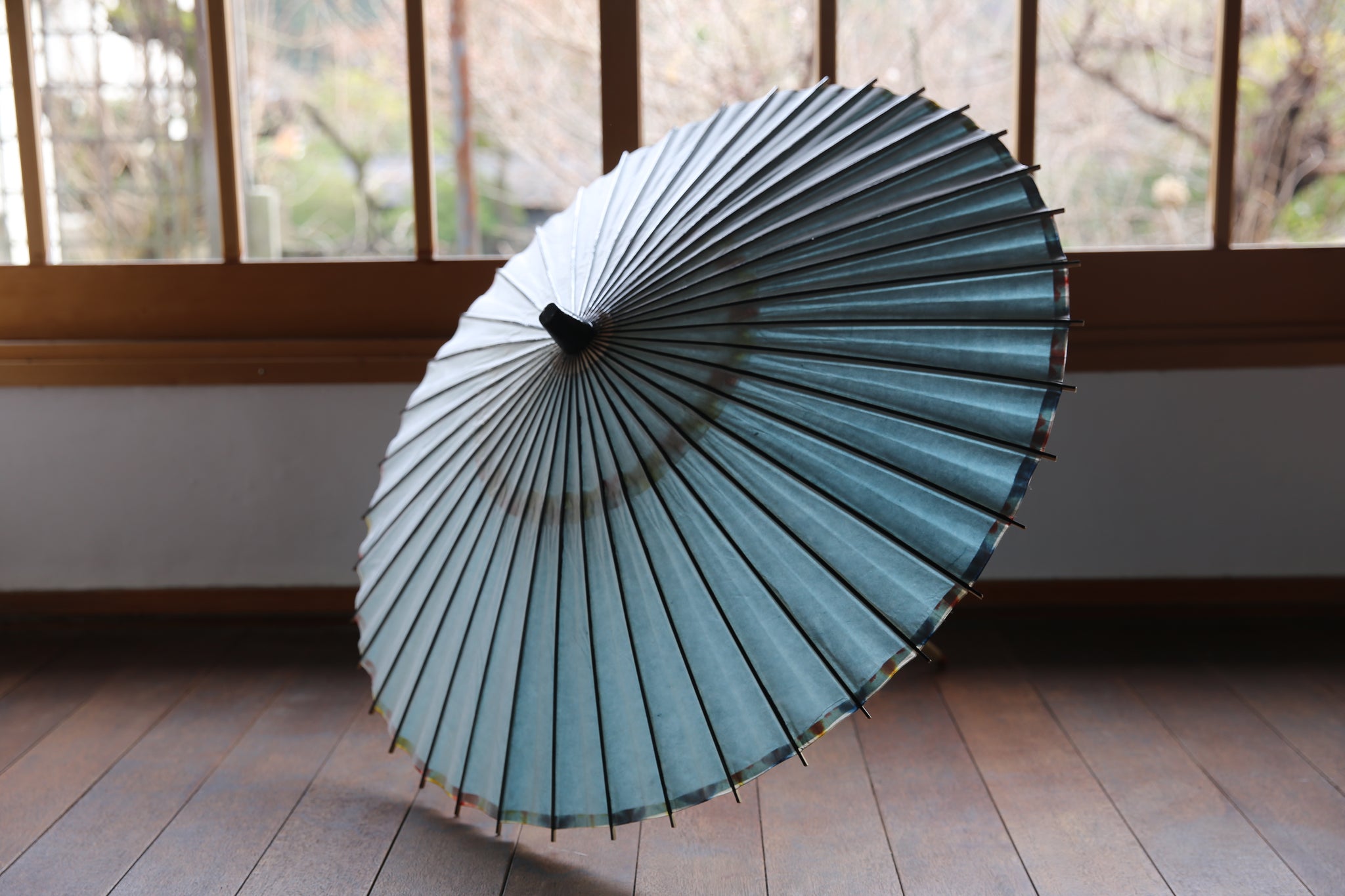 二重張と呼ばれる異なる2枚の和紙を重ねて張っている日傘です。