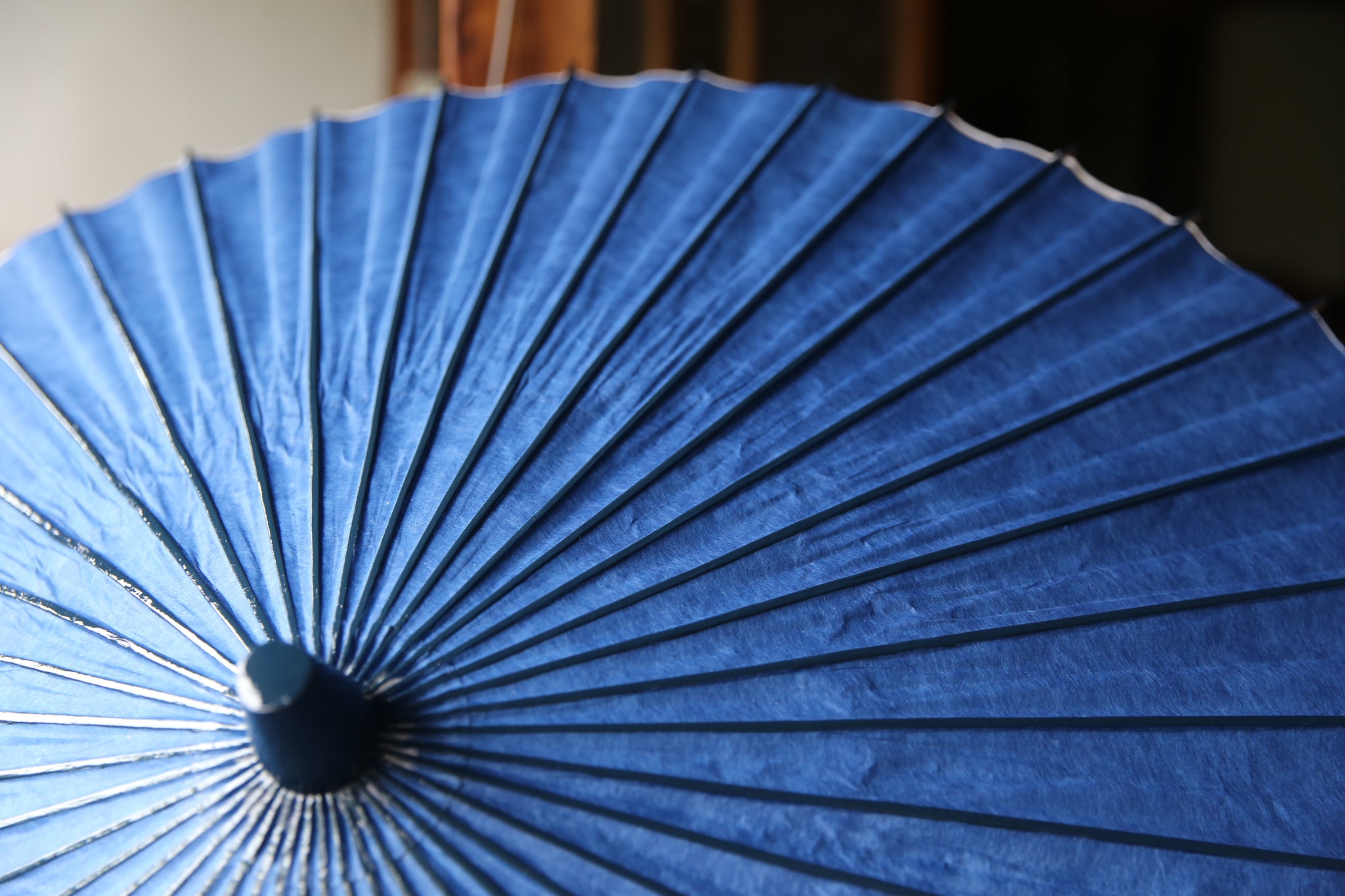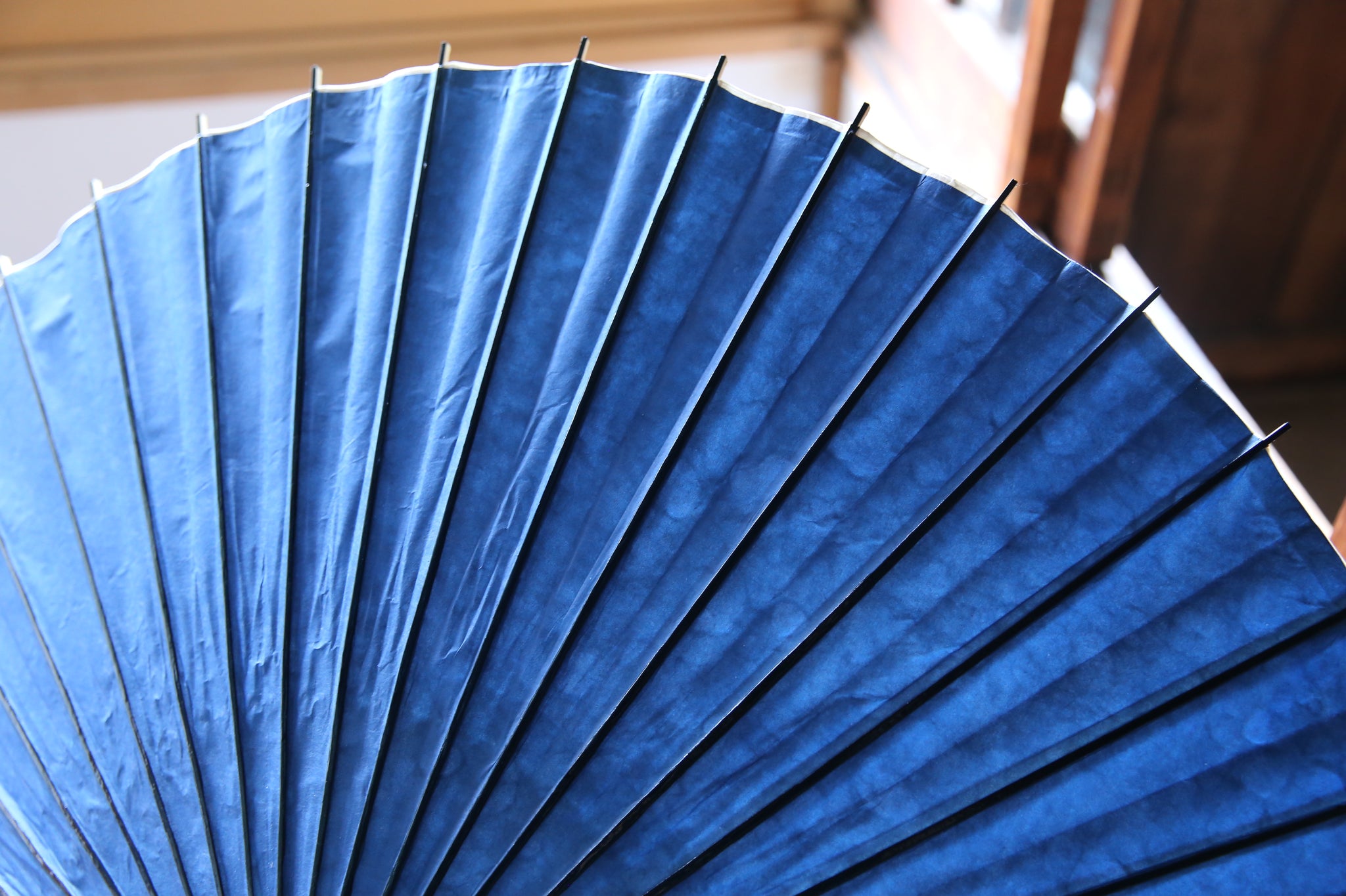 傘骨の表は、光沢感のあるグリーン味の紺色の塗装(カシュー漆)が特徴。