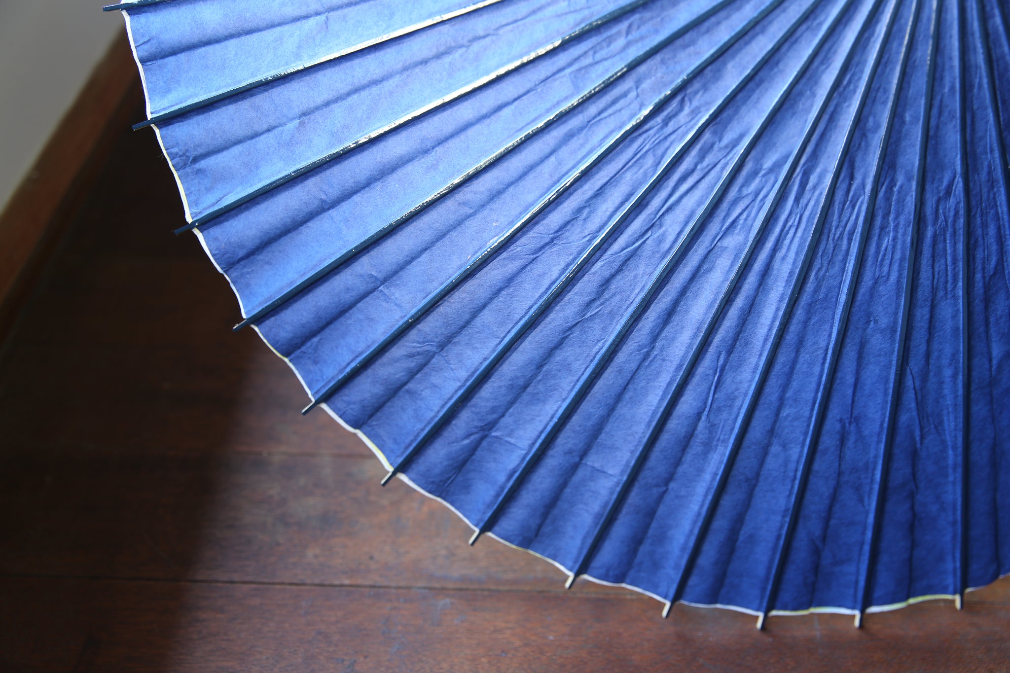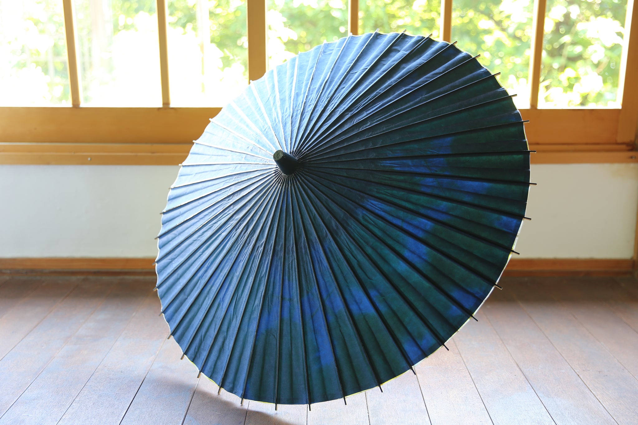 傘骨の表は、光沢感のあるグリーン味の紺色の塗装(カシュー漆)が特徴。