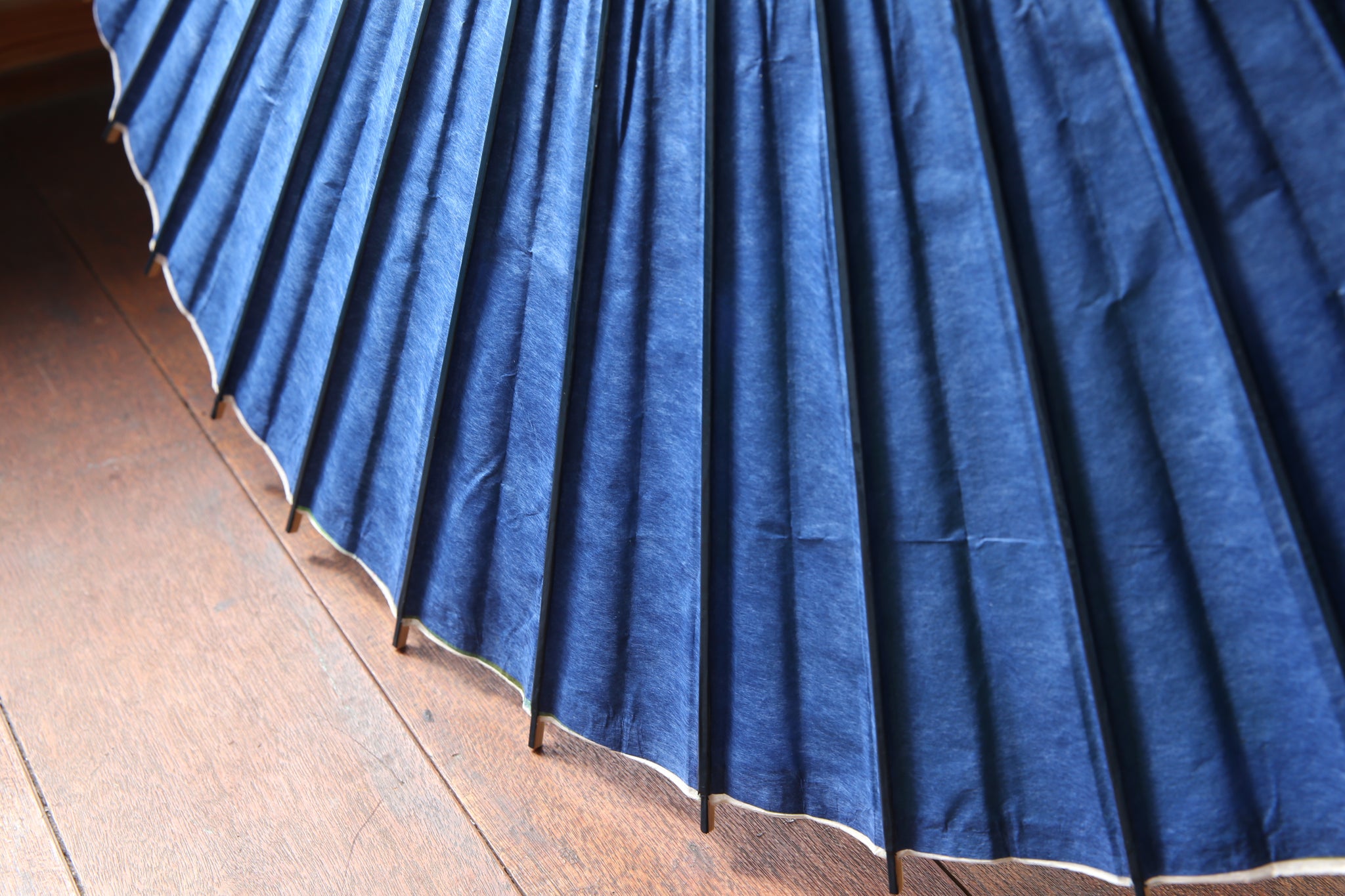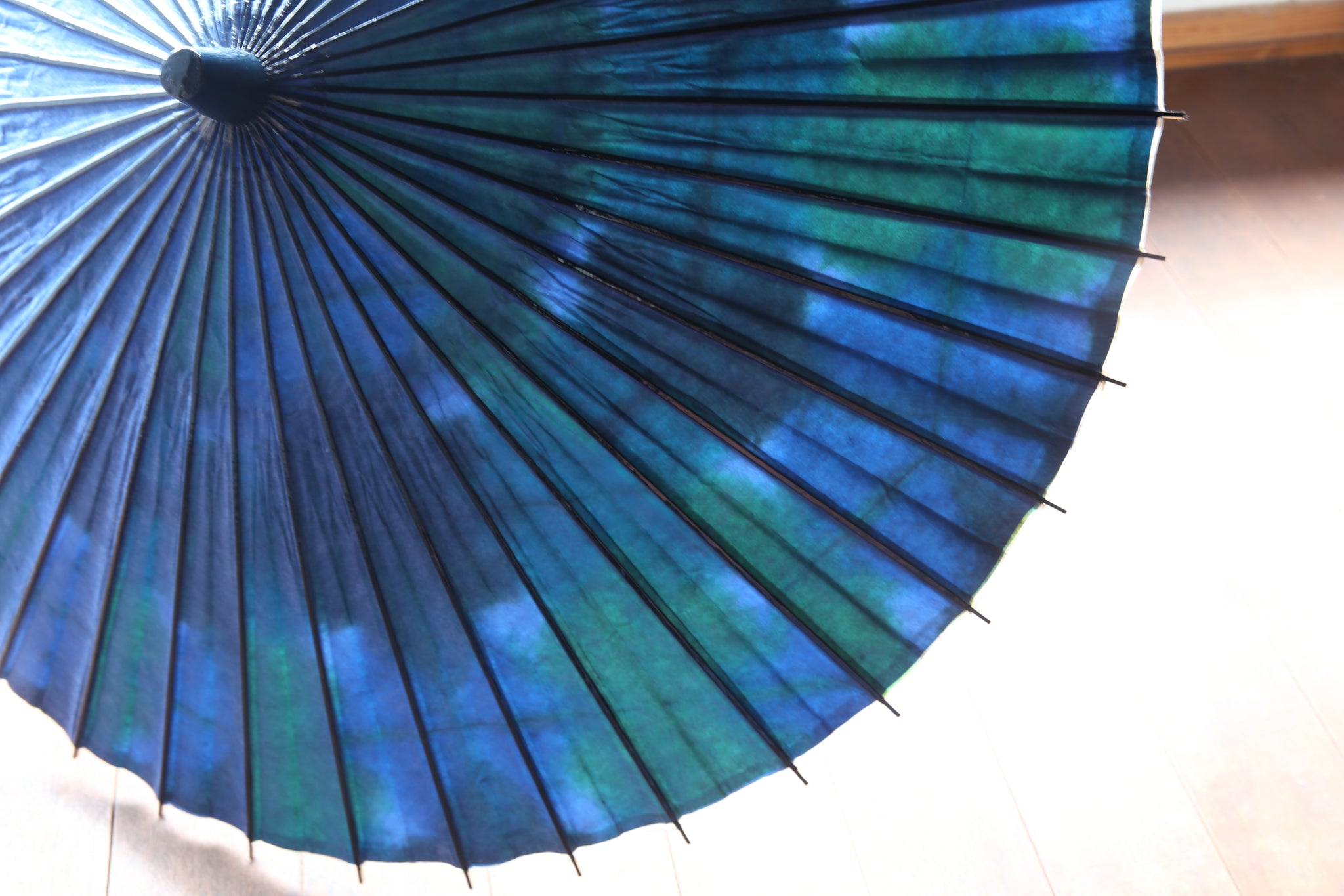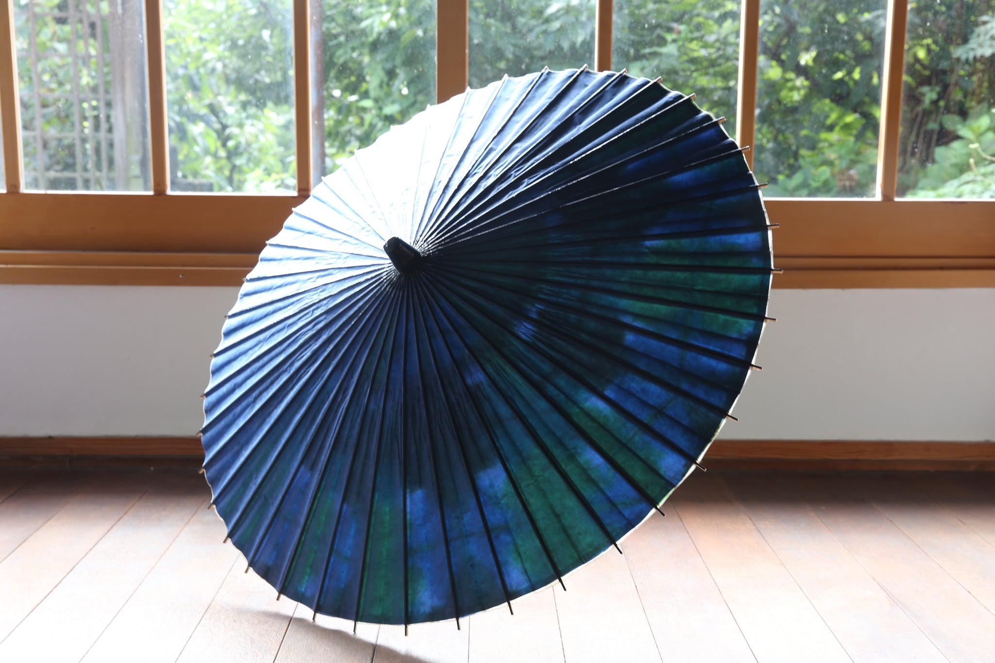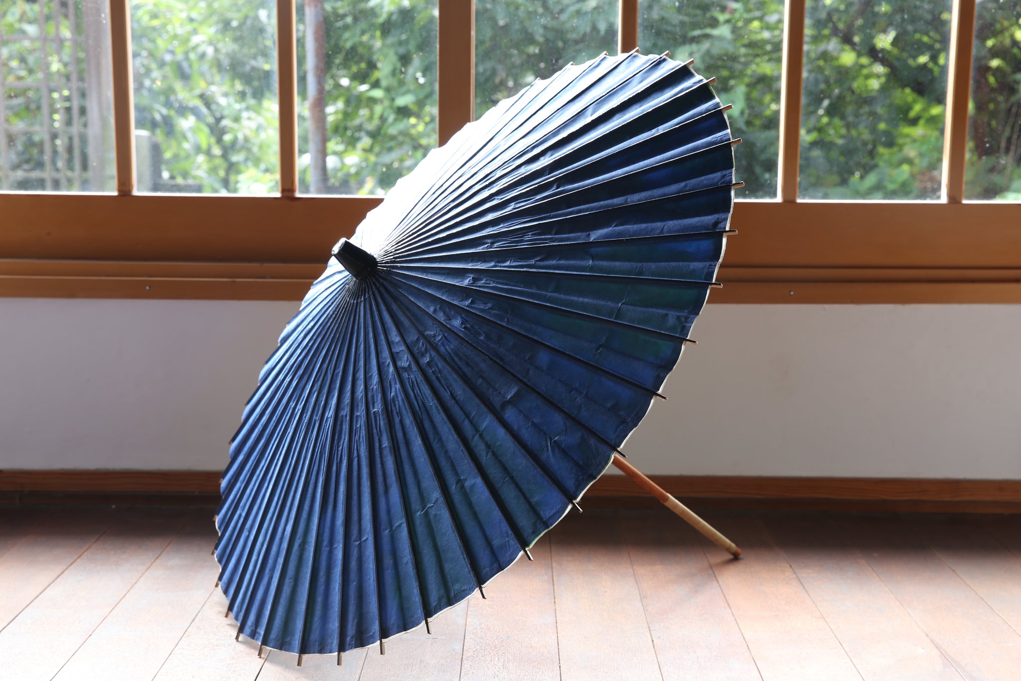 傘骨の表は、光沢感のあるグリーン味の紺色の塗装(カシュー漆)が特徴。