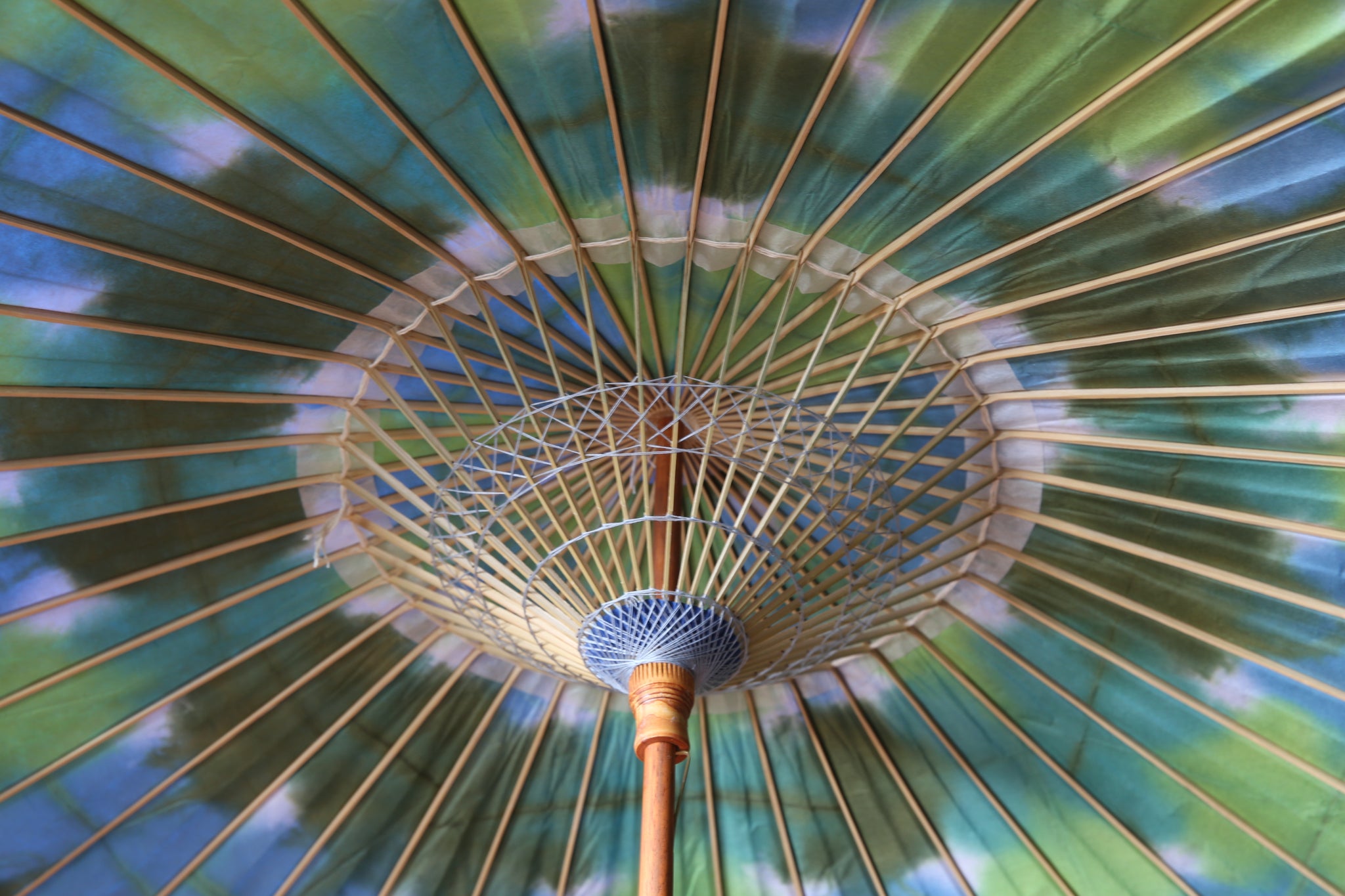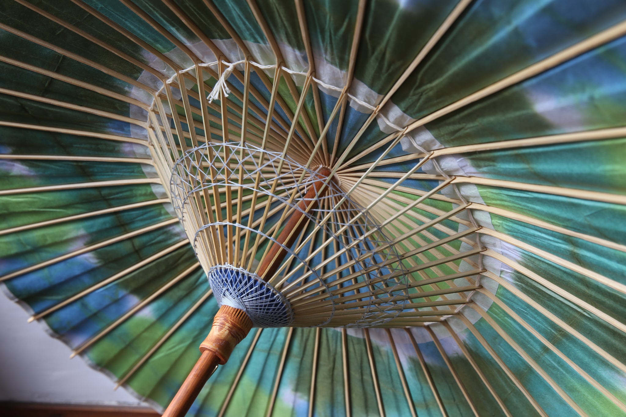 和傘の骨組みは、1本の竹を均等に割り、傘を畳んだ際に元の竹に戻るように組まれています。
