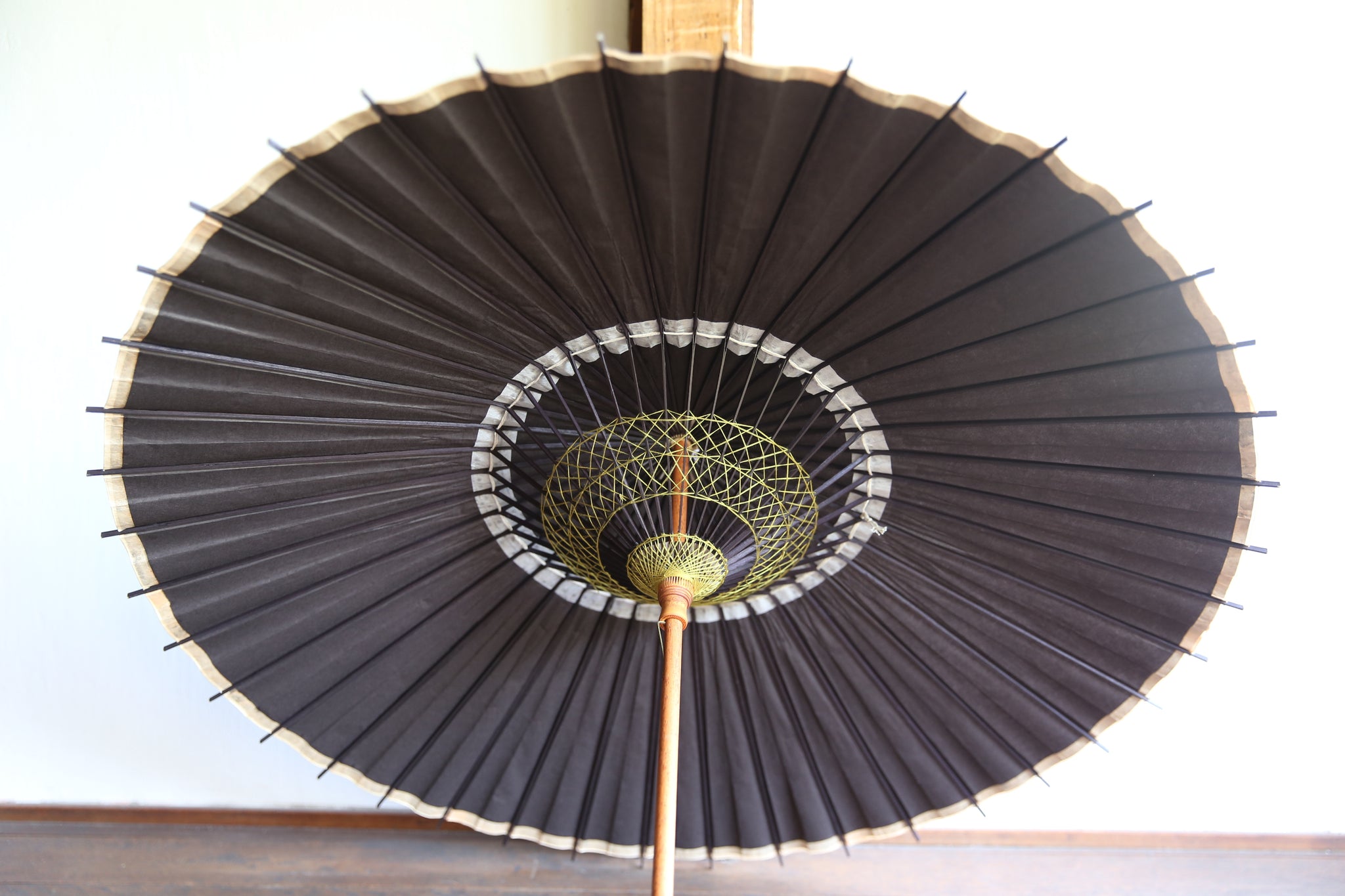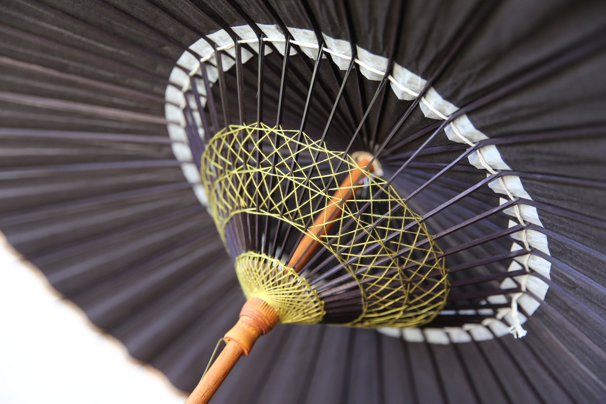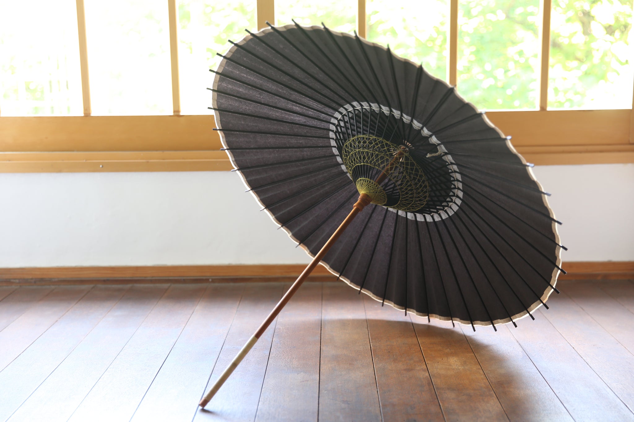 和傘の骨組みは、1本の竹を均等に割り、傘を畳んだ際に元の竹に戻るように組まれています。