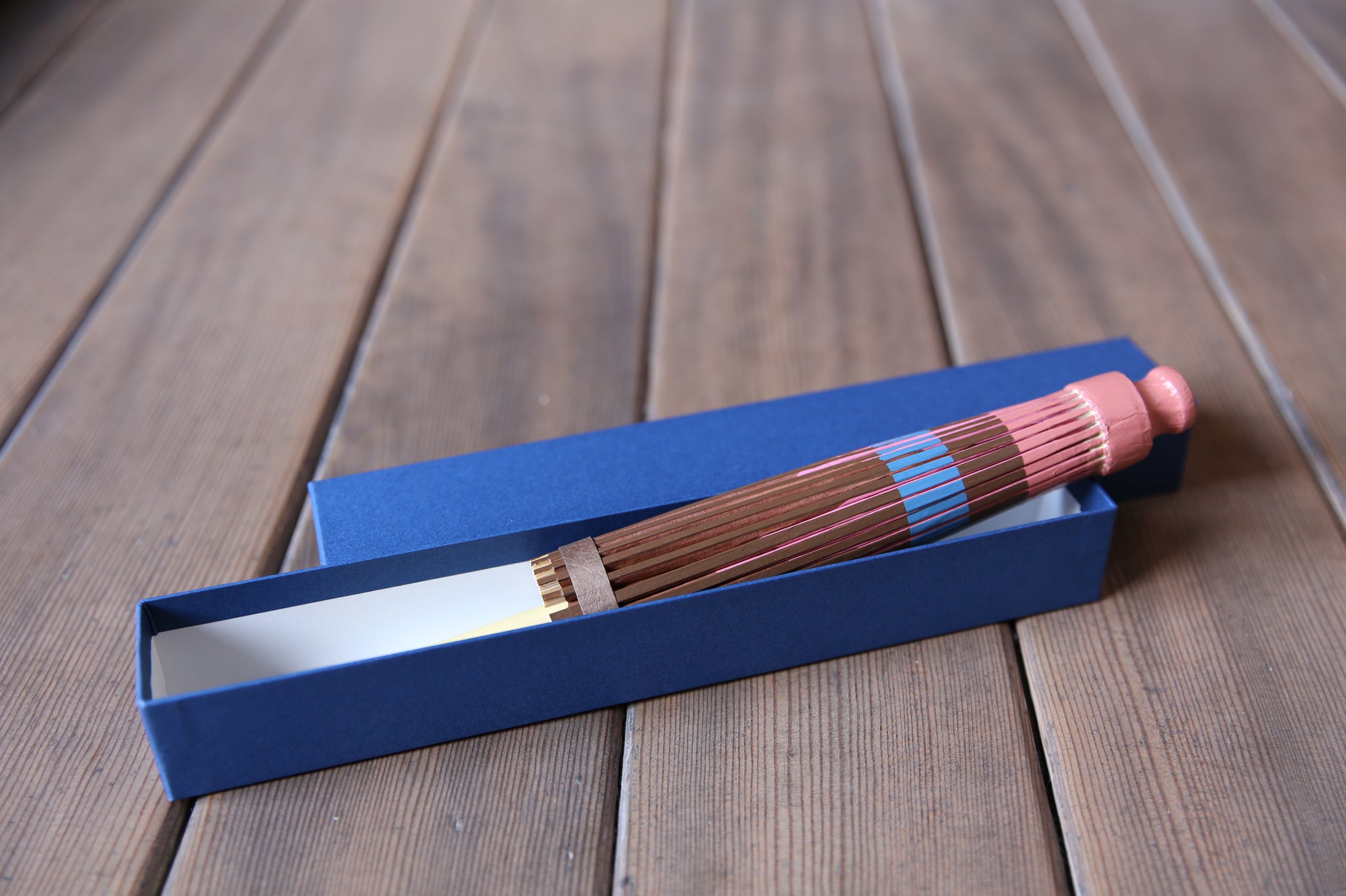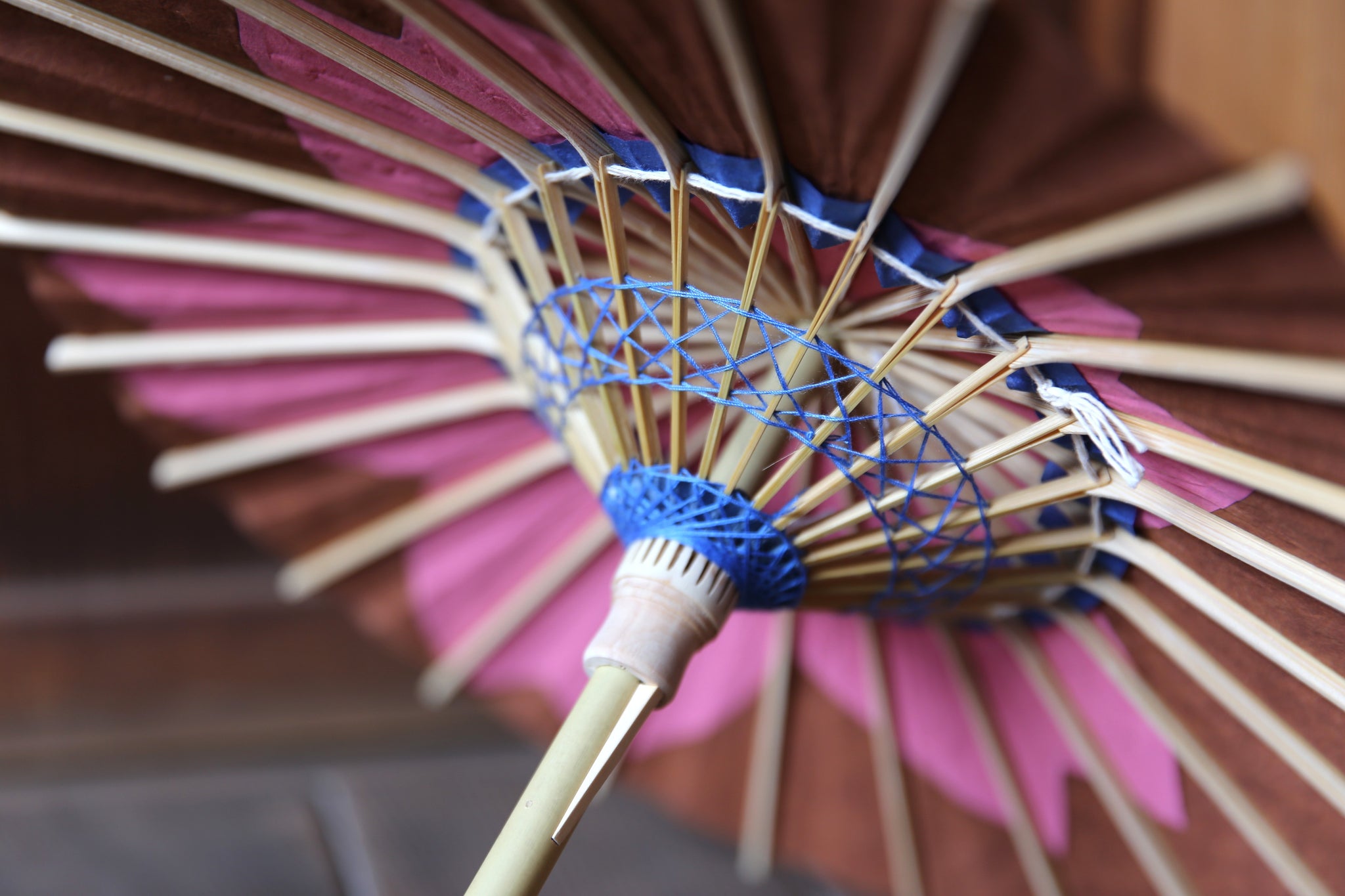 和傘の骨組みは、1本の竹を均等に割り、傘を畳んだ際に元の竹に戻るように組まれています。