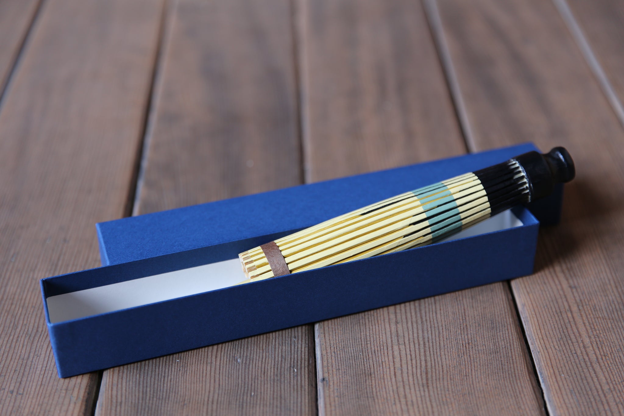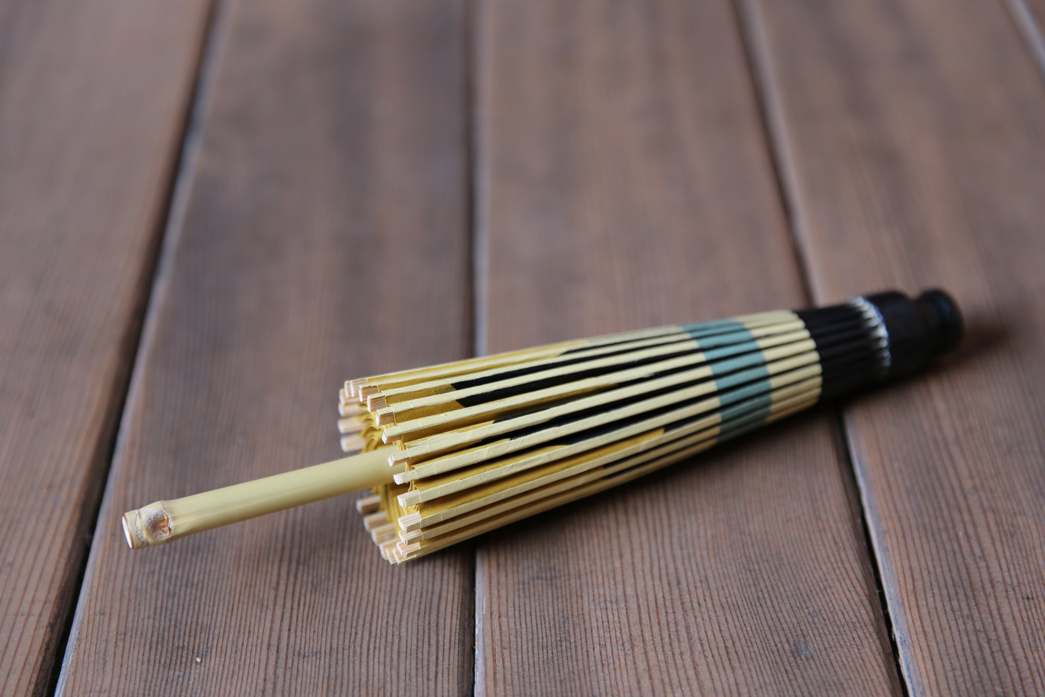 和傘の骨組みは、1本の竹を均等に割り、傘を畳んだ際に元の竹に戻るように組まれています。