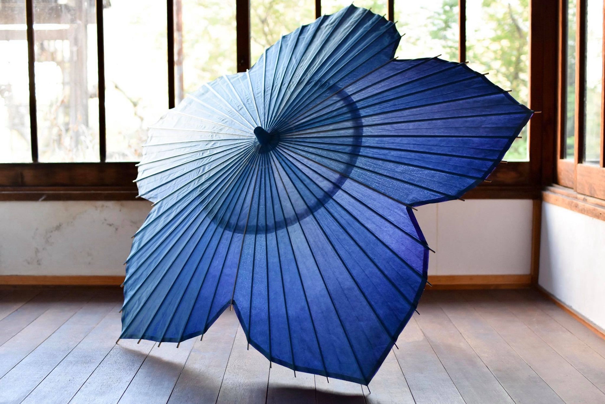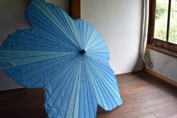 桜和傘のように花の形に切り抜きつつも、そのサイズは桁違い!歌舞伎などの舞台で使うサイズの大きな傘、そして美濃和紙を手染めし、外側からは水色桔梗、内側からは紫のグラデーションを楽しめる、これ以上ない豪華な和傘です。