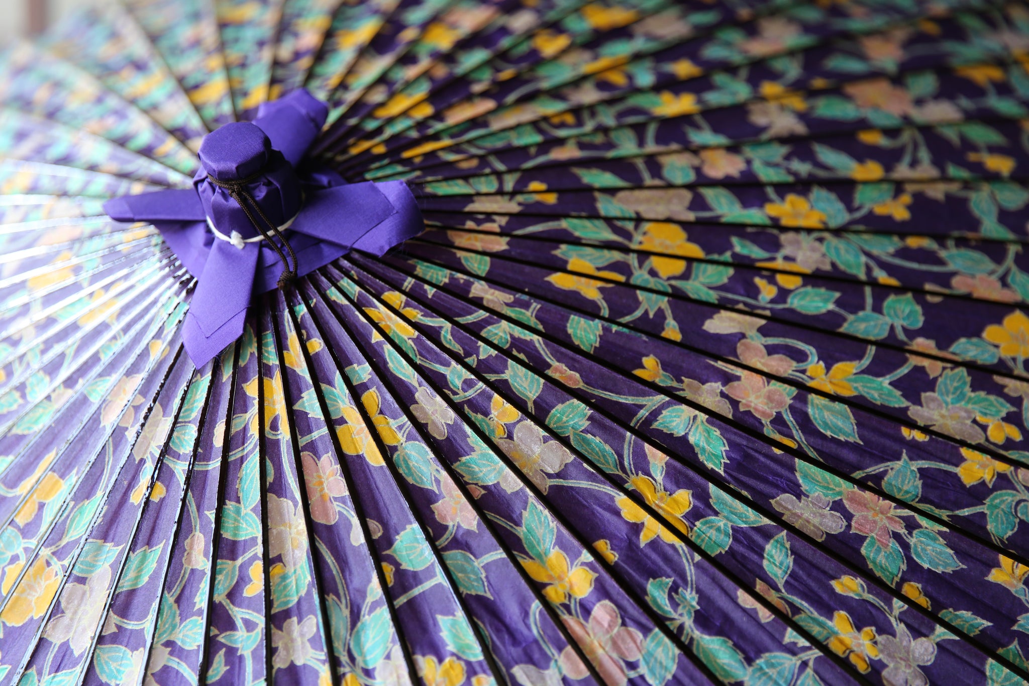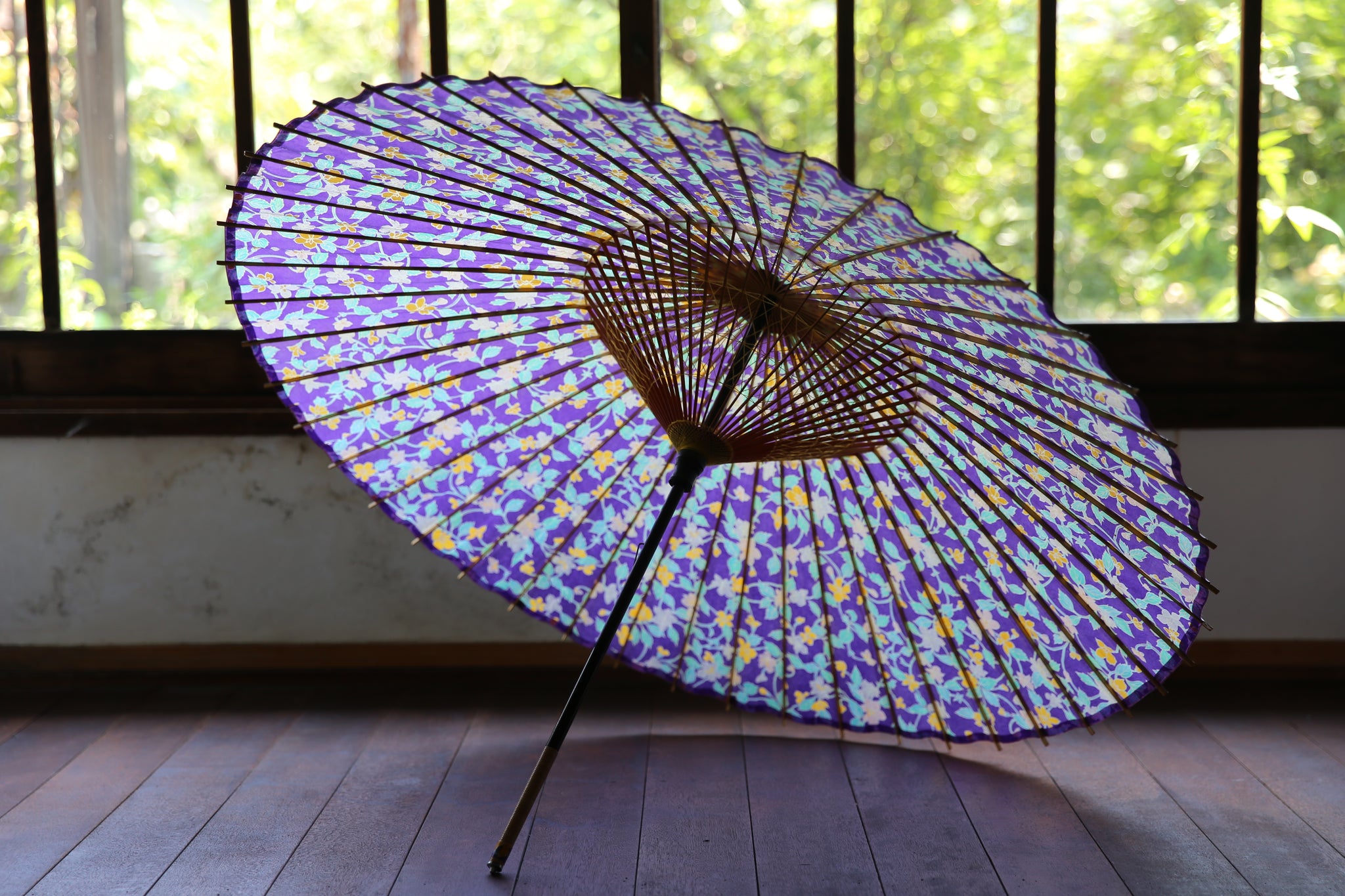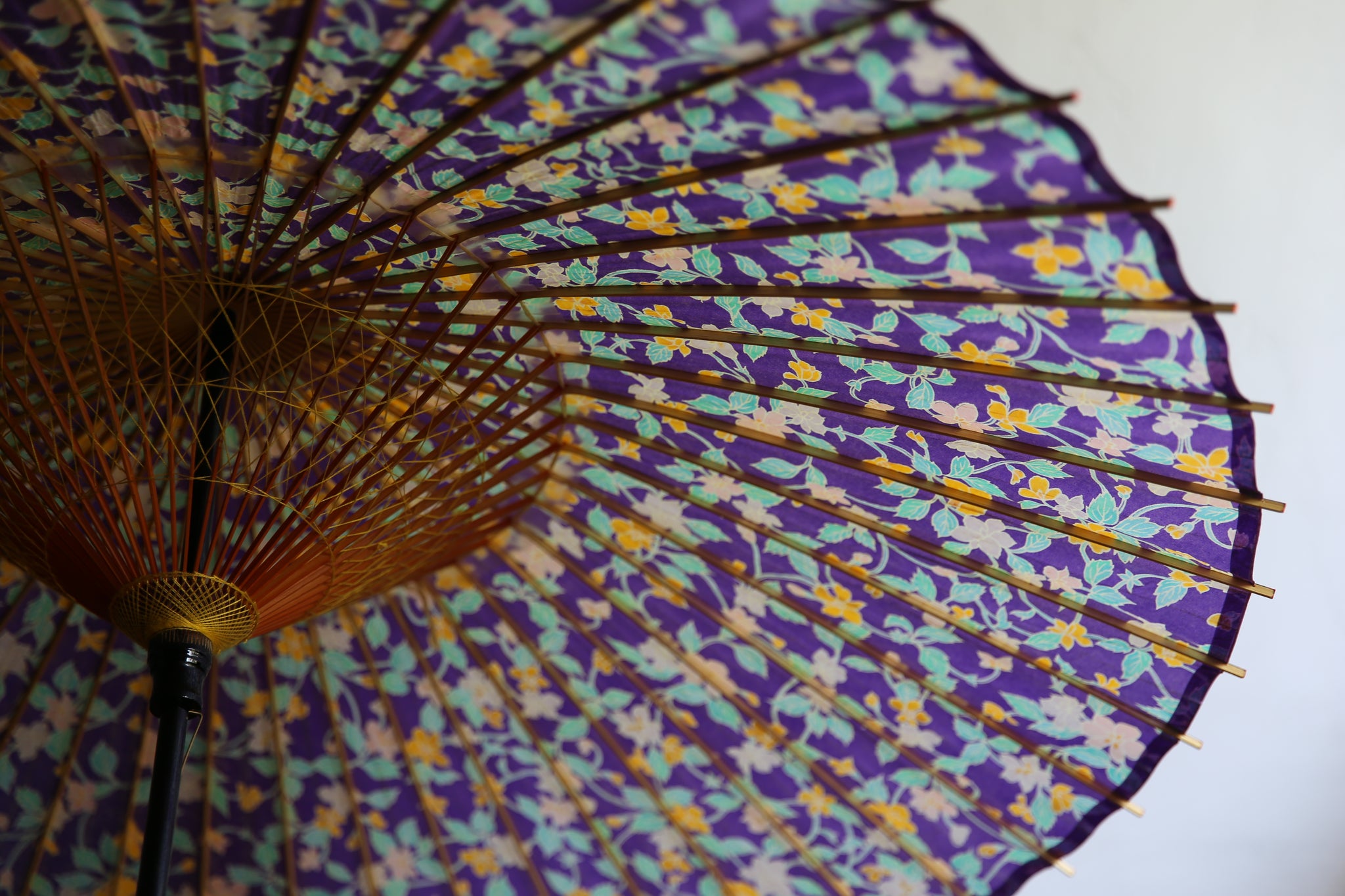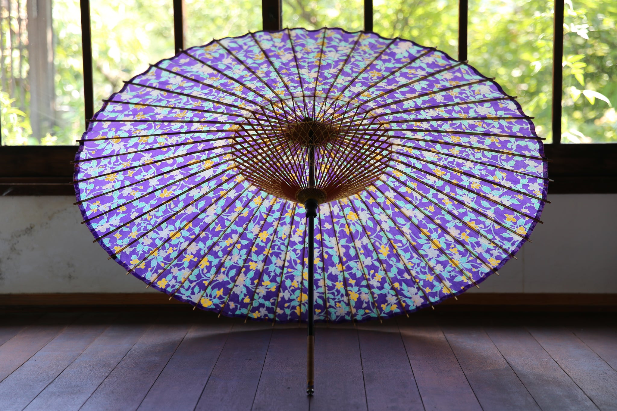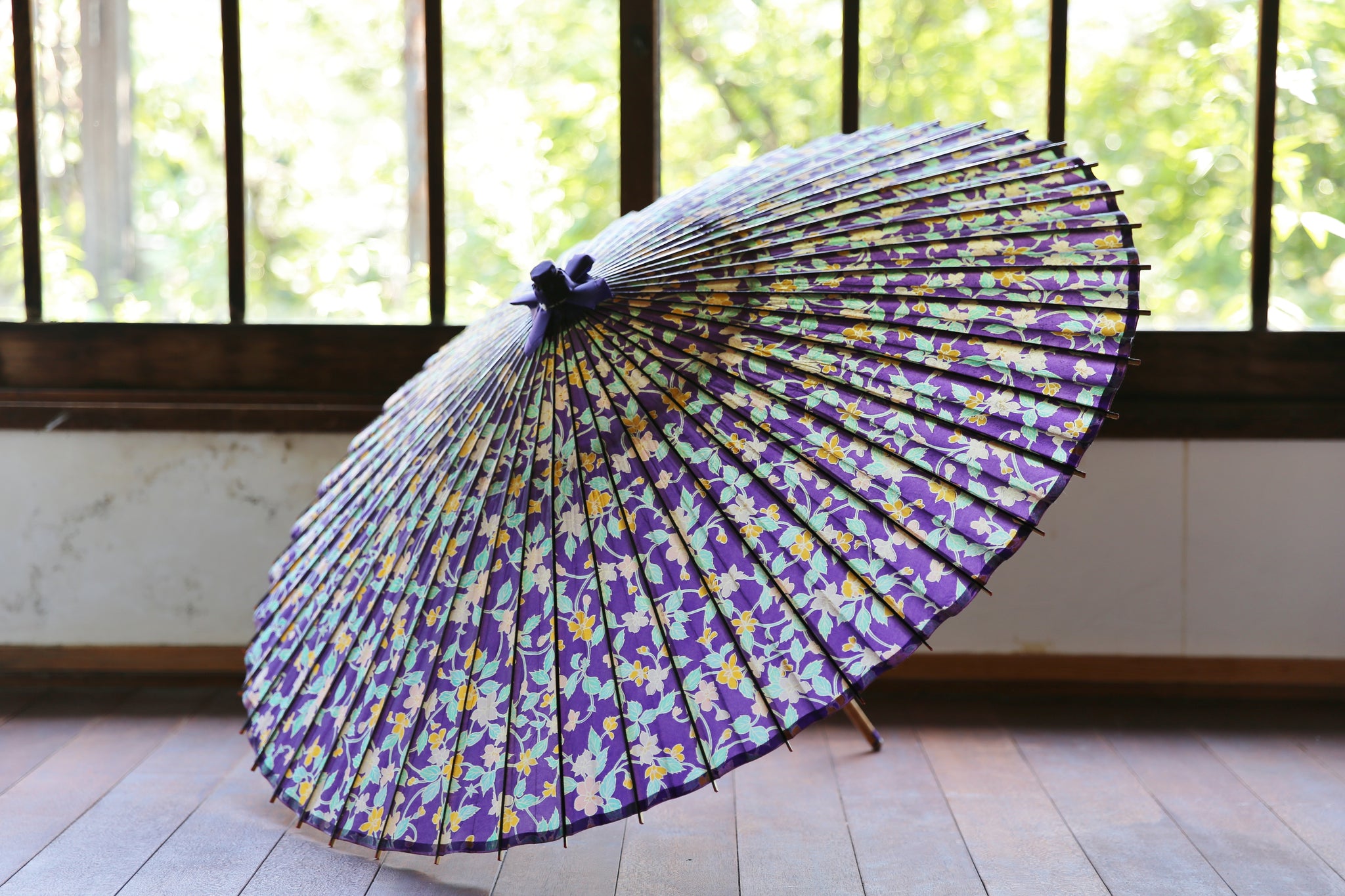モダンな花柄で、紫地に黄色やグリーンの色使いが爽やか。洋服にも合わせやすい華やかな和傘です。
