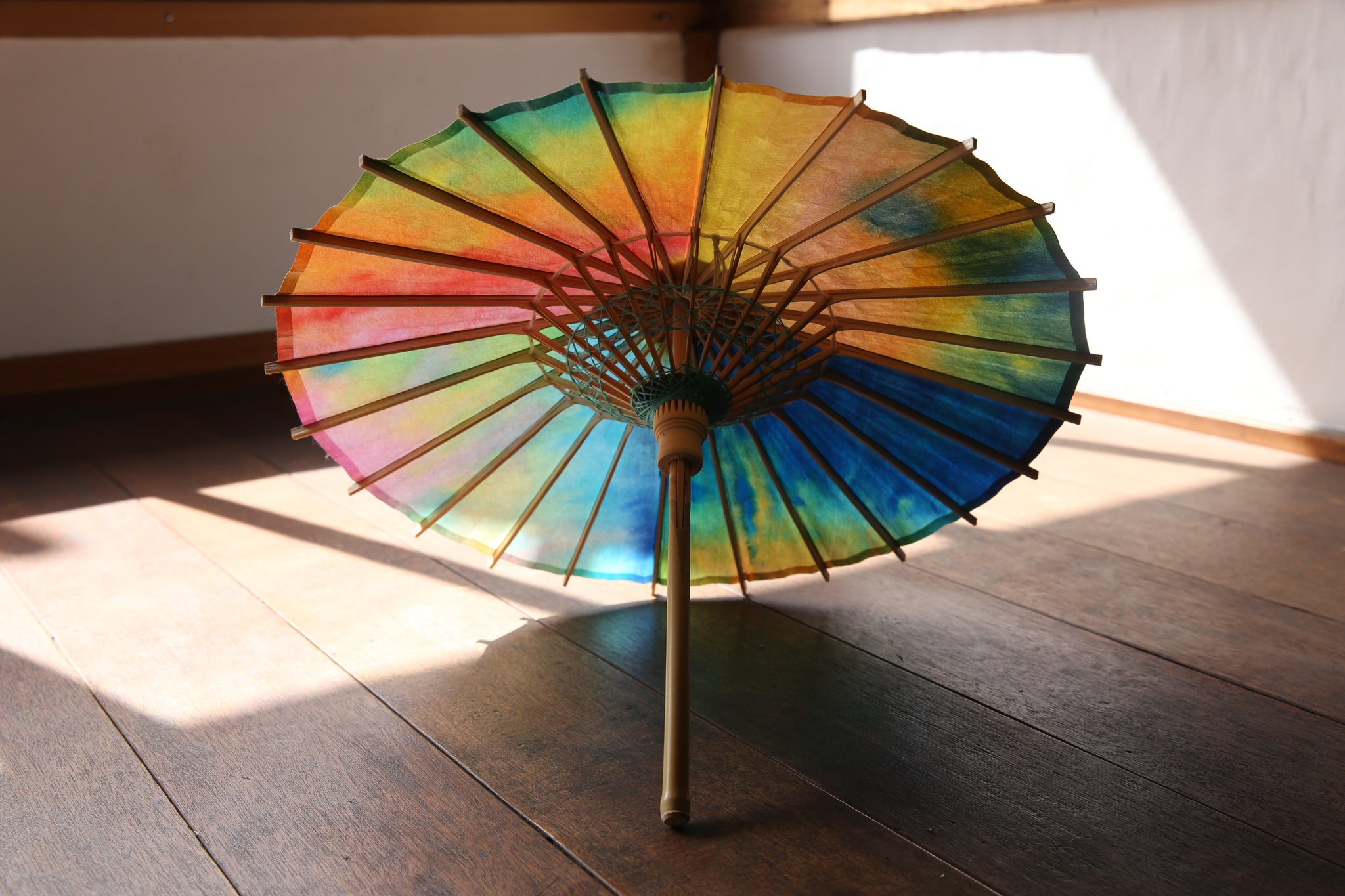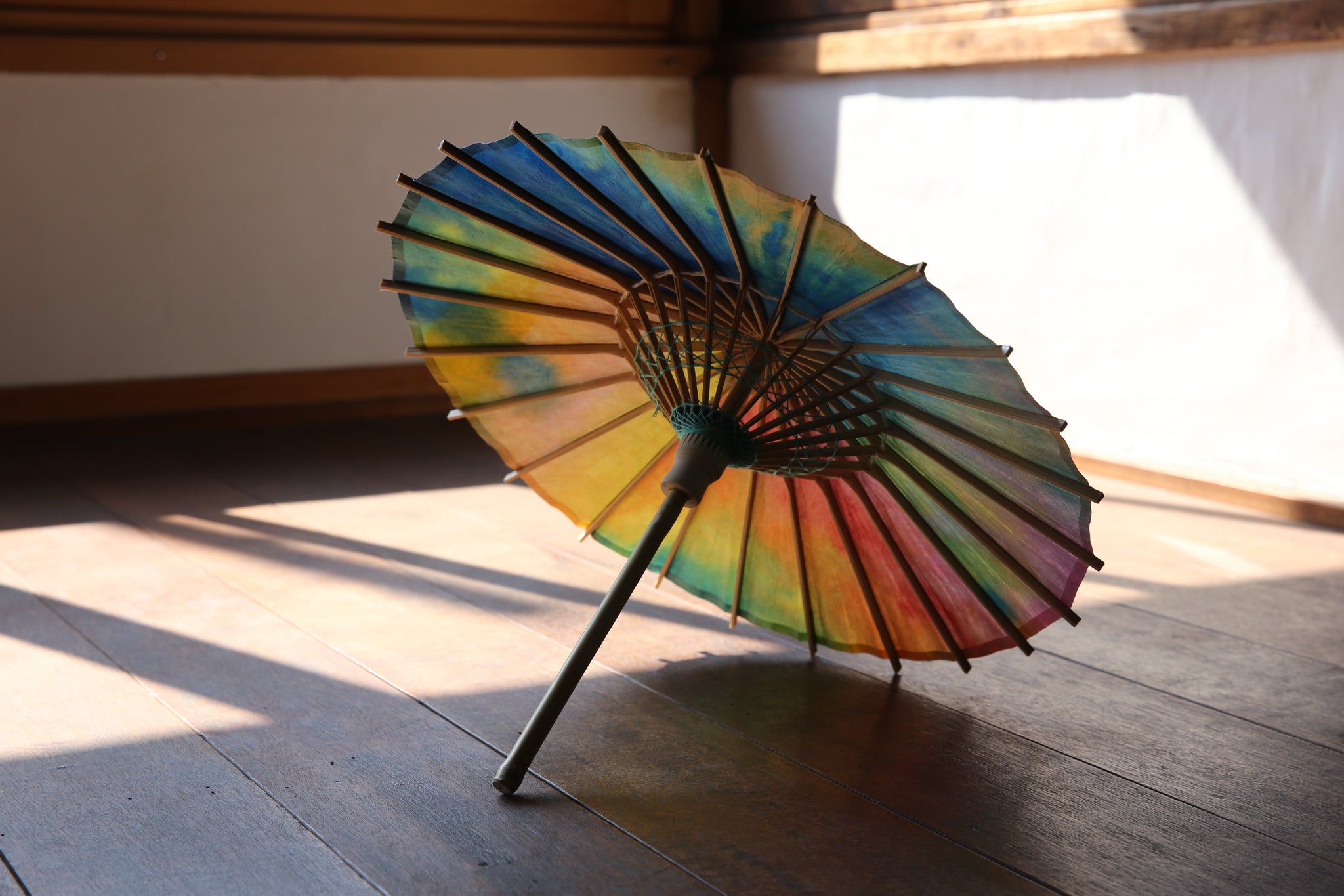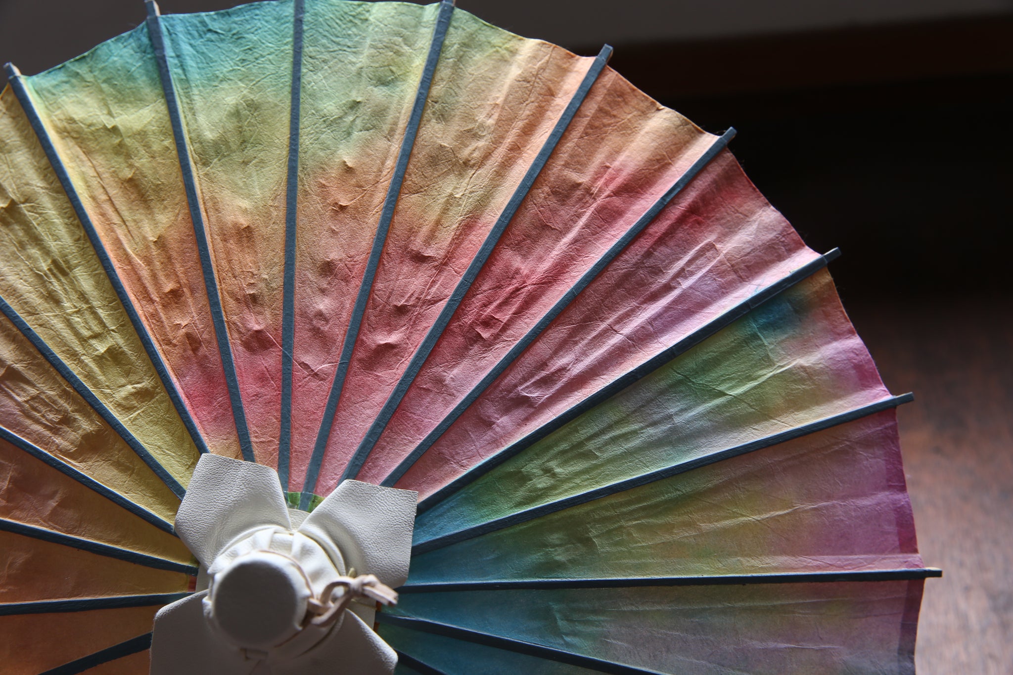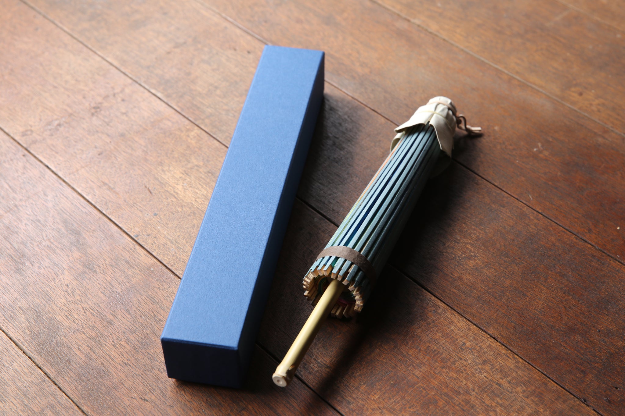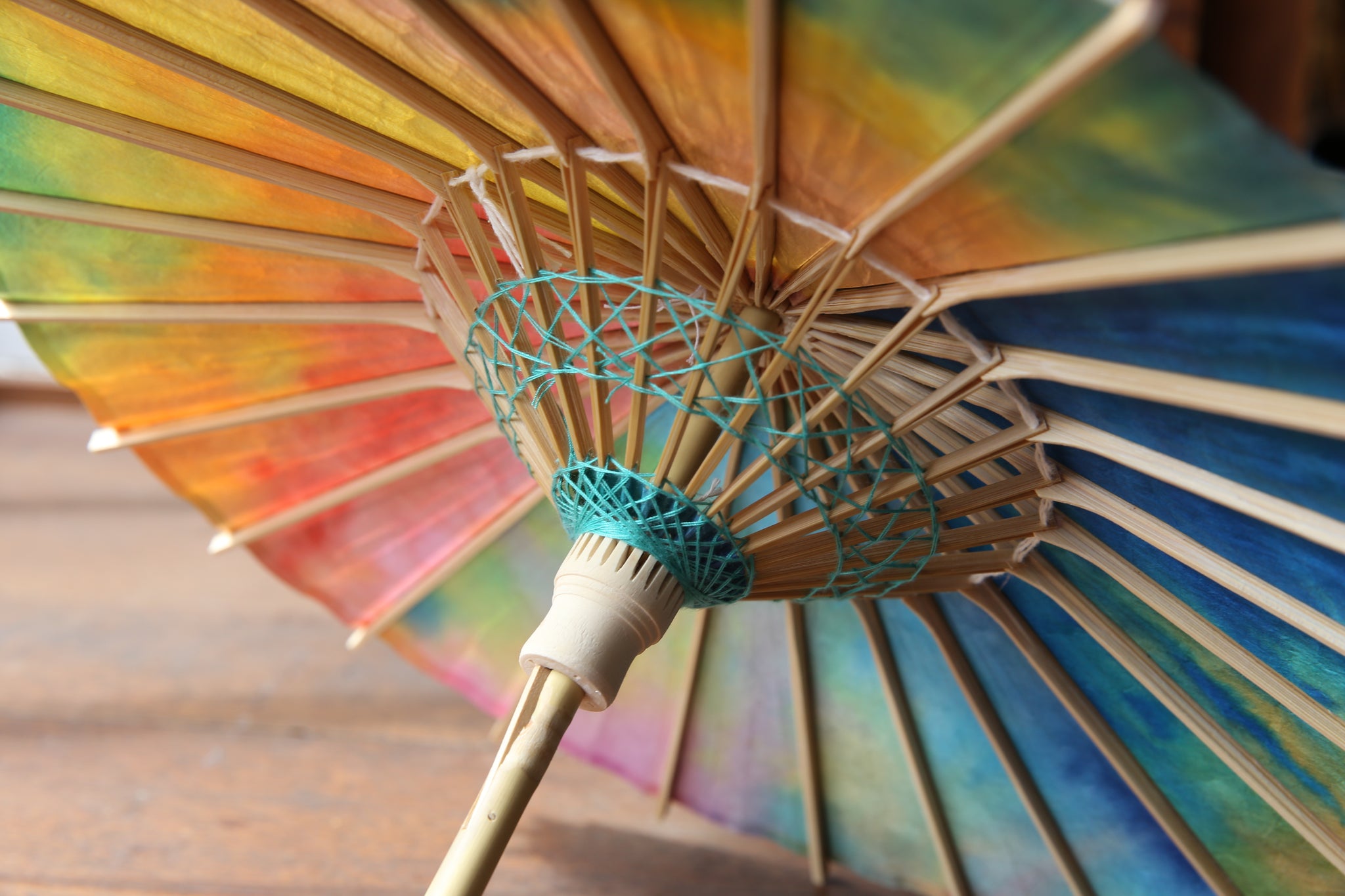 和傘の骨組みは、1本の竹を均等に割り、傘を畳んだ際に元の竹に戻るように組まれています。