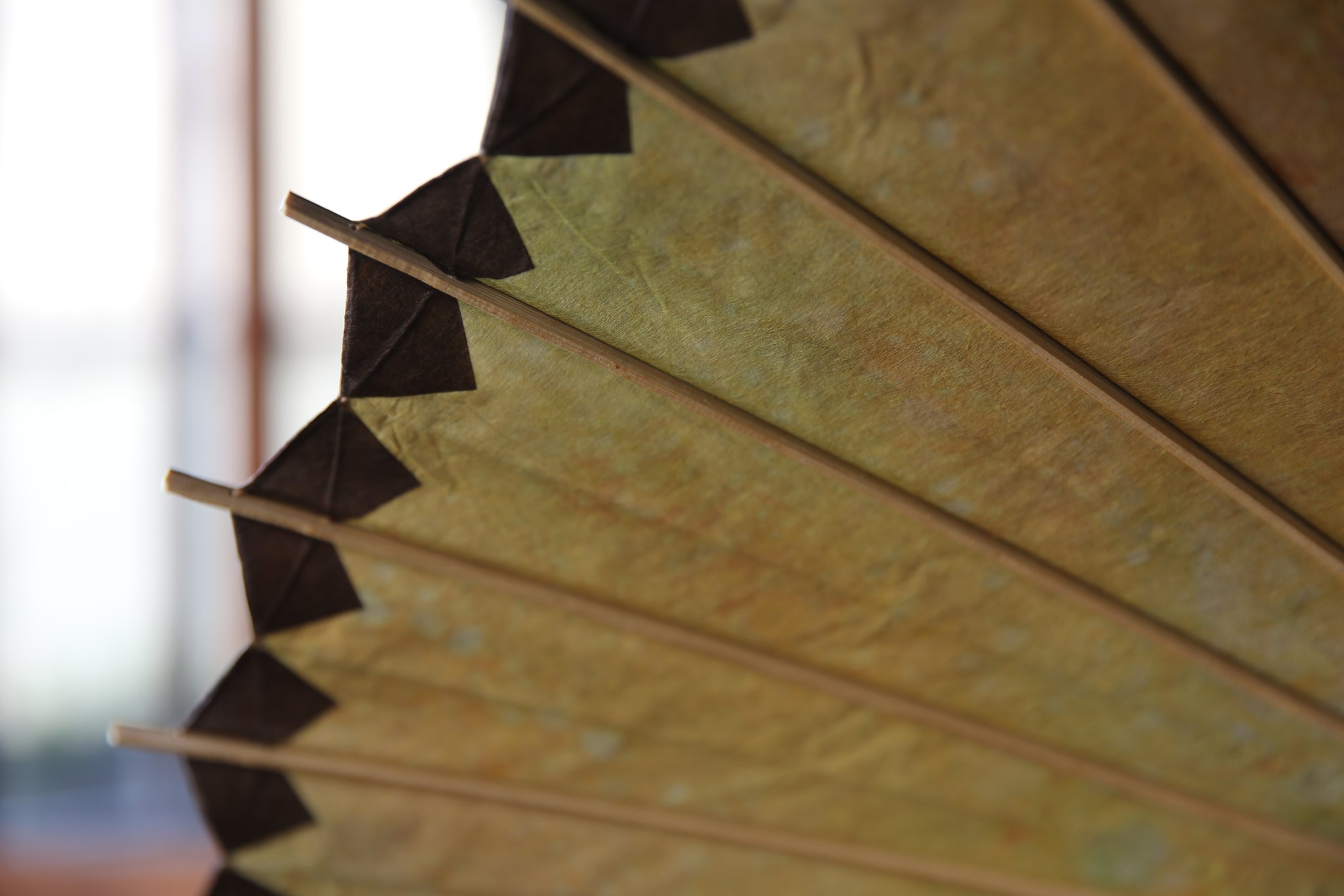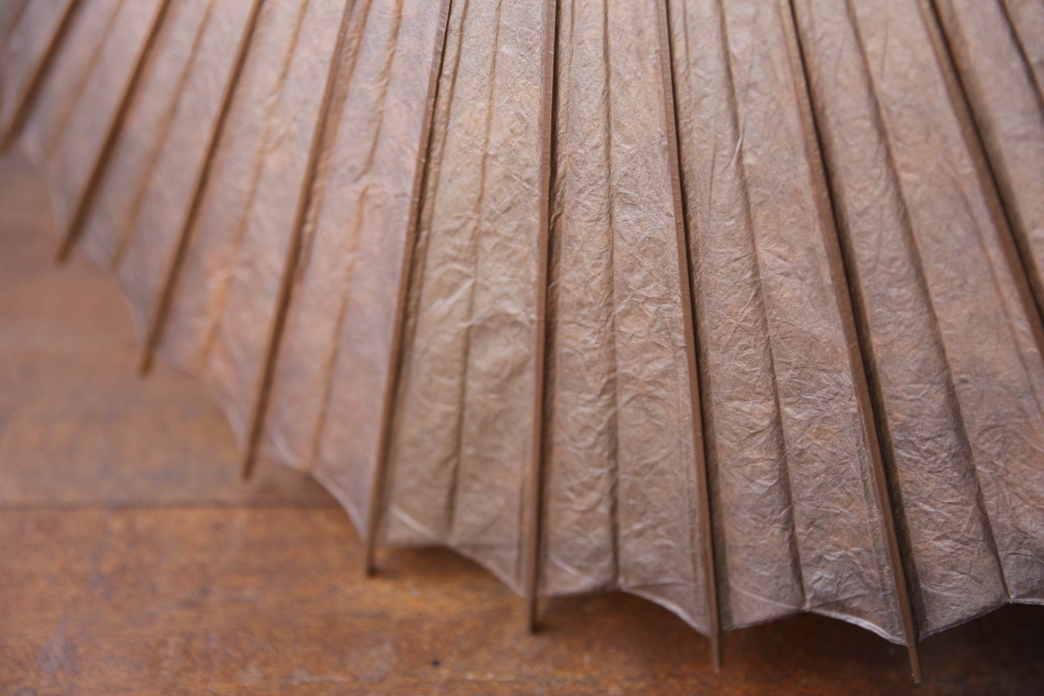 外側に使用されている柿渋染の和紙は、柿渋原液と鉄媒染を何度かムラに染め重ねることにより、さらに渋く濃い色味になります。