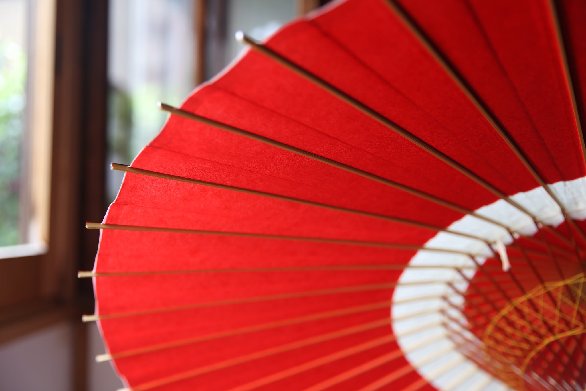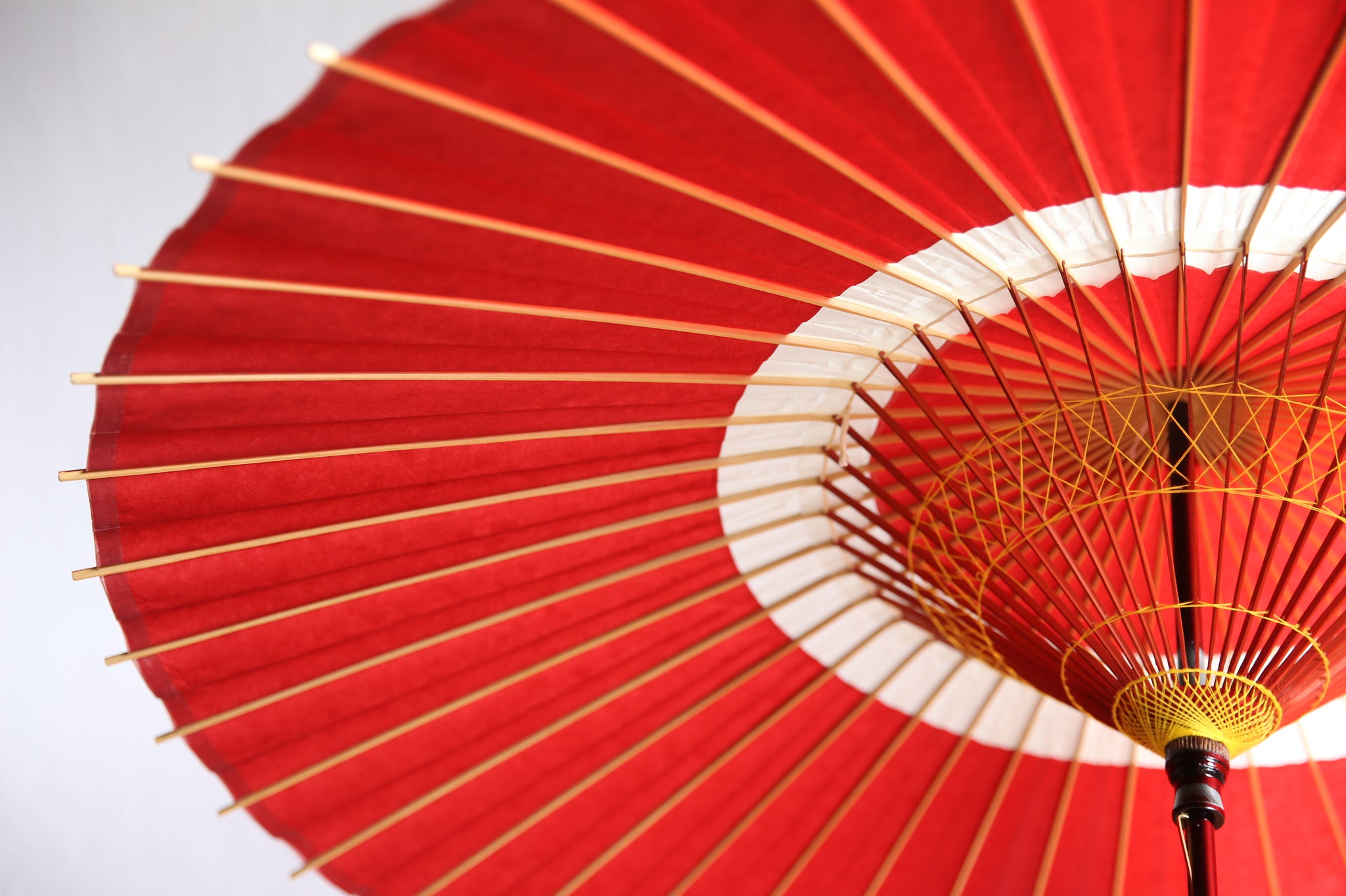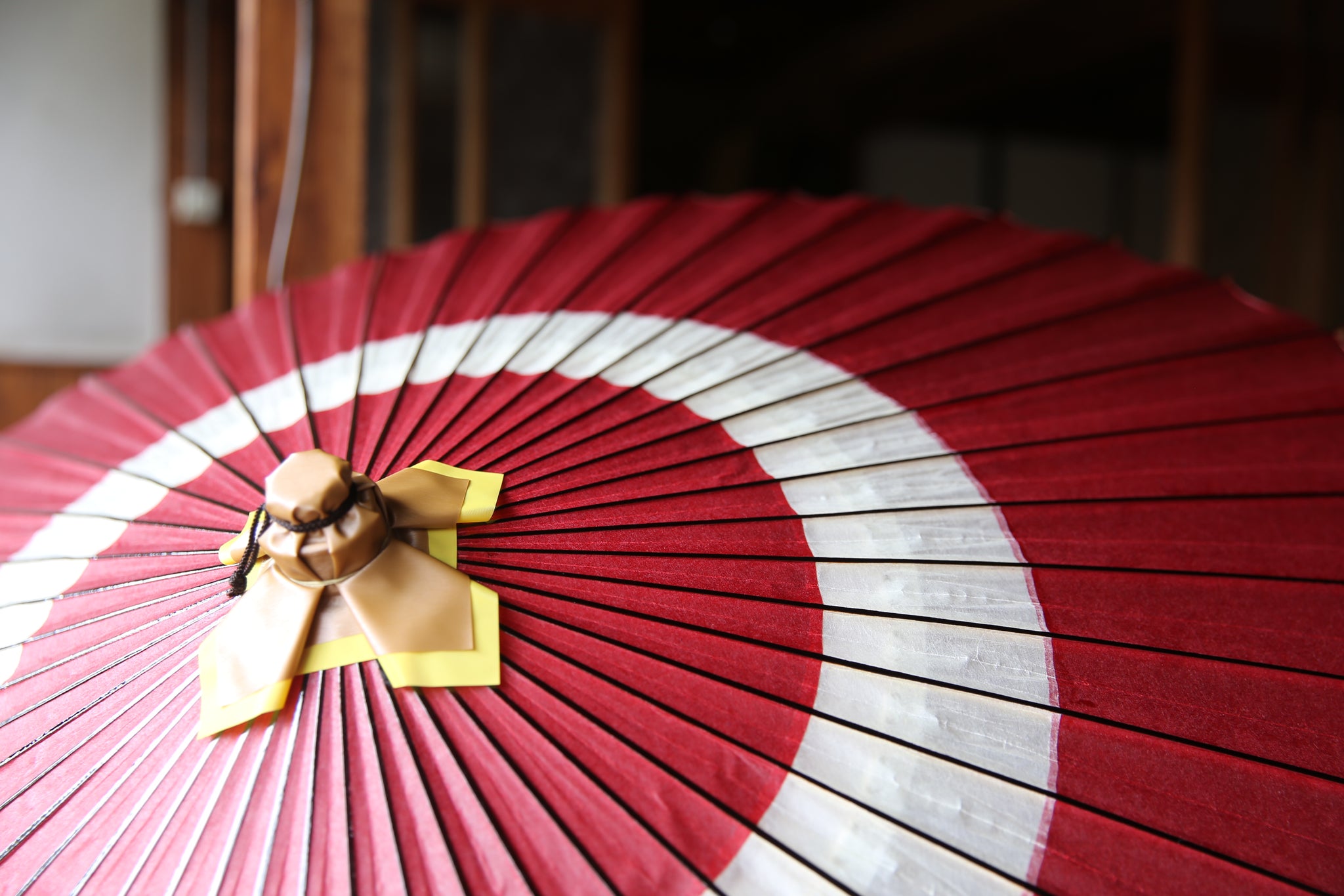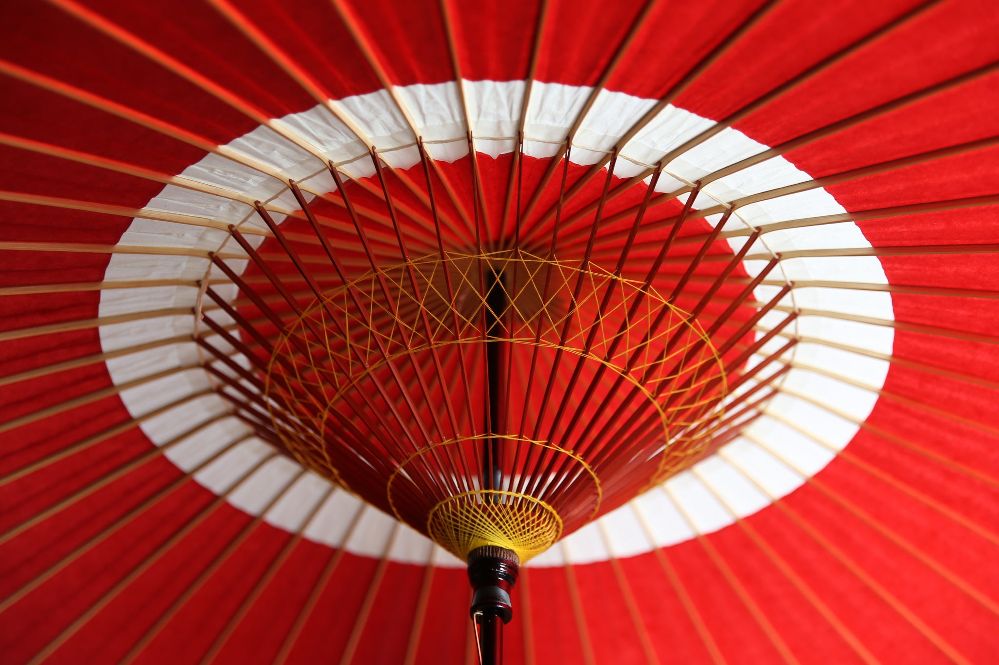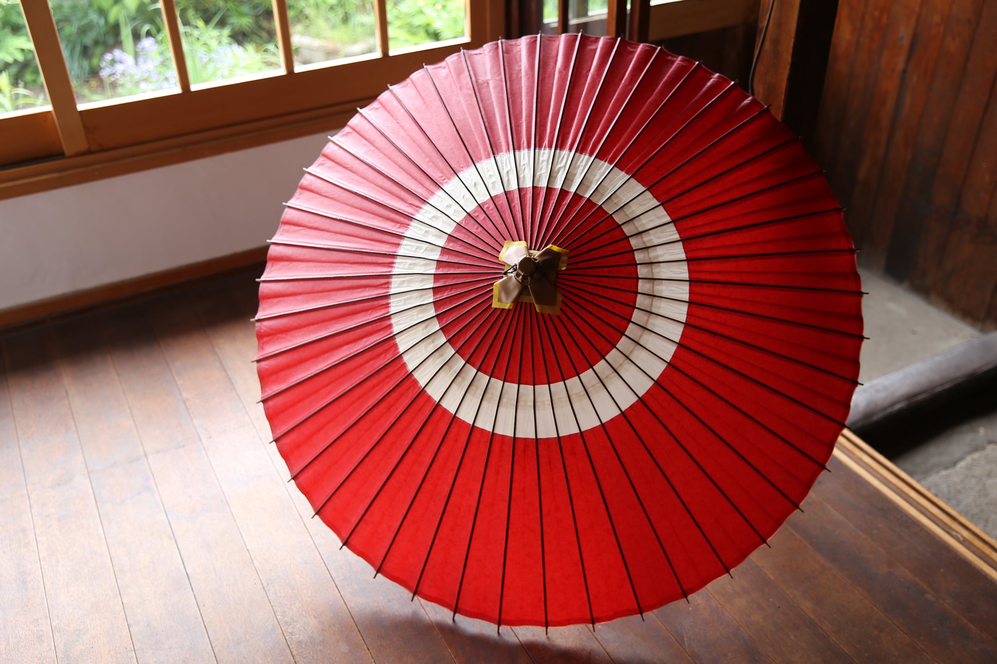 蛇の目(へびのめ)のように見えるということで「蛇の目傘(じゃのめがさ)」の名前の由来になった伝統的な張り方の和傘。