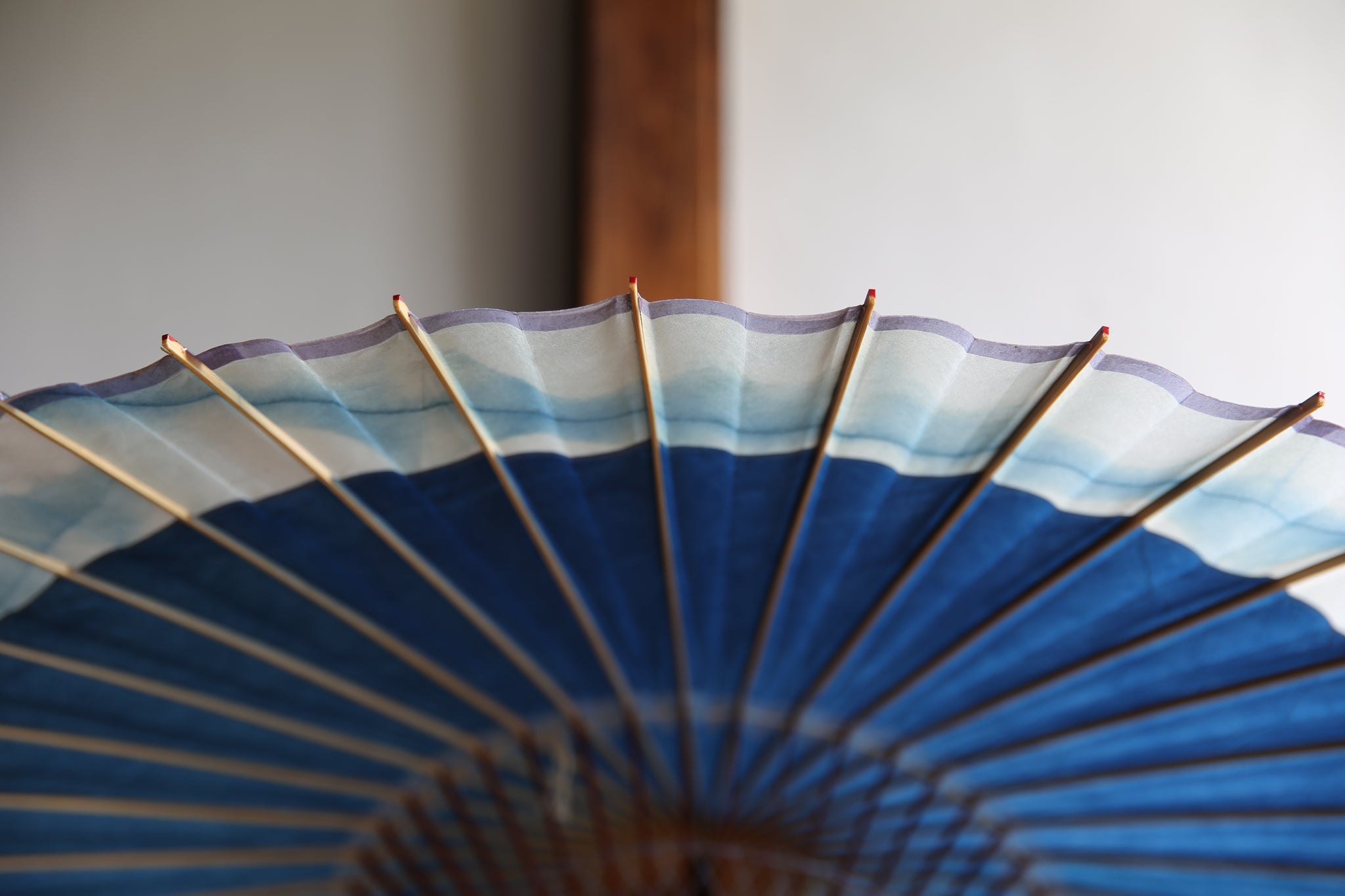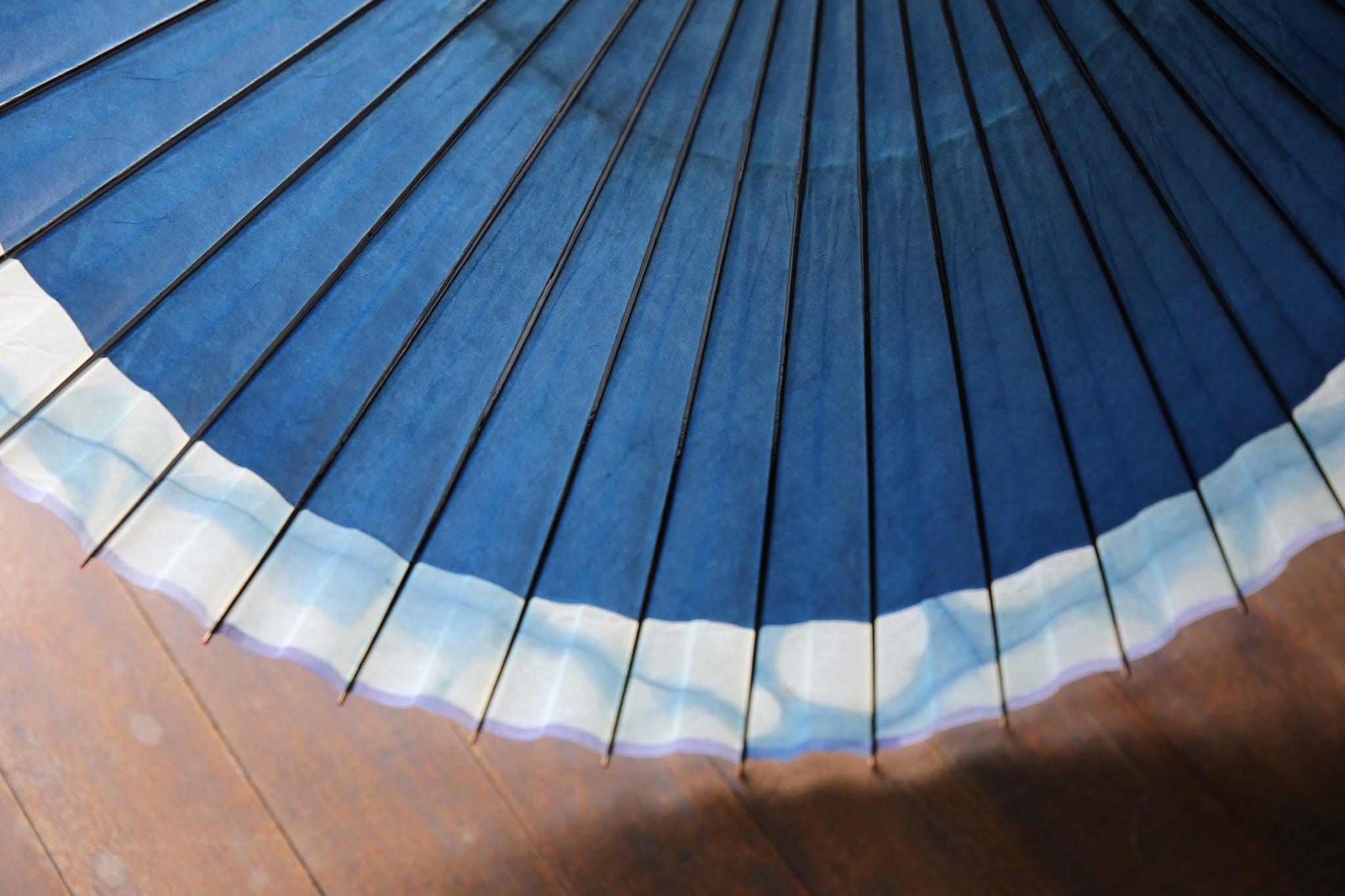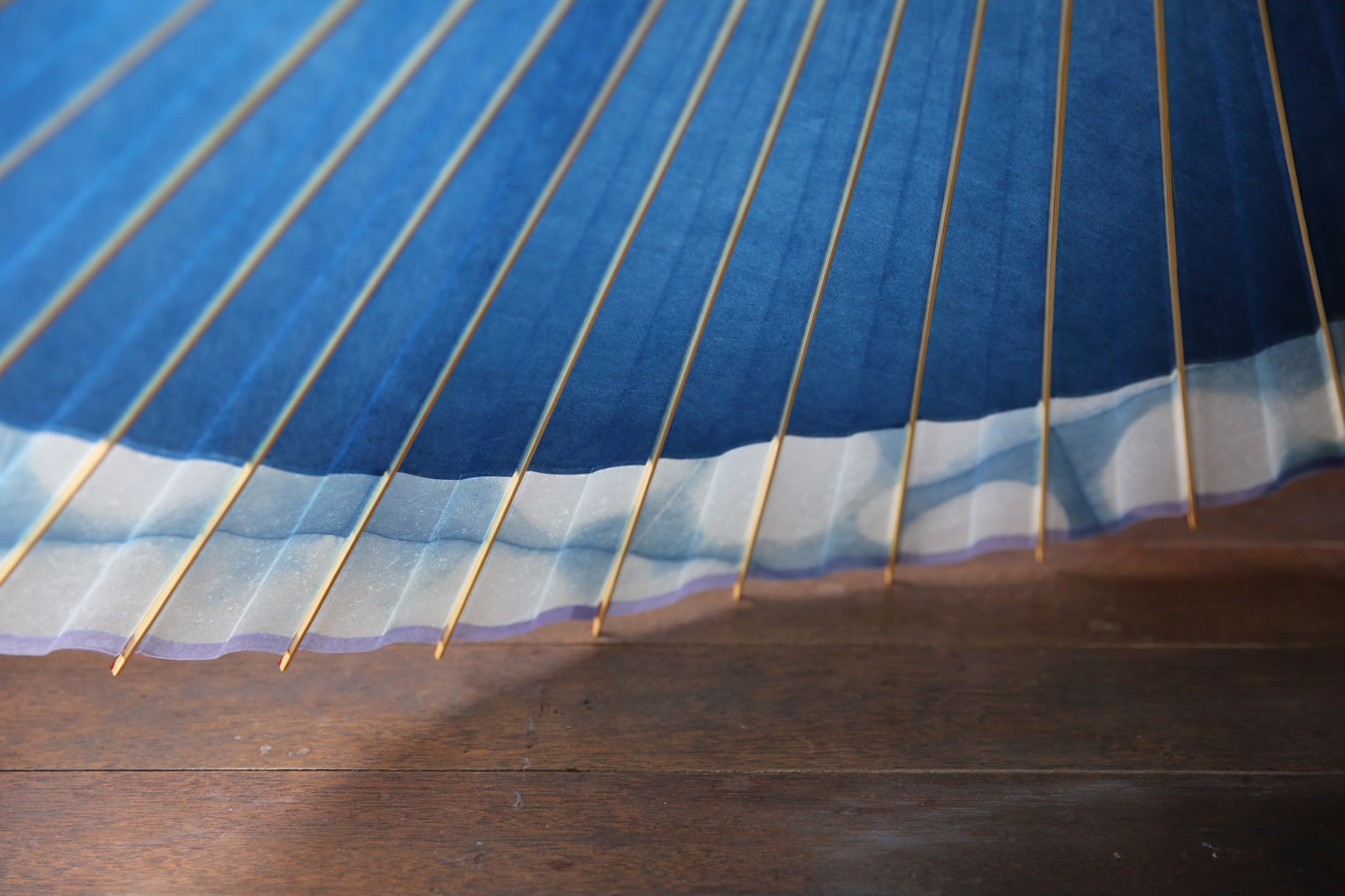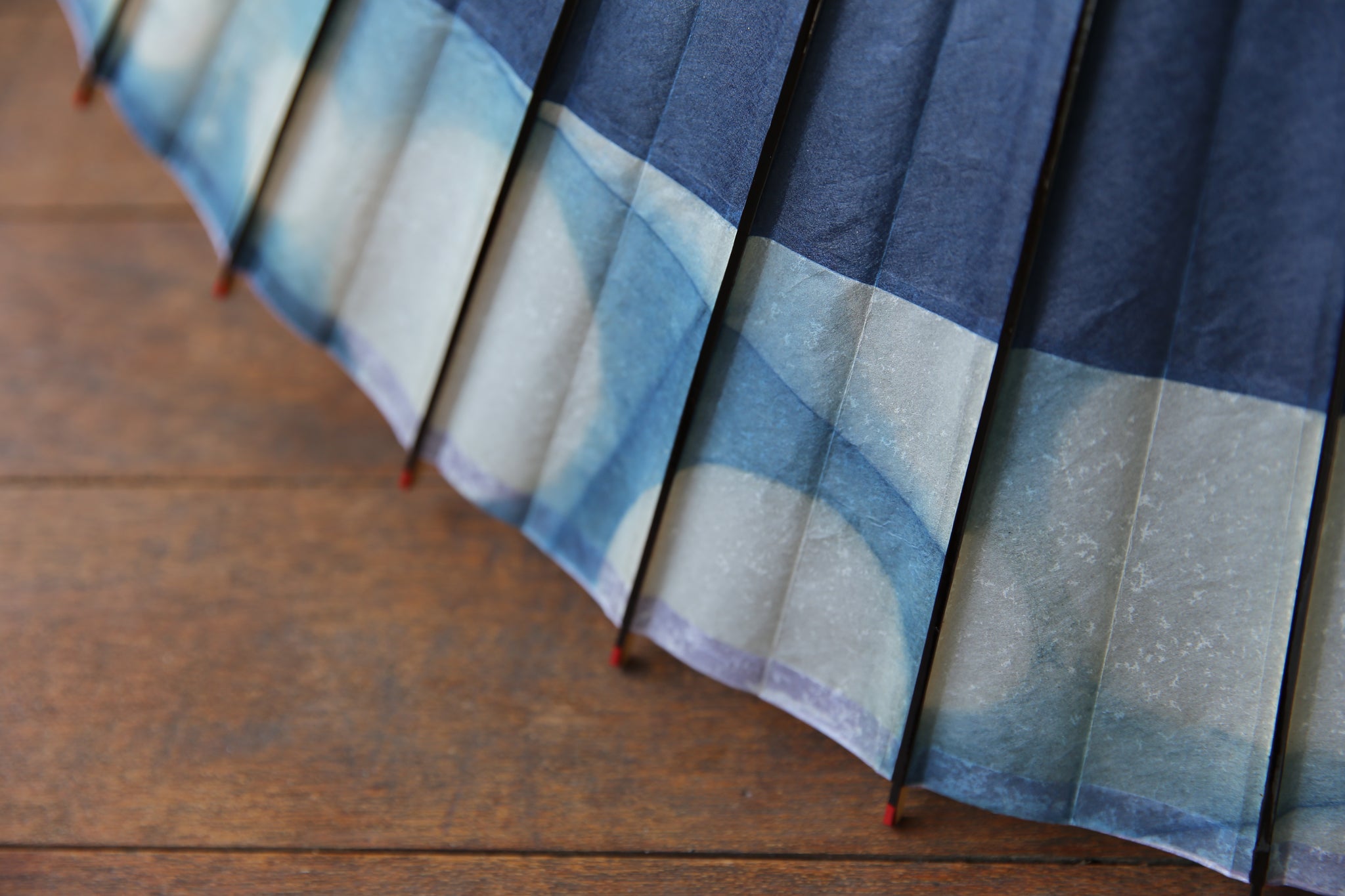 2022年に岐阜の石徹白で育った藍で染められた美濃手漉き和紙を、和傘に仕立てた紛れもなく一点もののスペシャルコラボ和傘。