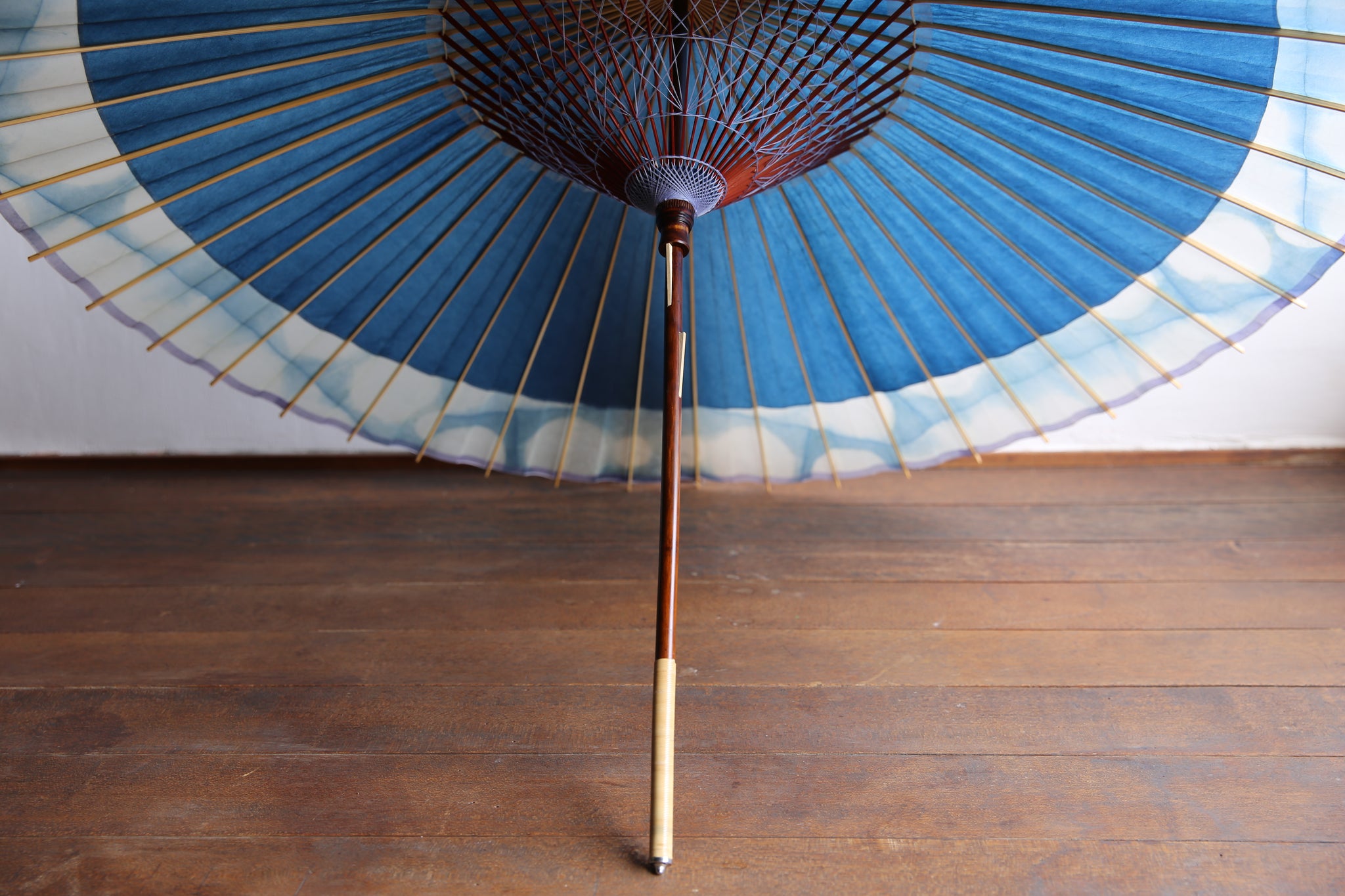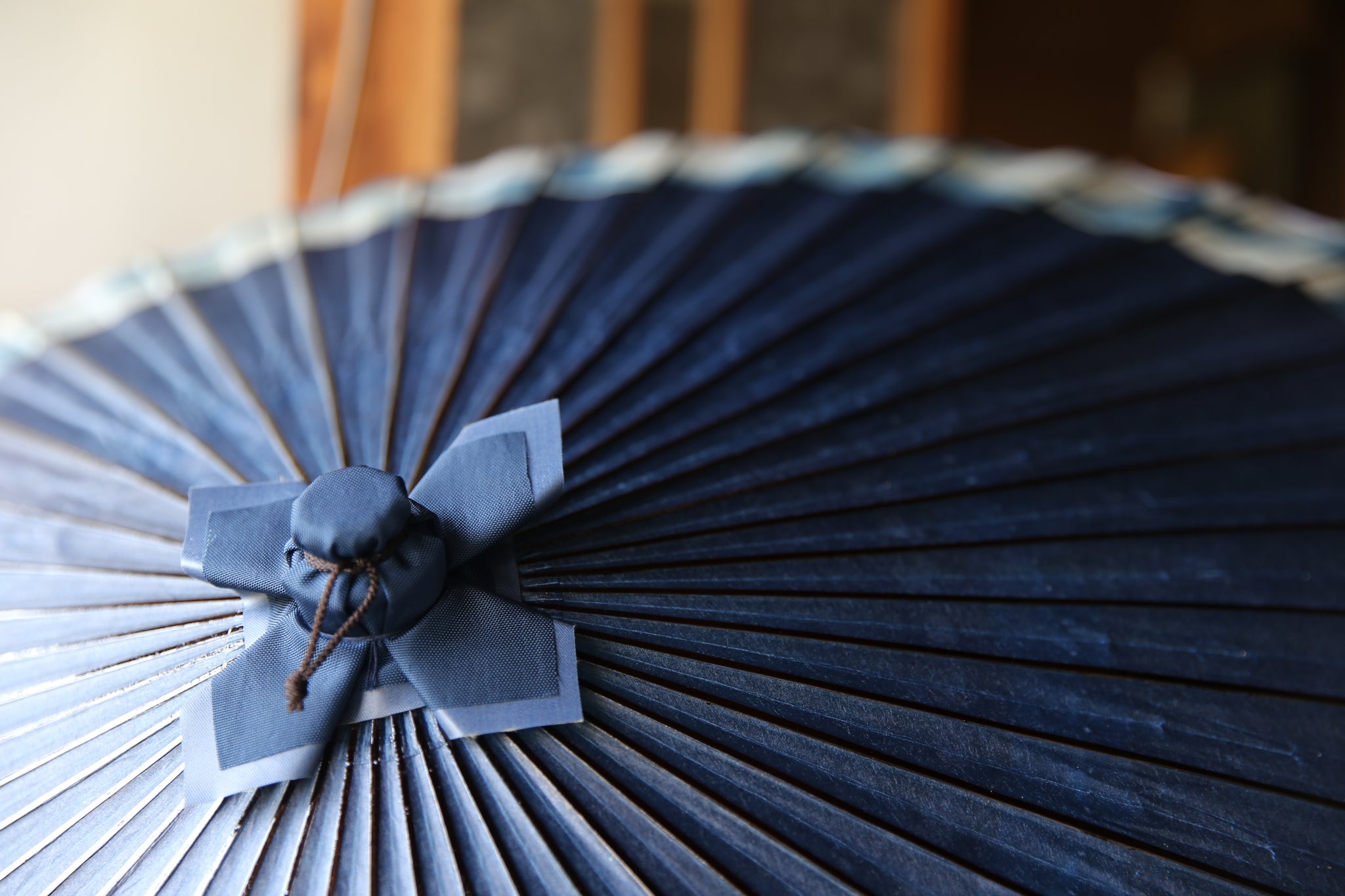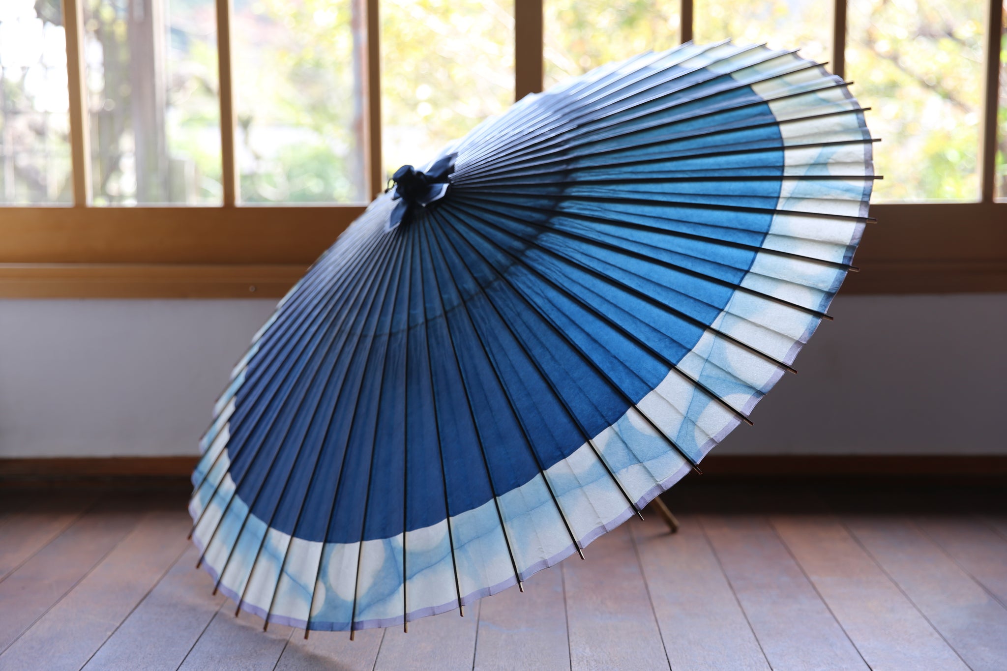 2022年に岐阜の石徹白で育った藍で染められた美濃手漉き和紙を、和傘に仕立てた紛れもなく一点もののスペシャルコラボ和傘。