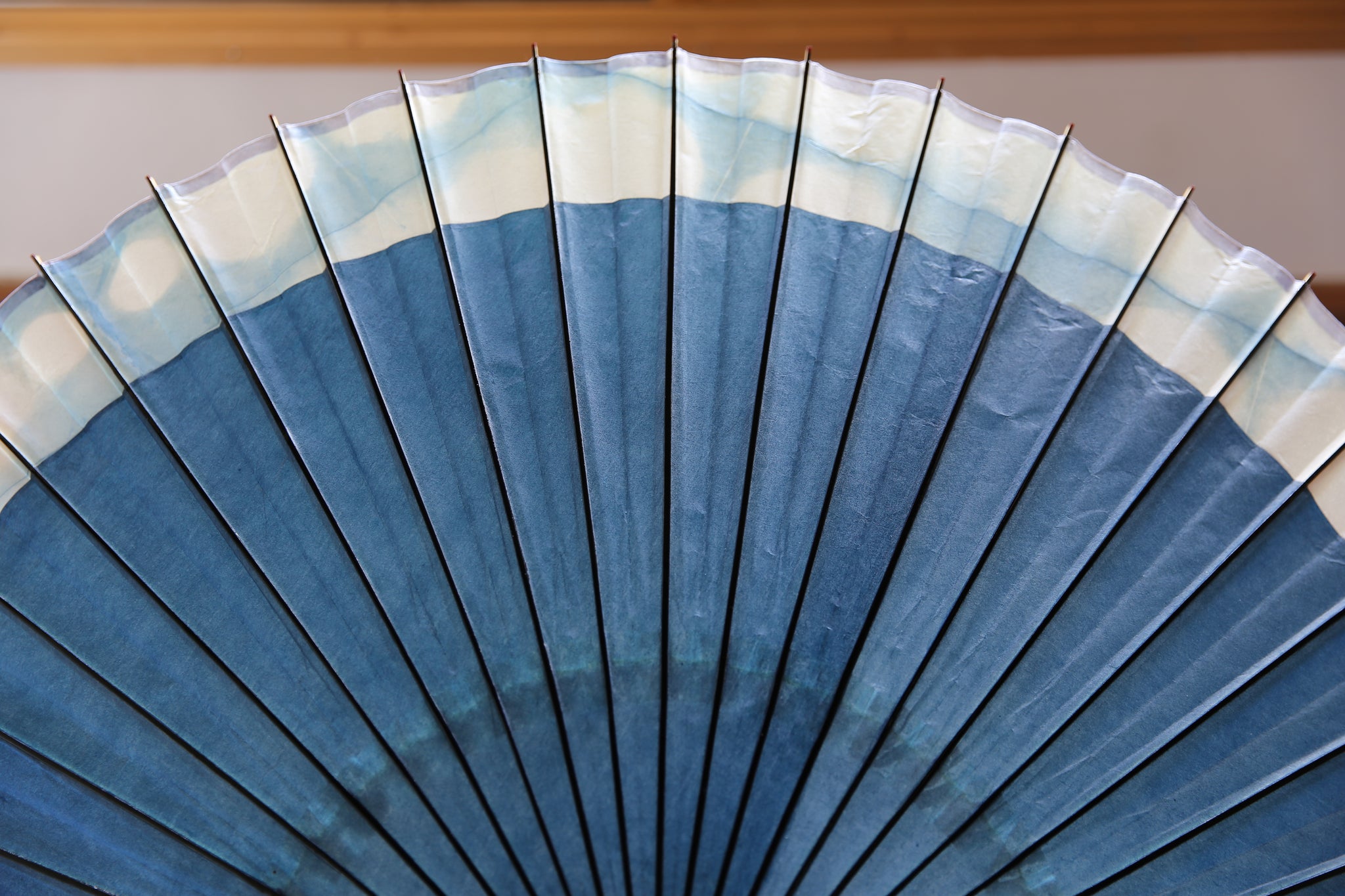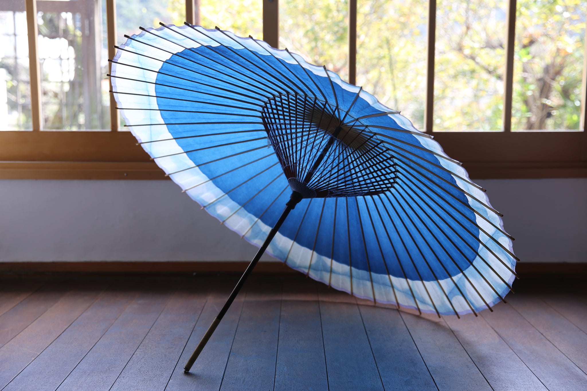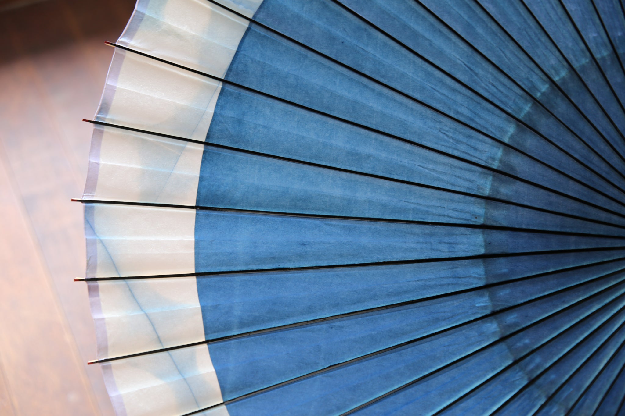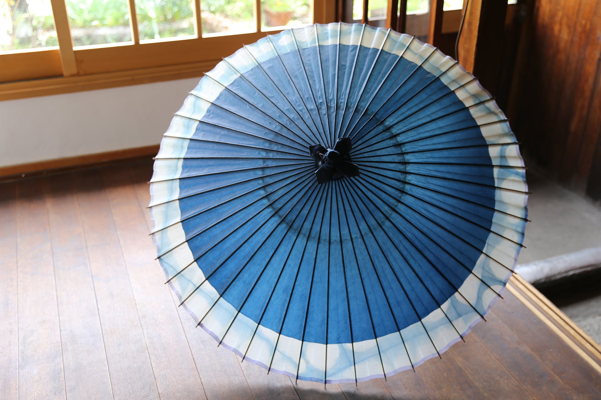 2022年に岐阜の石徹白で育った藍で染められた美濃手漉き和紙を、和傘に仕立てた紛れもなく一点もののスペシャルコラボ和傘。